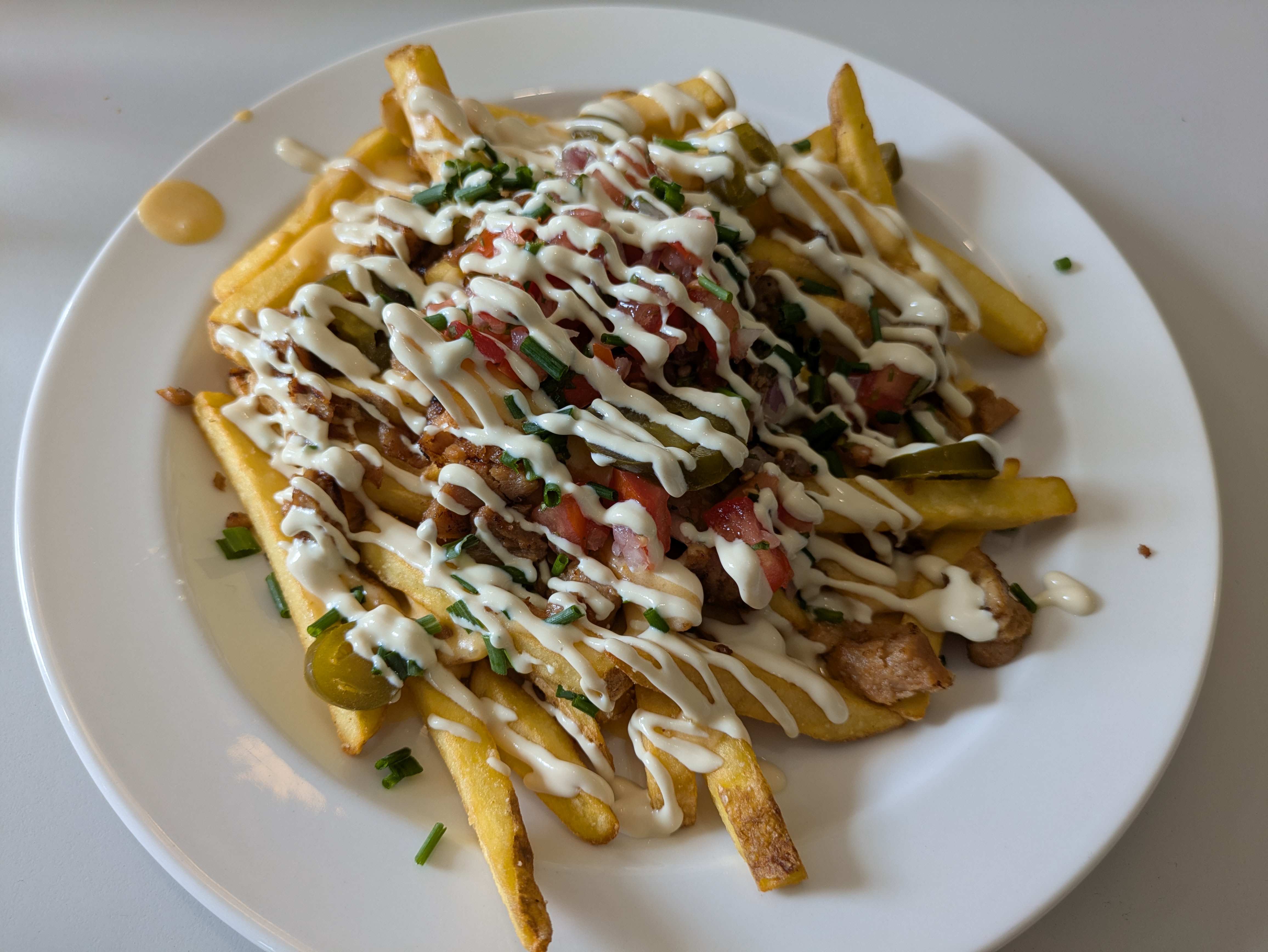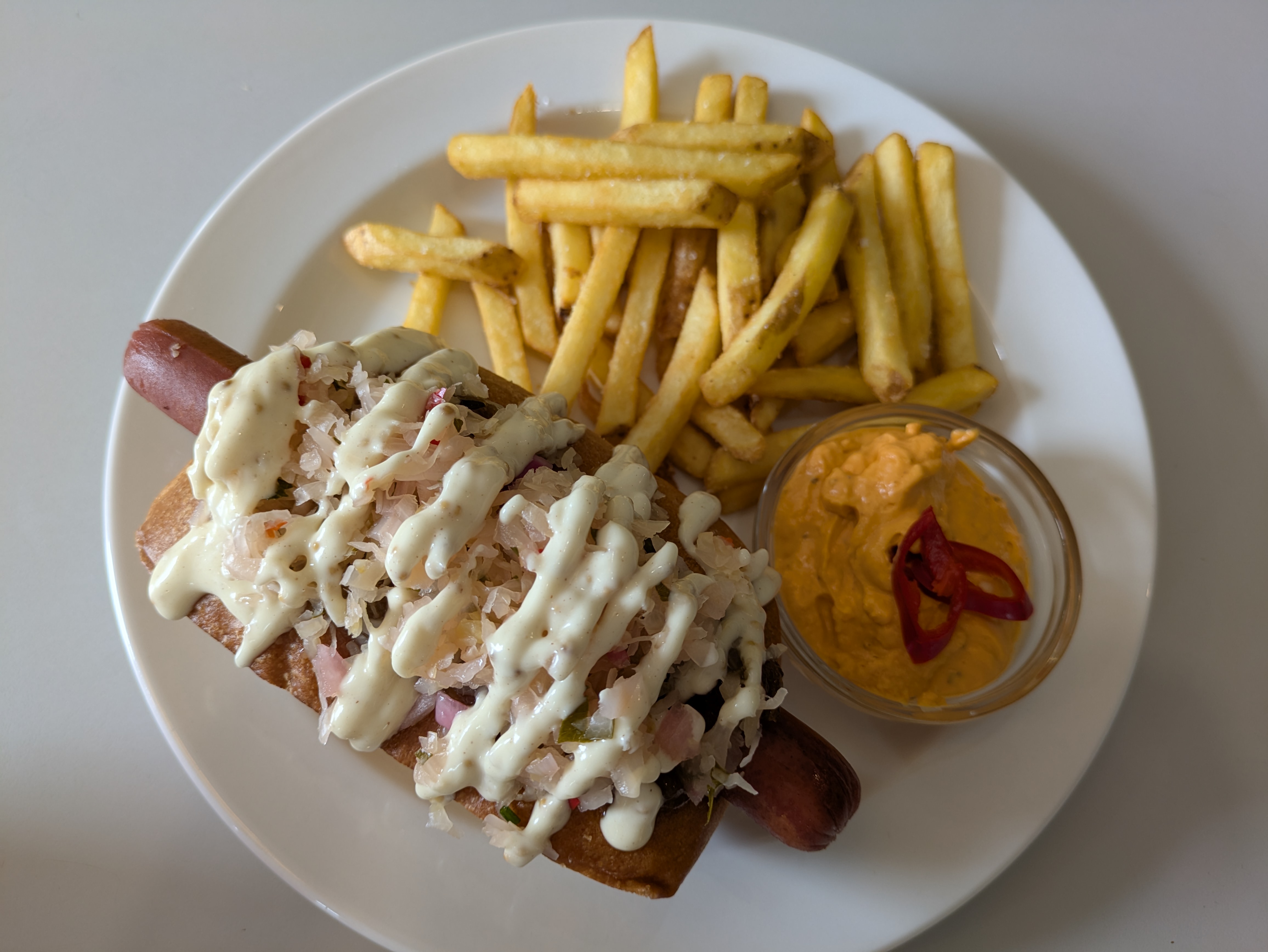 The hot dog is a bit much for me – the bread and sausage are delicious, but it’s piled high with a bit too much stuff. The flavour of the sausage gets a bit lost under all the cabbage and sauce. Additionally though, it’s just very messy to eat! Don’t order this in front of someone you’re trying to impress!