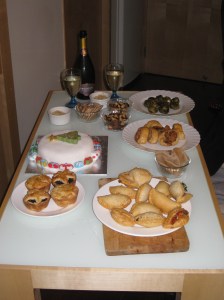 Christmas this year had many highlights – the fact that my mother flew all the way out here to keep me company in the festivities, a fine haul of gifts, some merry skype conversations with my loved ones back in the UK, and of course, plenty of good grub and booze. I put in a fair few hours in the kitchen on both Christmas Eve and the day itself, conjuring up a festive supper of nibbles (mini calzoni pizzas, spinach and feta falafel and houmous, cheesy sausage rolls, spicy nuts, mince pies) and then a two course dinner (sweet potato and cheese souffle followed by mushroom and stilton pie with mash, parsnips and cauliflower cheese). But for me, the masterpiece was the Christmas cake, made weeks ago, diligently fed with brandy, and finally covered with marzipan and iced in a team effort with my mum. It looks festive, as you can see, and the sponge is delightfully moist and tasty, full of fruit and flavour. The ultimate Christmas cake, if I do say so myself!