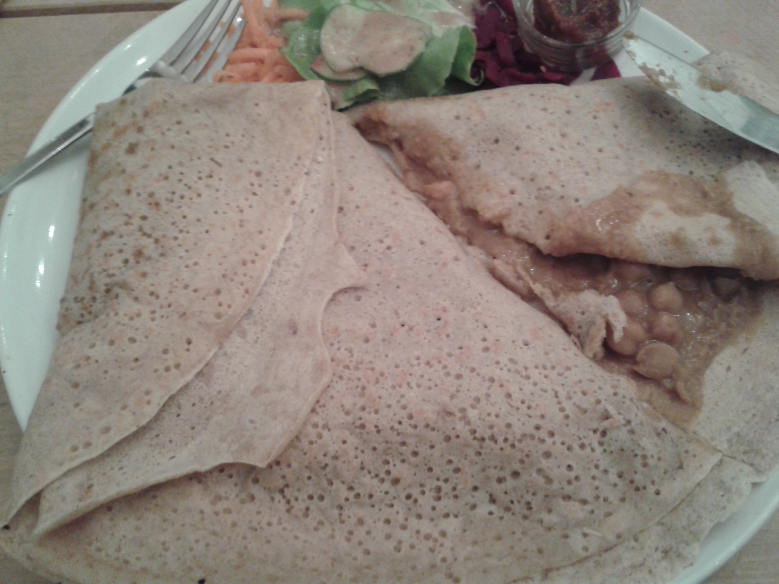 Let It Be is small but bright, and has a wall of interesting art and a shelf of vegan cookbooks to browse. They serve sandwiches, burgers and cakes, but we were all about the crepes. Each crepe on the menu is named after a famous herbivore. For my main course I was tempted to order a Woody Harrelson purely because my beau refuses to believe that he’s a vegan (how could someone as cool as Woody have anything in common with me?), but instead I went for the Erykah Badu, a tasty chickpea curry wrapped in a crepe. It was pleasantly spiced (not too fiery) and really delicious. Unsurprisingly my beau also refused the Harrelson, opting instead for the Daryl Hannah, a vegan twist on the Caprese salad, which he thoroughly enjoyed.
