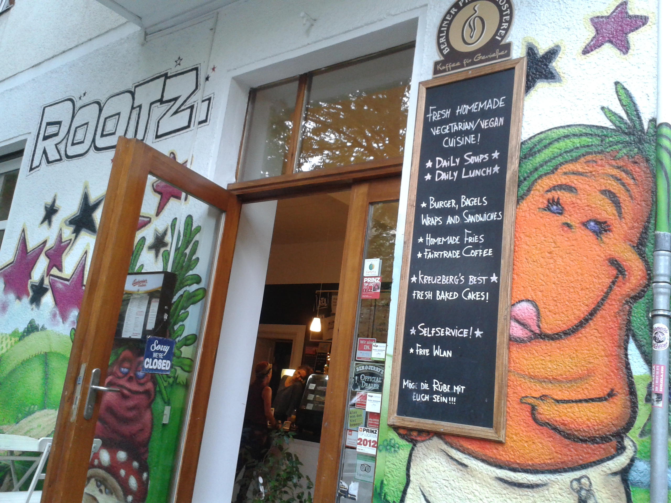 Kreuzberg is perhaps the most famous alternative area of Berlin, and thus it may be the one with the highest concentration of vegan-friendly eateries. To give an idea of how ‘alternative’ it is, we went on a walking tour to see the local street art and graffiti and a member of the group with a Primark shopping bag was advised to cover it up lest she get bottled by the locals. Hardcore! But it’s hard to imagine the people we observed on our leisurely summer strolls attacking a tourist: it was a really lovely and interesting place, and we were able to eat outside in the sun on several occasions. And the food is good!