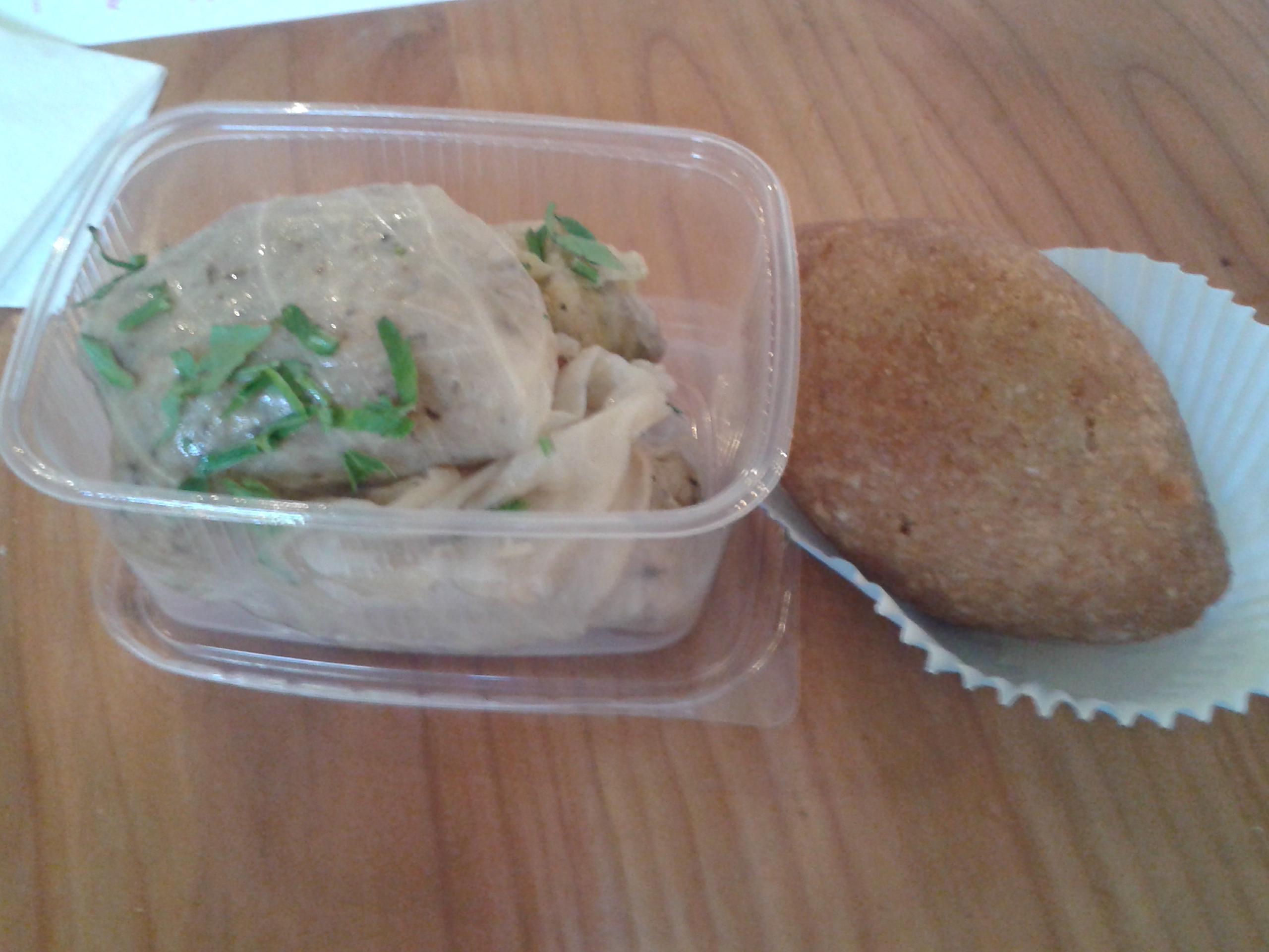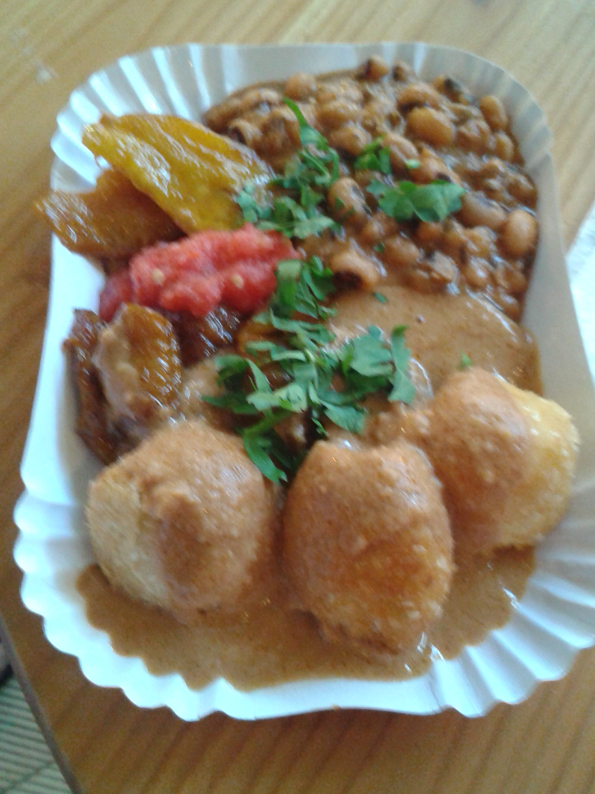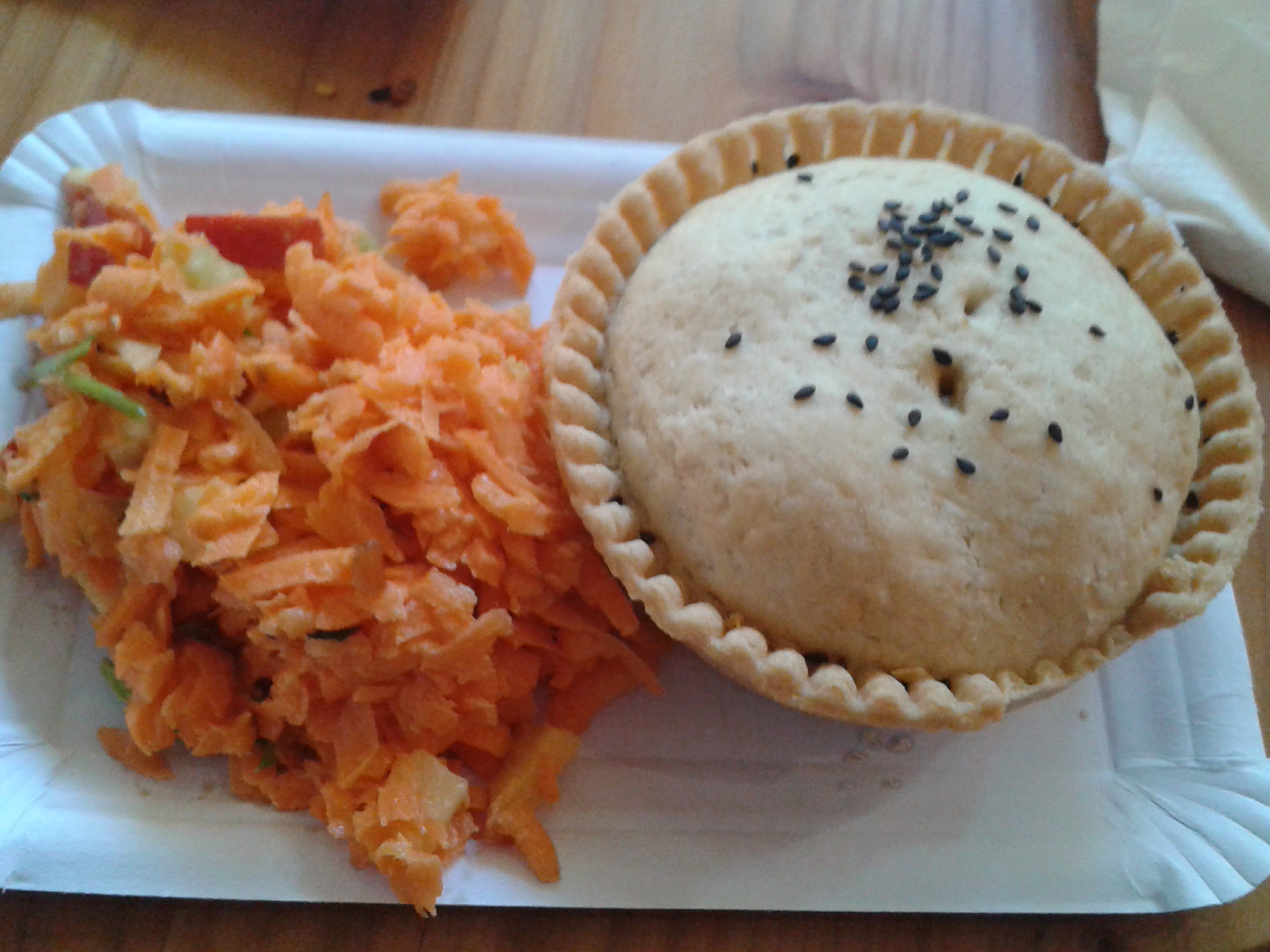 Every Thursday evening there’s a Street Food Market in Kreuzberg, so we made that a priority in our trip. There was a fantastic array of food, and the vegans were also spoilt for choice. I showed my northern roots by scoffing this pie from the Hallo Good Pie stand: the pastry was so good (as was the filling, but I’m crazy about pastry), and the little salad was nice and refreshing. My beau got this plate of Ghanaian food, which is all vegan except for the yam balls, which reportedly were a touch disappointing anyway. The other bits I sampled tasted lovely. And we also shared a couple of Turkish nibbles as well. We found the lentil fritter a bit dry, but the rolls were really good.