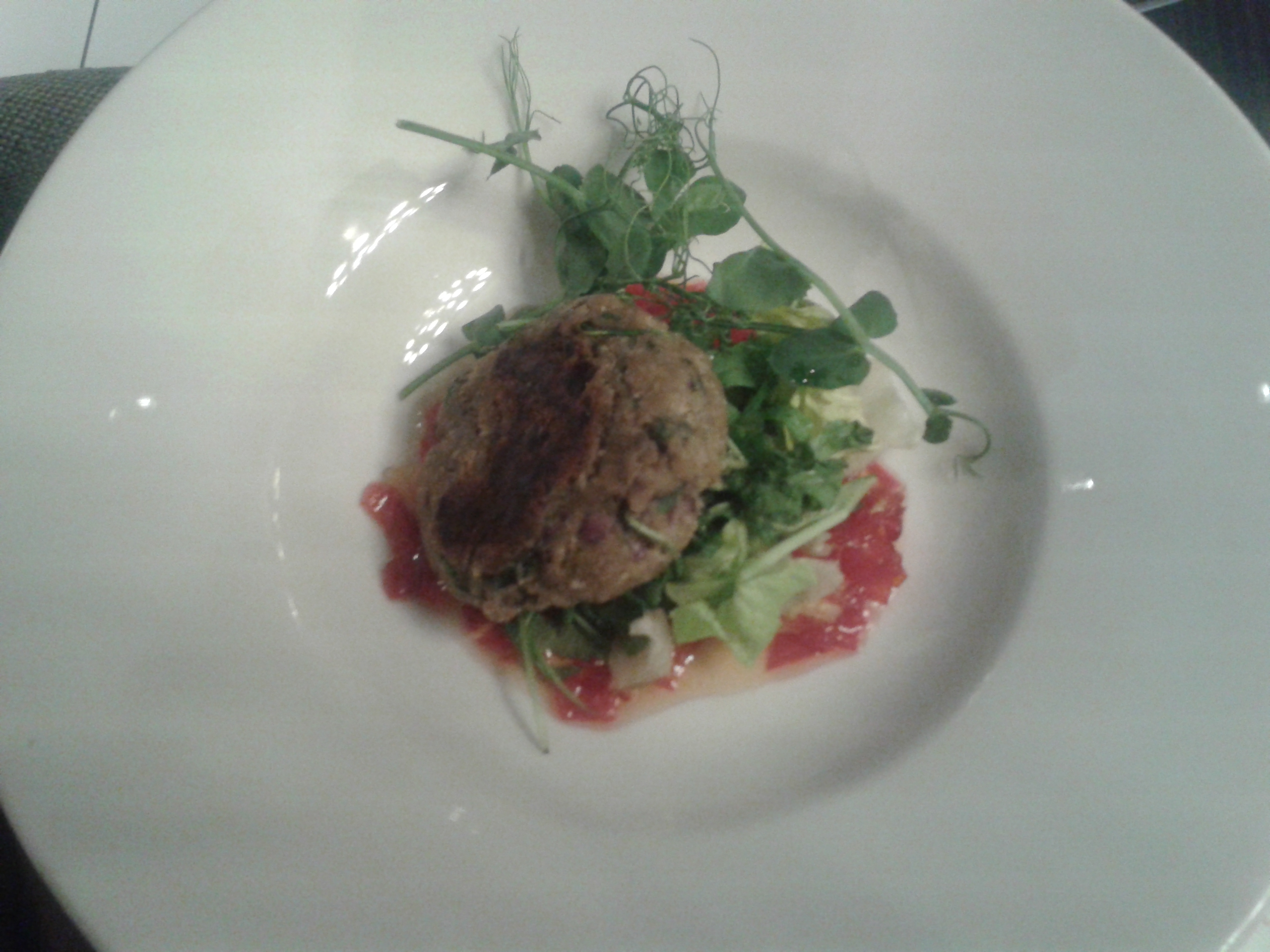 For our starters, I chose the vegetable terrine which came with a couple of toast triangles and was really tasty, while my fellow had the falafel, as is his wont. We are blessed with the greatest falafel known to man here in Manchester (Go Falafel – I can see it from my classroom window and quite often just gaze out, drooling), and had already had some for our train picnic that afternoon, so alas, this was doomed to fall a little flat in comparison, but was tasty nonetheless.