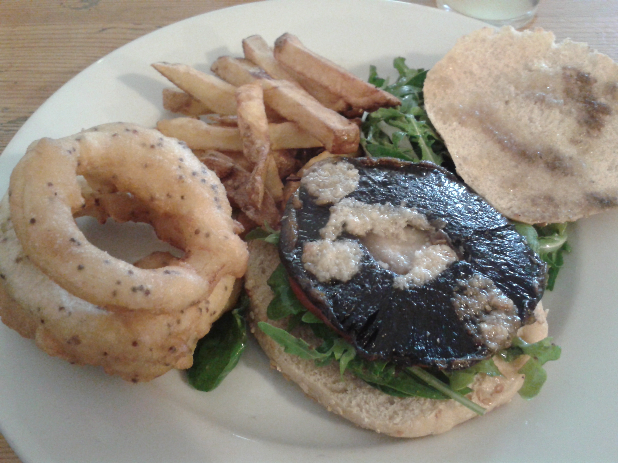 And of course, I didn’t let us down in the food stakes either. Mono is quite a big space, with a record shop, a book shop, a bar and a dining area, and it was popular with the lunchtime crowd. Usually I try to avoid ordering the same as my companions, but this time we had the same main and dessert because they were just too good to resist. The grilled portobello burger was garlicky and satisfying, but completely overshadowed by the beer-battered onion rings. Delicious!