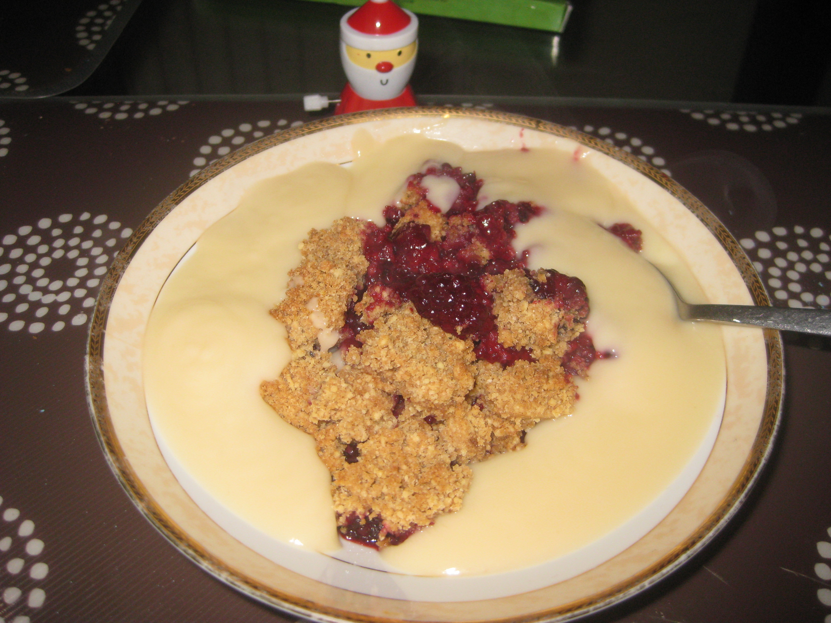 Dessert wasn’t really required, but I threw together a blackberry crumble and Mr HH whipped up some dairy-free custard.