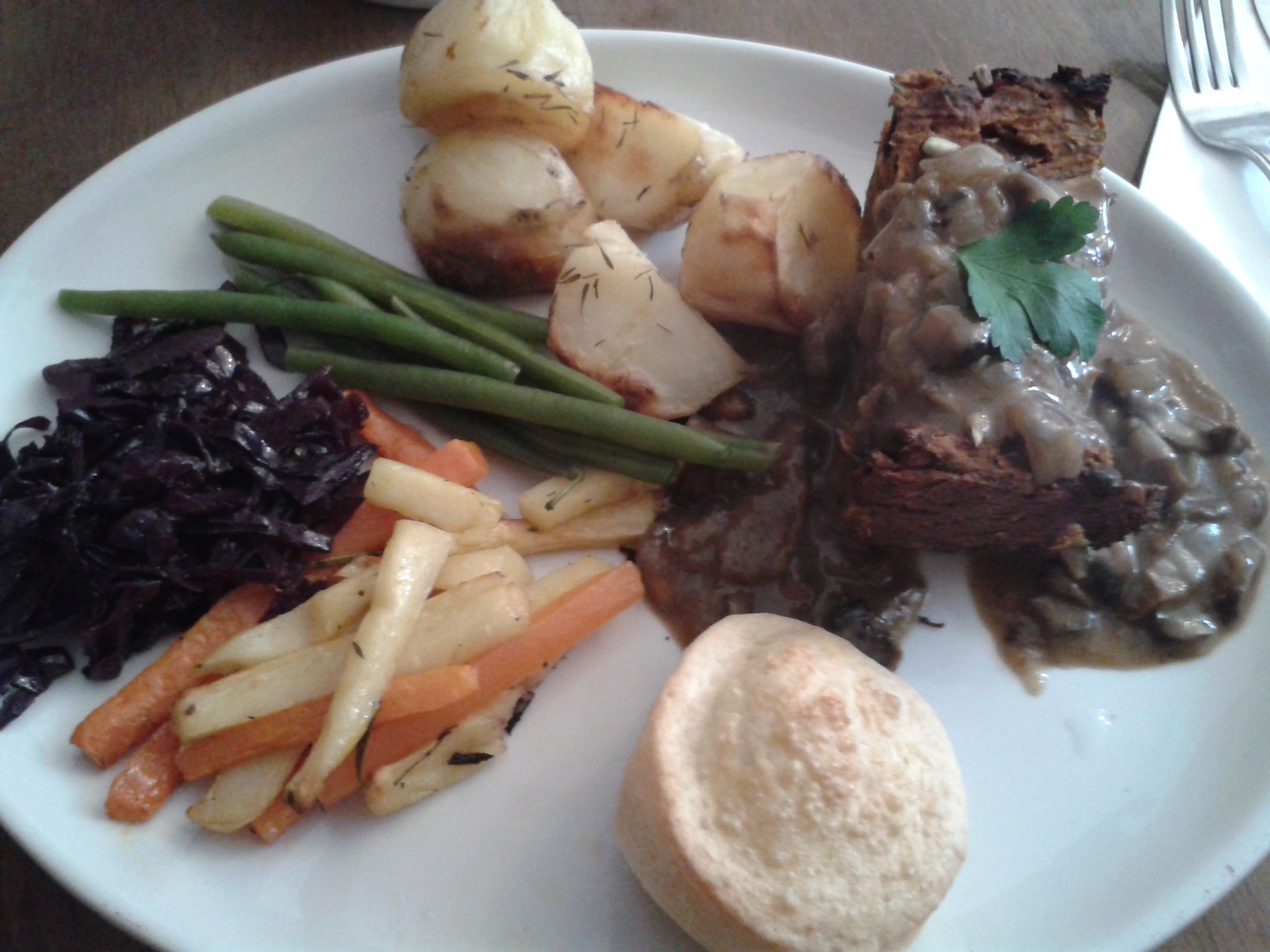 I’ve eaten at Goji probably four or five times in the last year, and I just love it. I’ve had the Sunday roast twice, and it’s easily my favourite thing on the menu (not including the cakes, obviously). The roast itself is chock-full of lentils and nuts. Nut roast has an unfair reputation as being a bit bland and sawdust-like, but I’ve never really found that to be the case, there’s always so much flavour. You get a really generous portion and a lovely mushroomy sauce surrounding it with those wonderful earthy flavours. The accompaniments are also pretty special: plain green beans don’t add much to it, but the cabbage and roasted carrots and parsnips are good, and it’s rare to get quite so many roasties, I find, so I’m happy with that. And behold, at the front of the picture, a vegan Yorkshire pudding! Whenever I see one on a menu, I devour it. True, it doesn’t look like a Yorkshire pudding – but inside it’s just the same and is a very welcome addition.