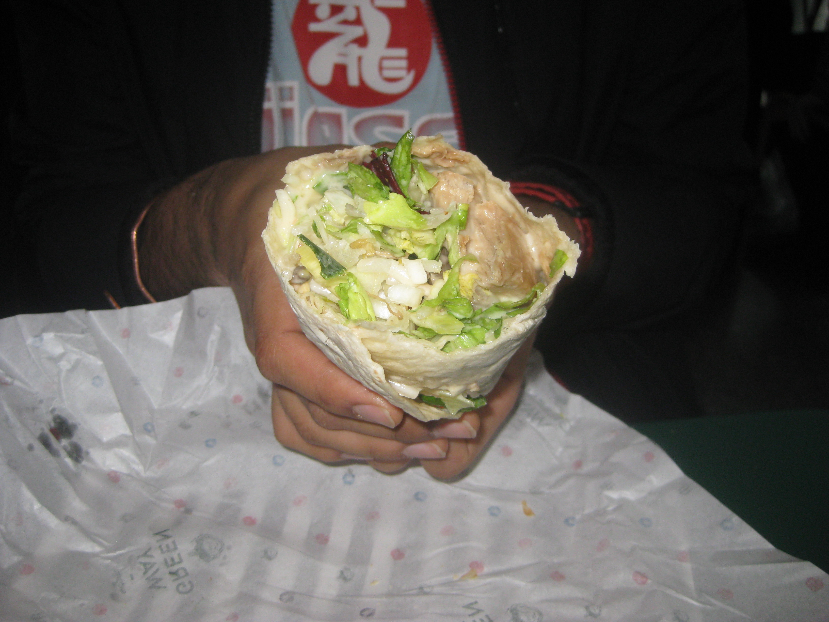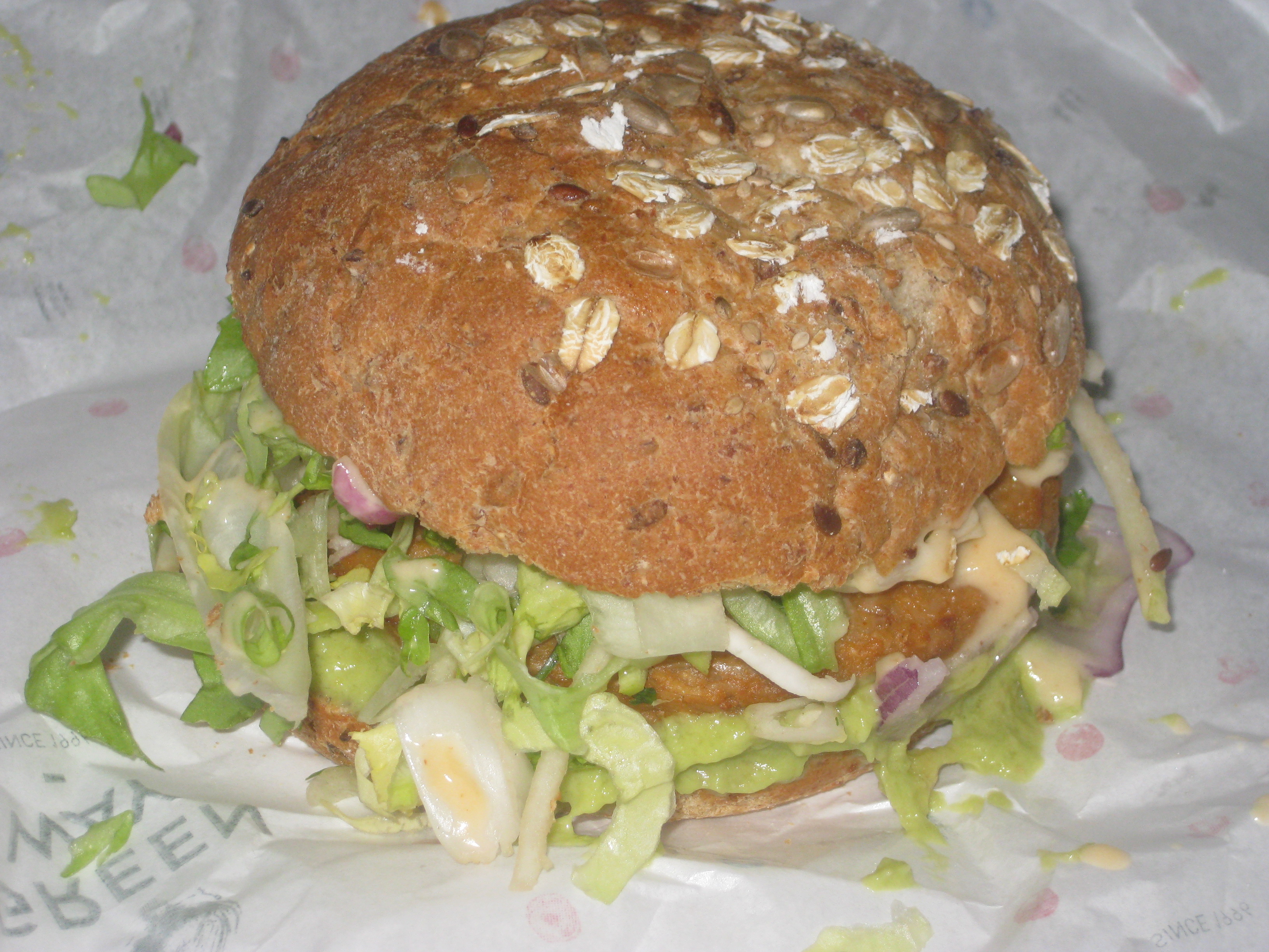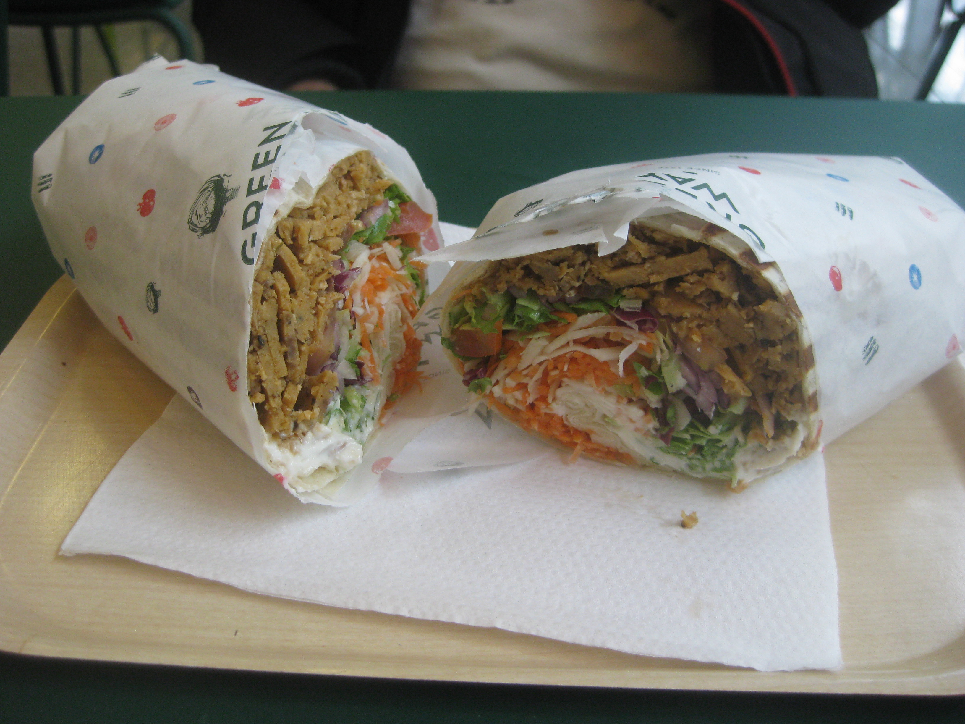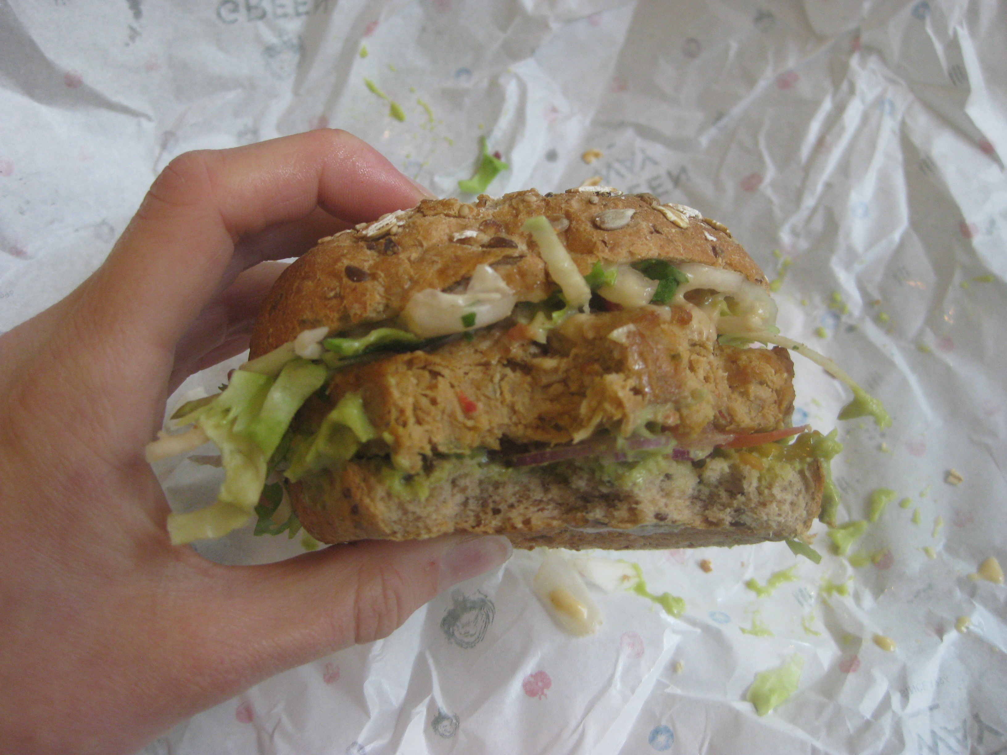 My fellow went for the Yakitori wrap, which was also vegan (vegan options are clearly marked on the board behind the counter – there are 3 wraps and 2 burgers to choose from for lunch). He’d feared that my burger would outdo his meal, but the wrap was gigantic, and reportedly also delicious. Again, the mock chicken warranted particular praise, but he also enjoyed the salad and was only disappointed that it was a little heavy on the dressing.
