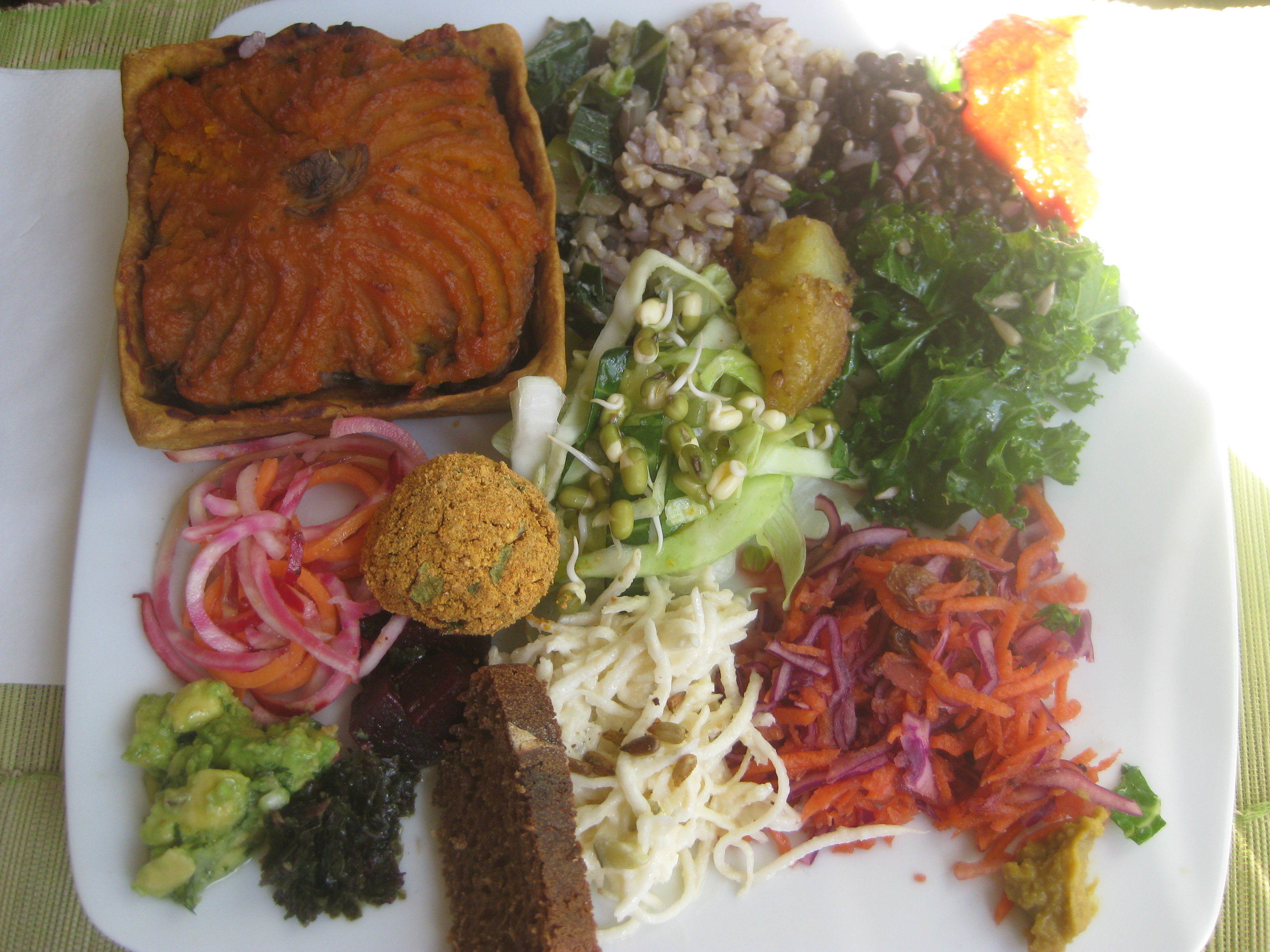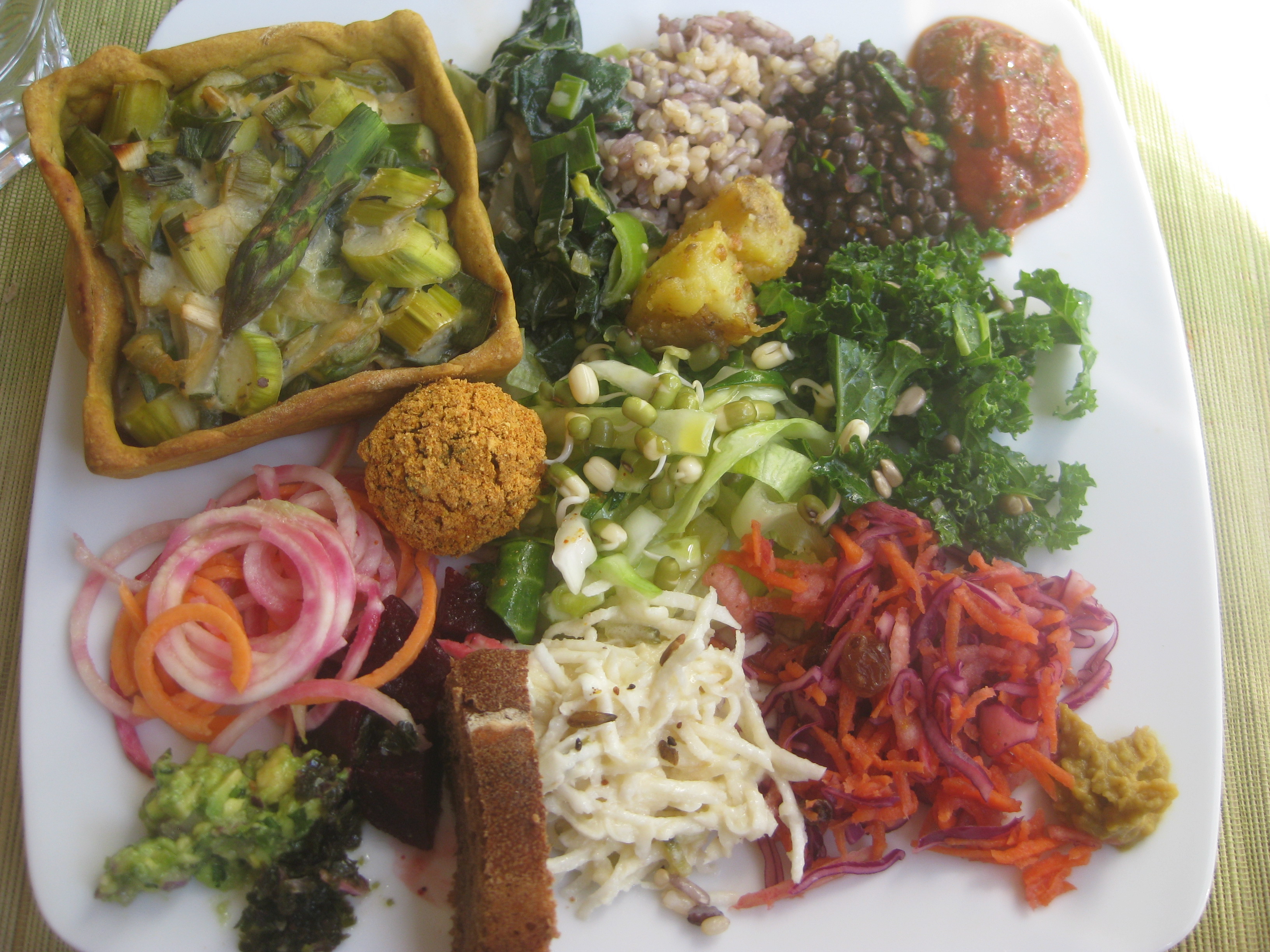 They offered two different kinds of savoury tart, or a salad plate.  Obviously we chose tarts.  We were given the freshest, prettiest, tastiest dishes imaginable.  My fellow got the pumpkin tart, which had good crisp pastry, a layer of mushrooms and courgettes and pillowy pumpkin on top.  I had the leek, asparagus and courgette tart which was so green and spring-like.  Both dishes came with the same salads:  a surprisingly dry falafel ball, some really nice bread, good rice and lentil salads, a Japanese inspired radish and beetroot salad, some zesty shredded beetroot and carrot, two tasty potato bites, some good old kale, other green veg and a spicy little dollop of salsa.  Everything was fresh and beautiful.  At 14.50 it’s not a cheap lunch, but you definitely get your money’s worth.