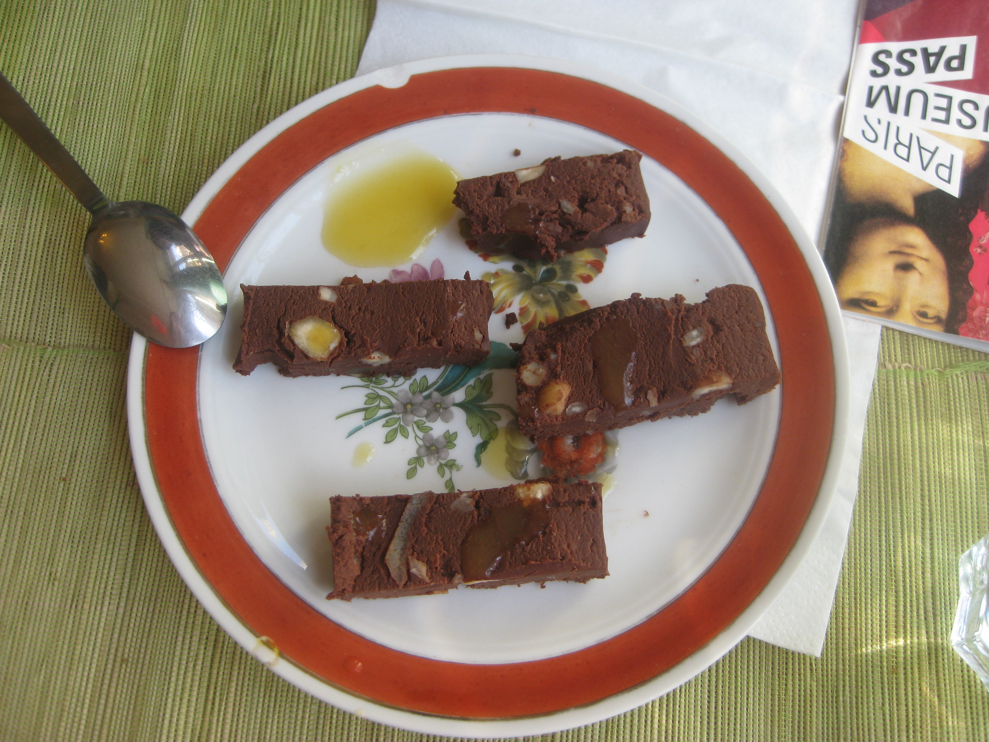 We continued our fancy Parisian theme with dessert, ordering two “gourmande” plates.  We were served a small piece of two of the desserts from the menu (chocolate cake and pain perdu), a shot glass of ice cream, some whipped cream and a coffee – or tea, if you ask nicely.  The real highlight was the pain perdu, which was caramelised, sticky, gooey, delicious:  all the good words you want associated with your dessert.  I don’t know if I could have handled a full portion of it, so this was definitely the way to go.