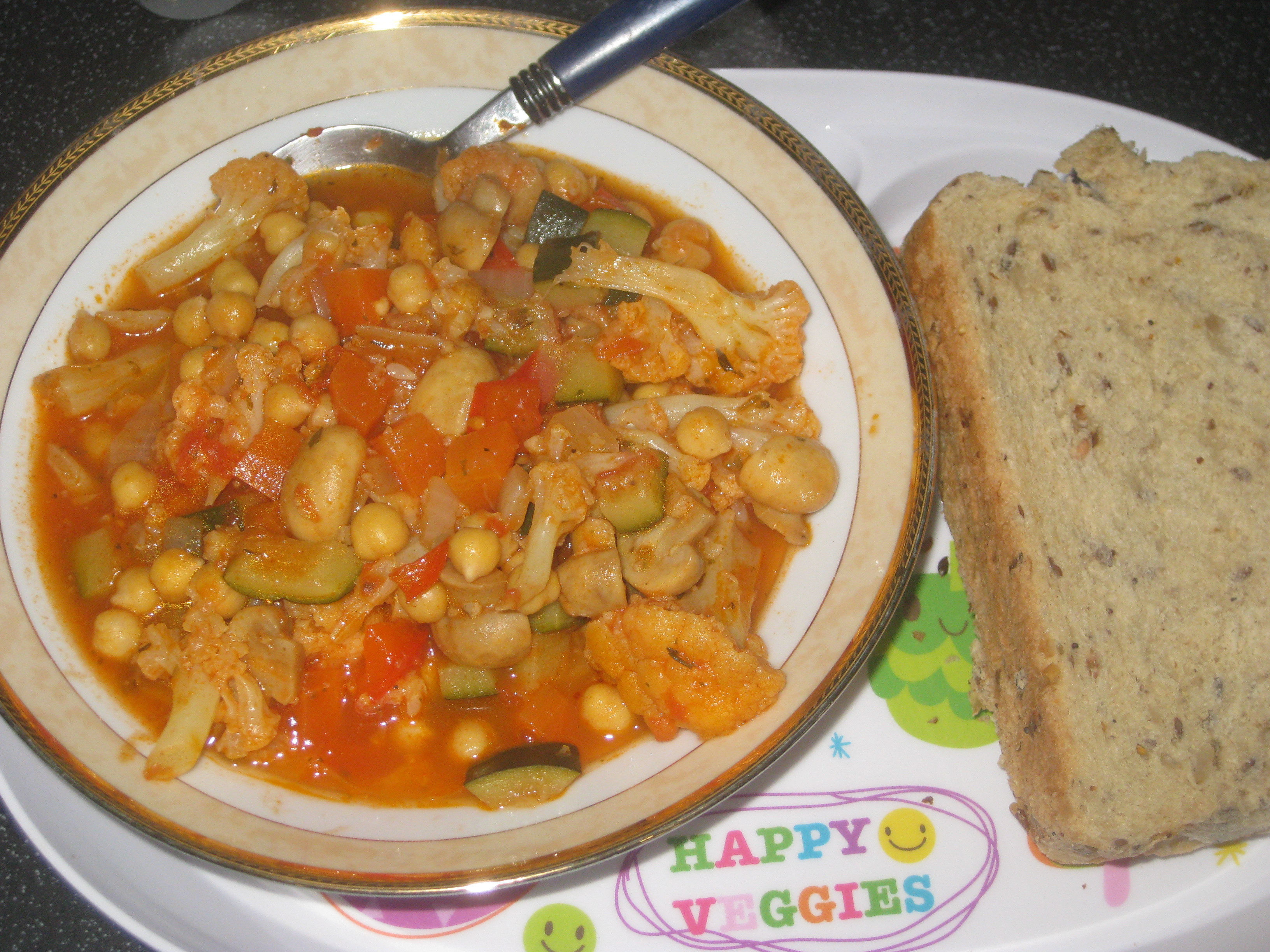 Happy Veggies, indeed.  The herby chickpea stew was healthy and, as the name promises, herby.  It had all manner of good things:  courgette, chickpeas, cauliflower, carrot, red pepper, and all the herbs in my kitchen.  It would be grand with some rice, but bread is always my carb of choice.