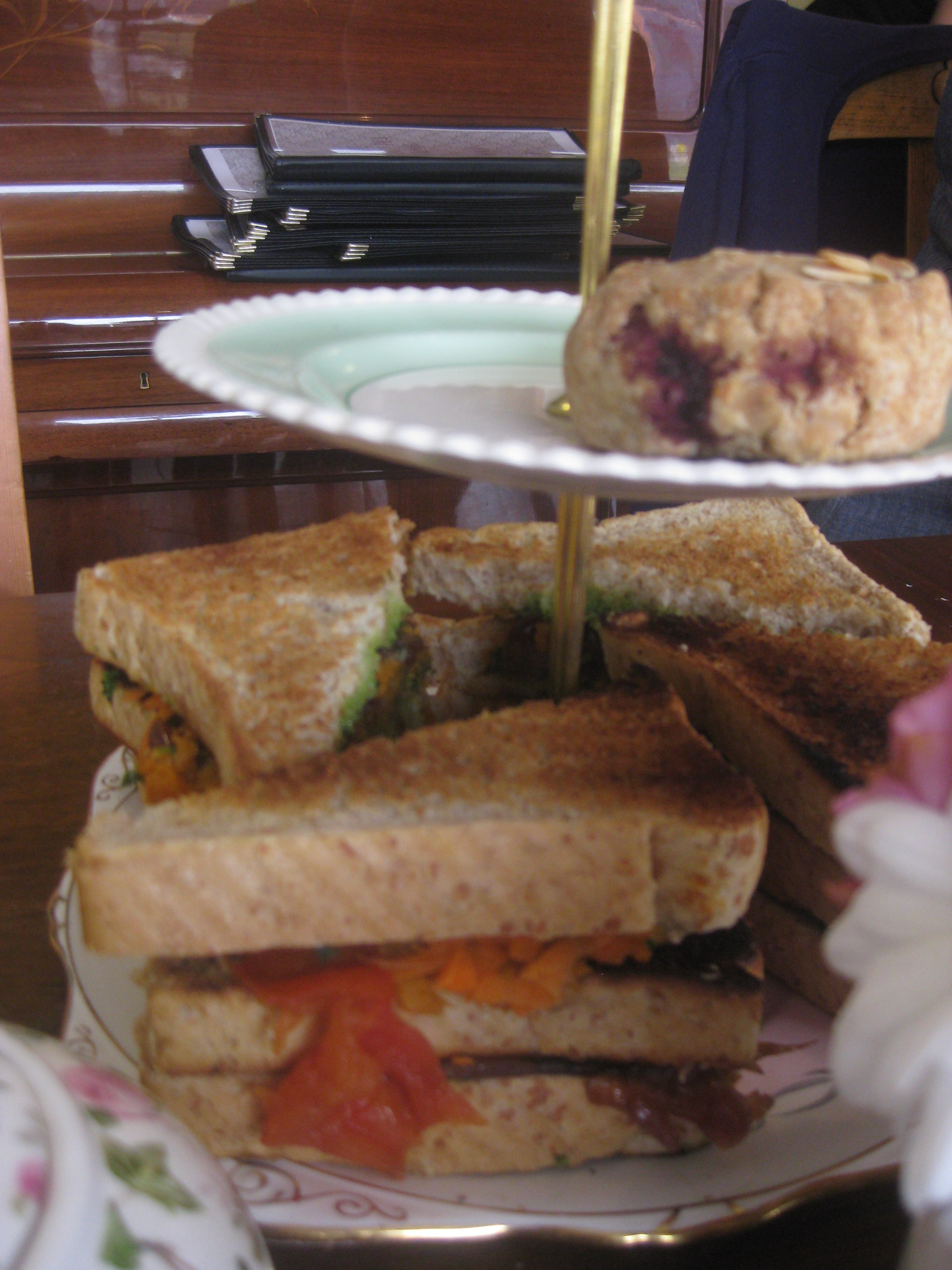 Luxury afternoon tea at the Crosby Tea Rooms involves a choice of a sandwich from the menu: there are two vegan fillings, or a club sandwich combining both of them between thick slices of toasted bread. Obviously that’s the one we all chose, which may have been an error. The sandwich was delicious (though it could have done with something to counteract the sweetness of the sweet potato, of which there was a lot), and the accompanying salad and vegan coleslaw were good too. But we had a full club sandwich each, two of the halves shown above, and that is a lot of food when you consider it has to be followed by a scone and two full size slices of cake. There’s a reason afternoon tea usually features finger food, after all. Fortunately, we were asked if we’d like to take the leftovers home, so we duly accepted.