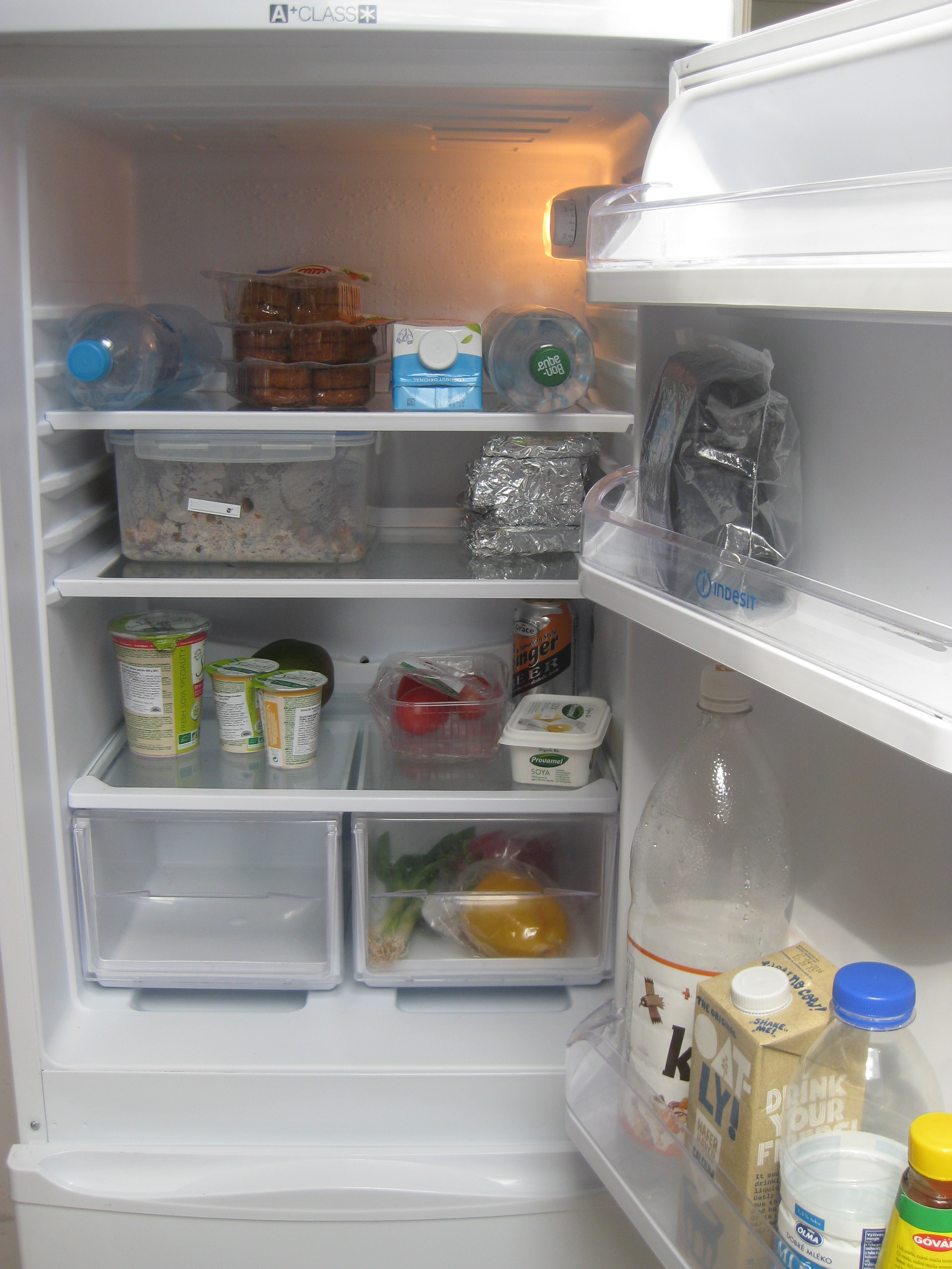 And we have a great big fridge! So big we haven’t got it fully stocked yet. There’s a lot of bottled water in there, not that we are fans of it in places with drinkable tap water. These are just bottles that we refill and keep chilled at all times to take on hikes, cool us down during the heatwave earlier and provide for us when the water supply cuts out. This has happened a few times, most notably on Tuesday when our entire area woke up without water. Dr HH felt vindicated for keeping water in the fridge at all times, and I felt vindicated for always filling the kettle before bed. I can start the day without showering, but I can’t start the day without a brew! Fortunately Prague has a great selection of dairy-free milks and yoghurts, and we always have a big pot of food for packed lunches and a pile of home-made, foil-wrapped snack bars to sustain us at work. And chilled falafel, because I am a vegan.