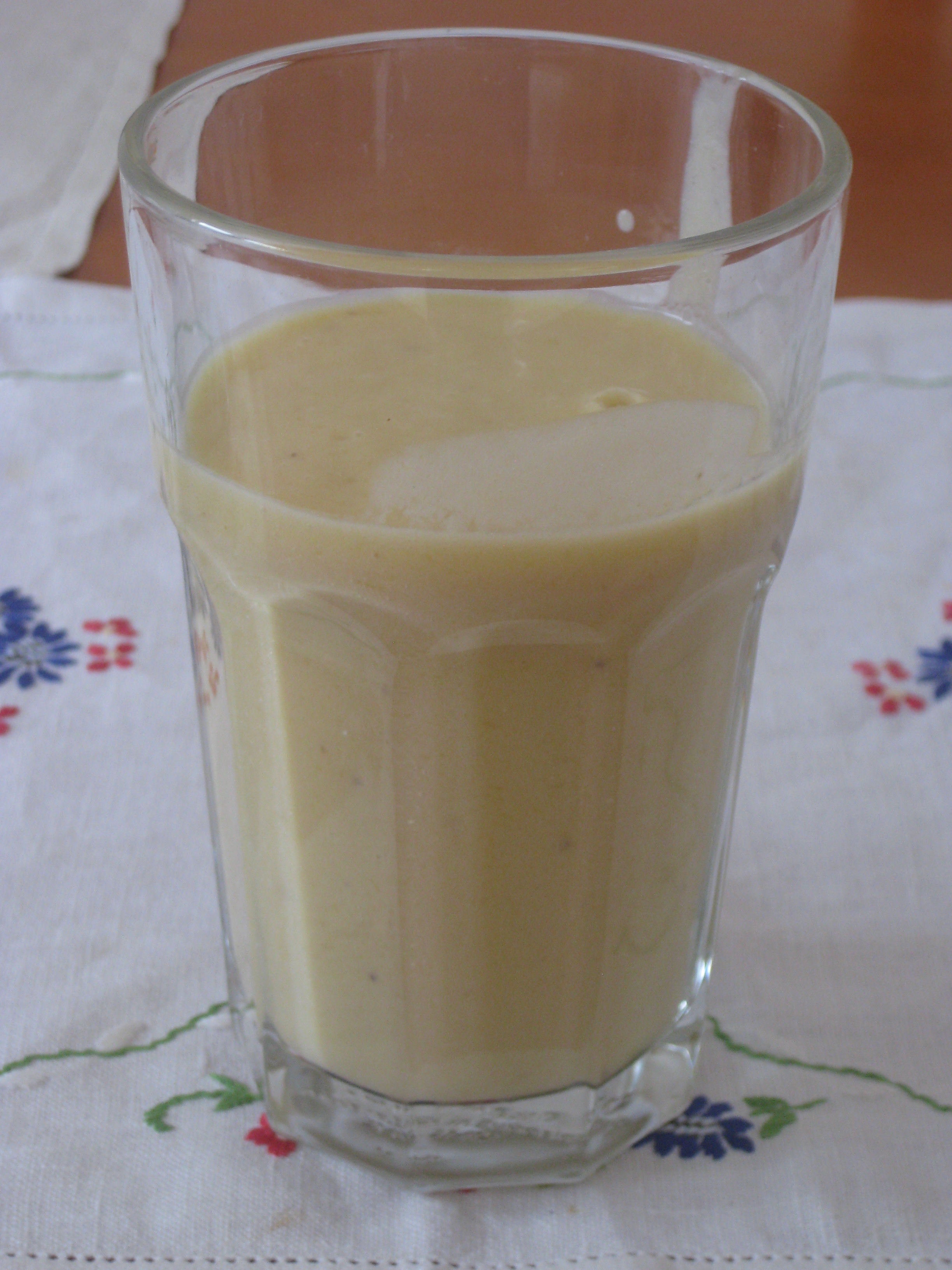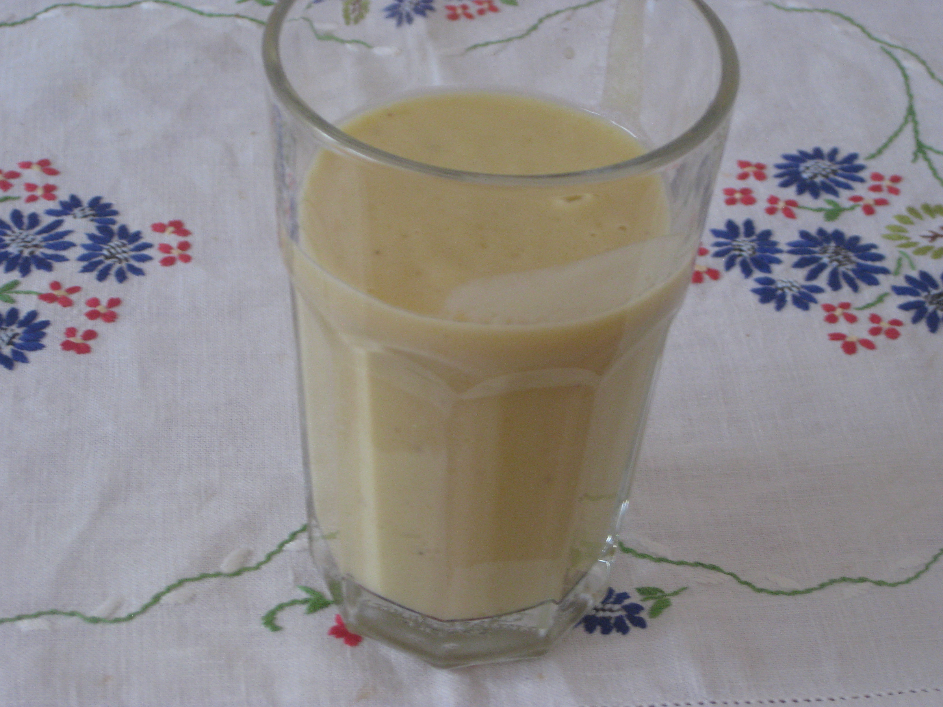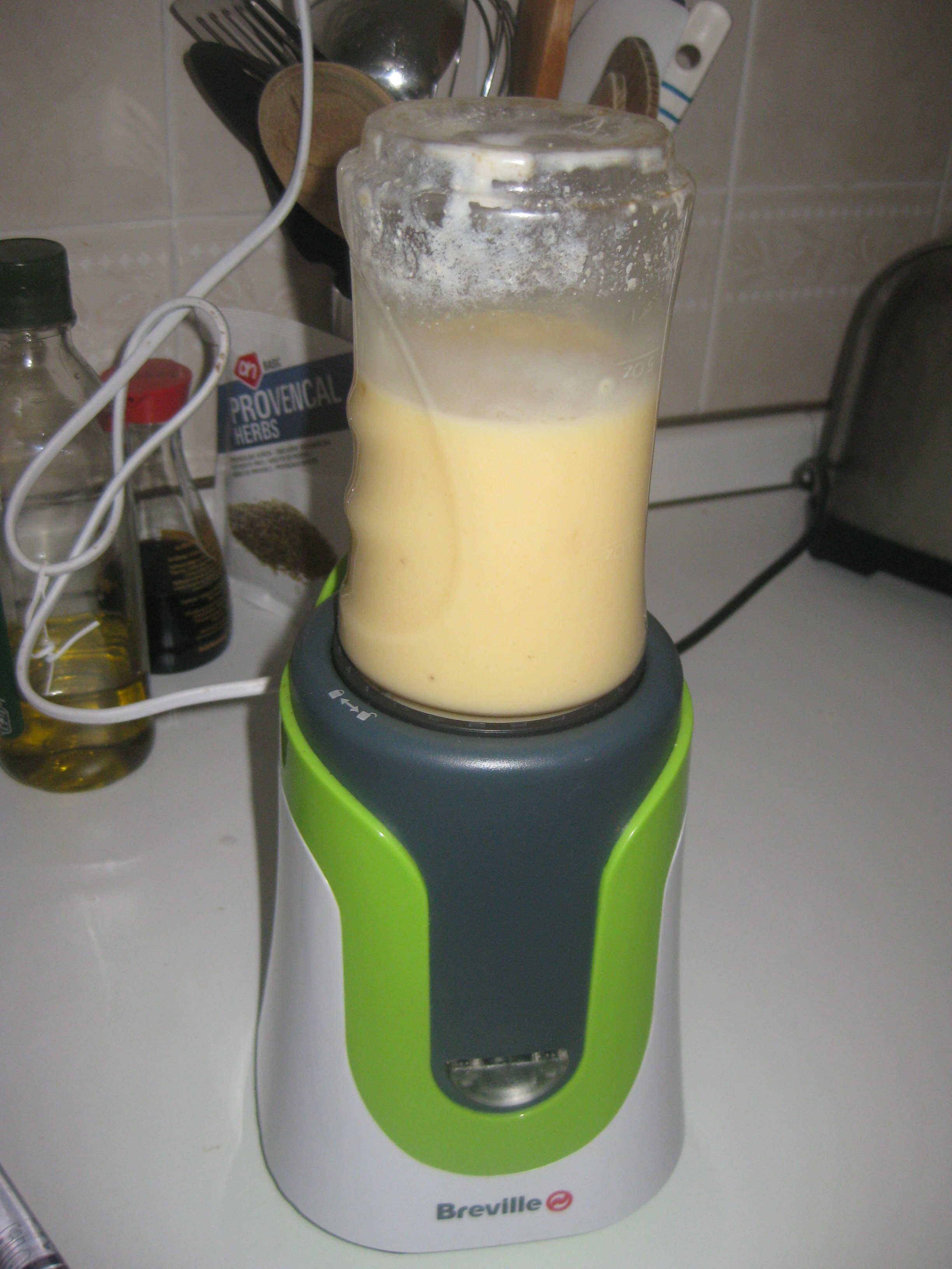 Still, if you can prepare food without the oven in the summer heat, so much the better! I brought my little blender over with me from home, and I’m very glad of it. Here’s a nice summery breakfast smoothie, combining some good tropical flavours. You just need to chop a mango, peel a banana, scoop in about 120g yoghurt (coconut yoghurt is best, of course) and pour in 2/3 cup of coconut milk. Blend and drink!