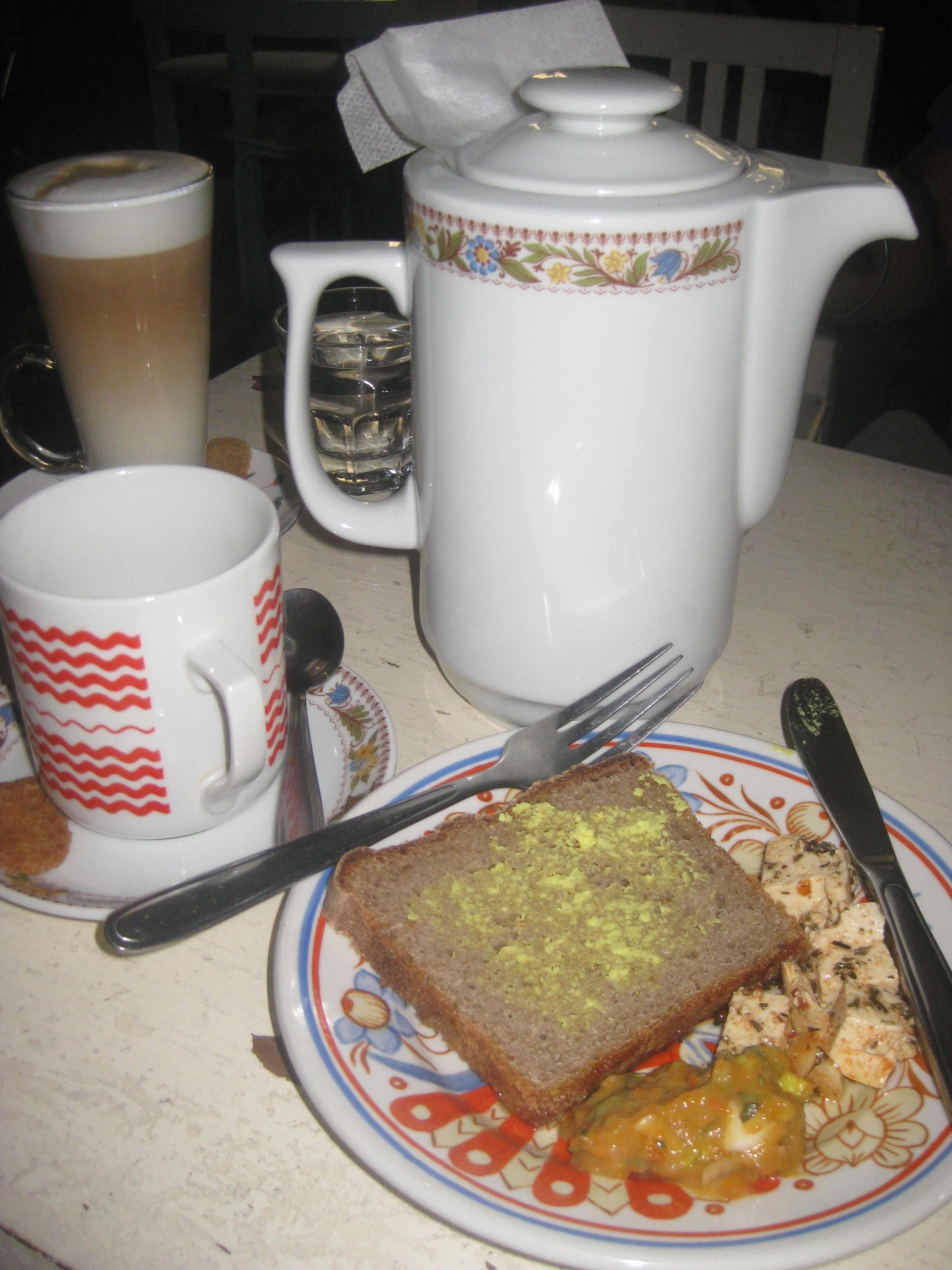 It was the very essence of simplicity: they did a few things, and they did them well! There was a bread basket with slices of a few different kinds of homemade bread, including this nice brown one that I had and an even better yellow one with seeds scattered on the top. These were accompanied by homemade strawberry jam and a really good coconutty spread. Lovely! There was also a salad plate (obviously I avoided that, but everything was good and fresh), some delicious, marinated, garlicky tofu and this yellow concoction that tasted kind of like coleslaw: creamy, cold and mayonnaisey. Everything was freshly made, regularly replenished, and easy to peck on. We had two helpings, and were more than satisfied.