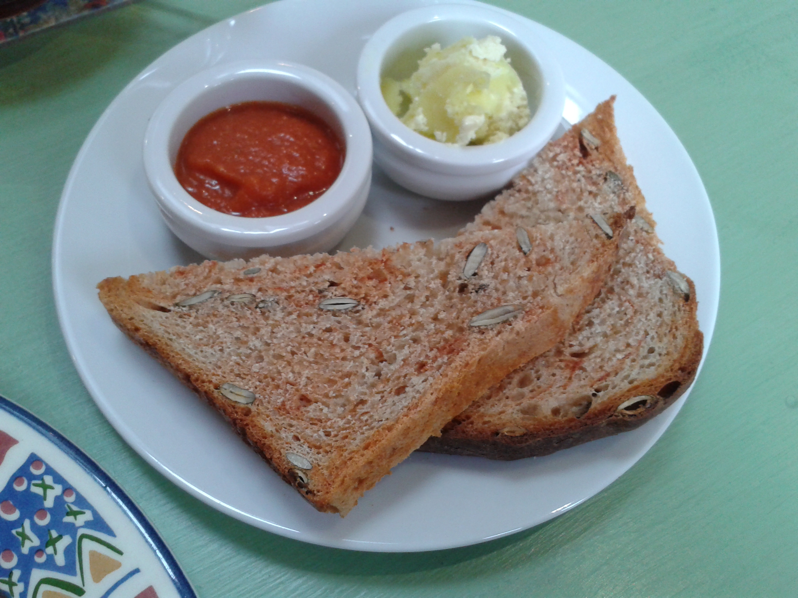 The breakfast was £6.95, including toast and a brew.  The toast was delicious sourdough bread from local Uprising Bakery, and it was very good.  The ketchup was tasty when I dipped my knife in, but I’m not really sure how it was intended to be eaten – the thought of ketchup in the same vicinity as toast is enough to turn my stomach, and even my fellow, who will mix all kinds of food, merely had the ketchup separately.  Much better was the other pot: tell them you’re vegan and they give you a mixture of coconut and olive oil, which was spreadable and tasty.