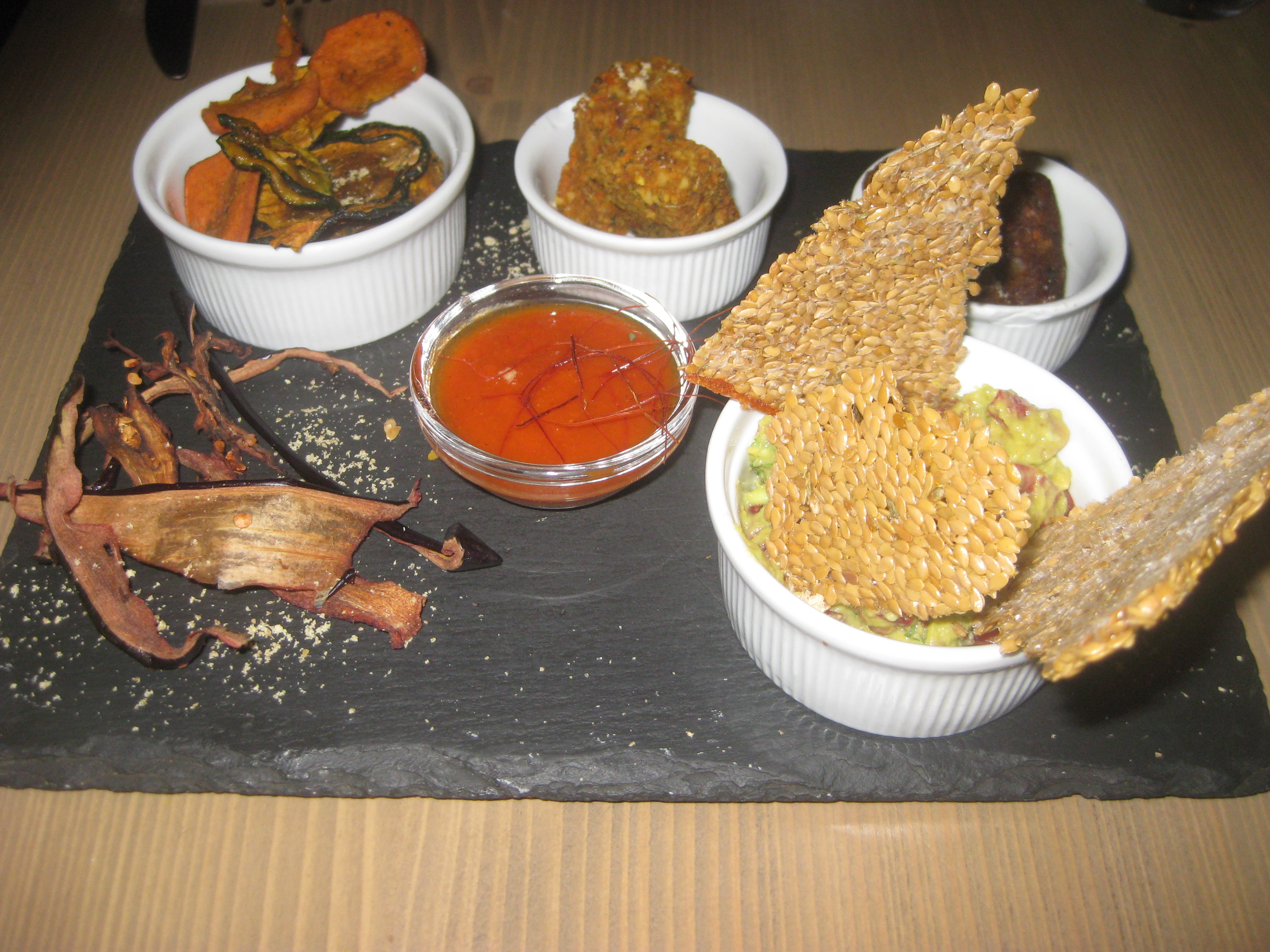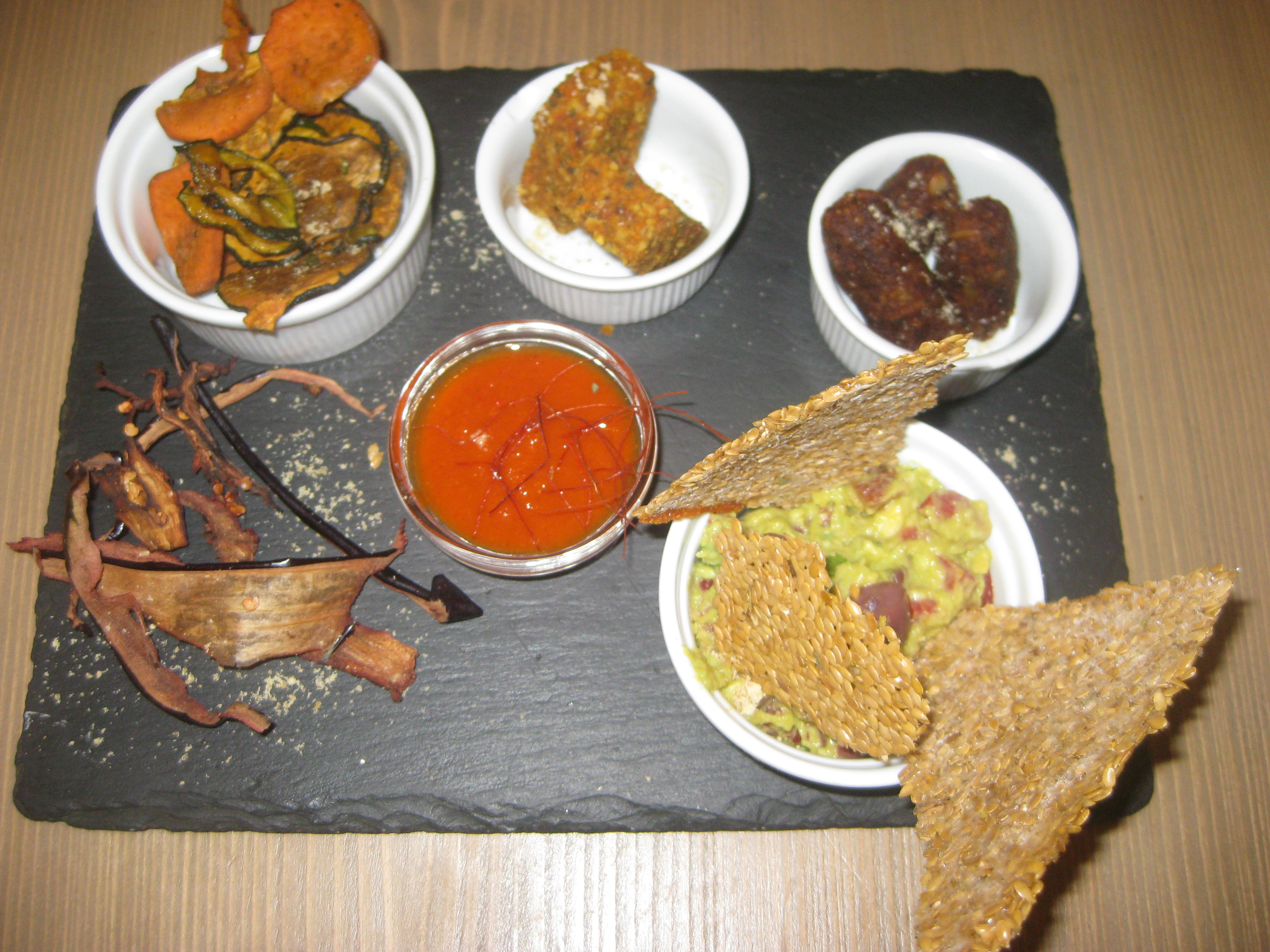 The dehydrated aubergine crisps in the front left corner look so inviting.  Alas, they were too soft and difficult to chew through – in no way as crisp as they looked.  The courgette and pumpkin rounds in the ramekin behind them were better and still had a great flavour, but also weren’t as crisp as I would have liked – is it possible to get raw food crispy?  Still, they were delicious with the spicy tomato dip in the middle, whereas the aubergine was inedible.