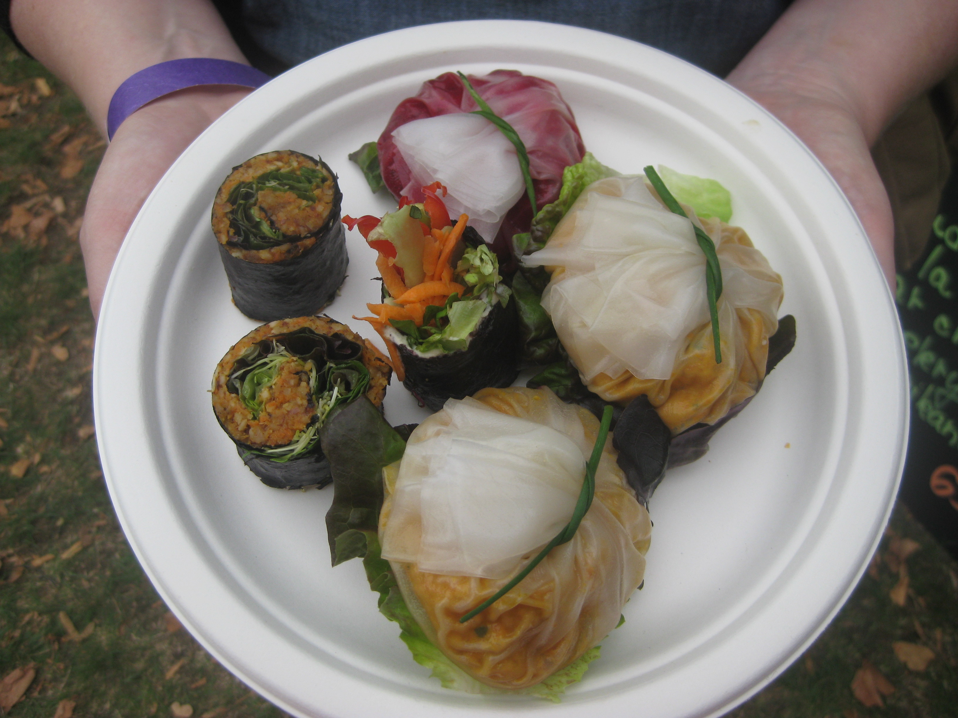First of all, this delicious raw sushi plate from Raw Deli (note: all the food purchased at the festival fed three people. I was not just extremely gluttonous that day). The fresh vegetable sushi roll was, according to my mum, crunchy and light. The walnut rolls that Dr HH and I had were really flavoursome, with a walnut pate in the centre with the veg. The three big rice paper parcels were tied with a chive, which was a great touch. My mum loves all things beetroot, so she had the pinkish one on the far side. Although it didn’t taste strongly of beetroot, she said it was really nice. The carrot and vegetables parcels were so good: soft, squishy, but surprisingly easy (non-messy) to eat.
