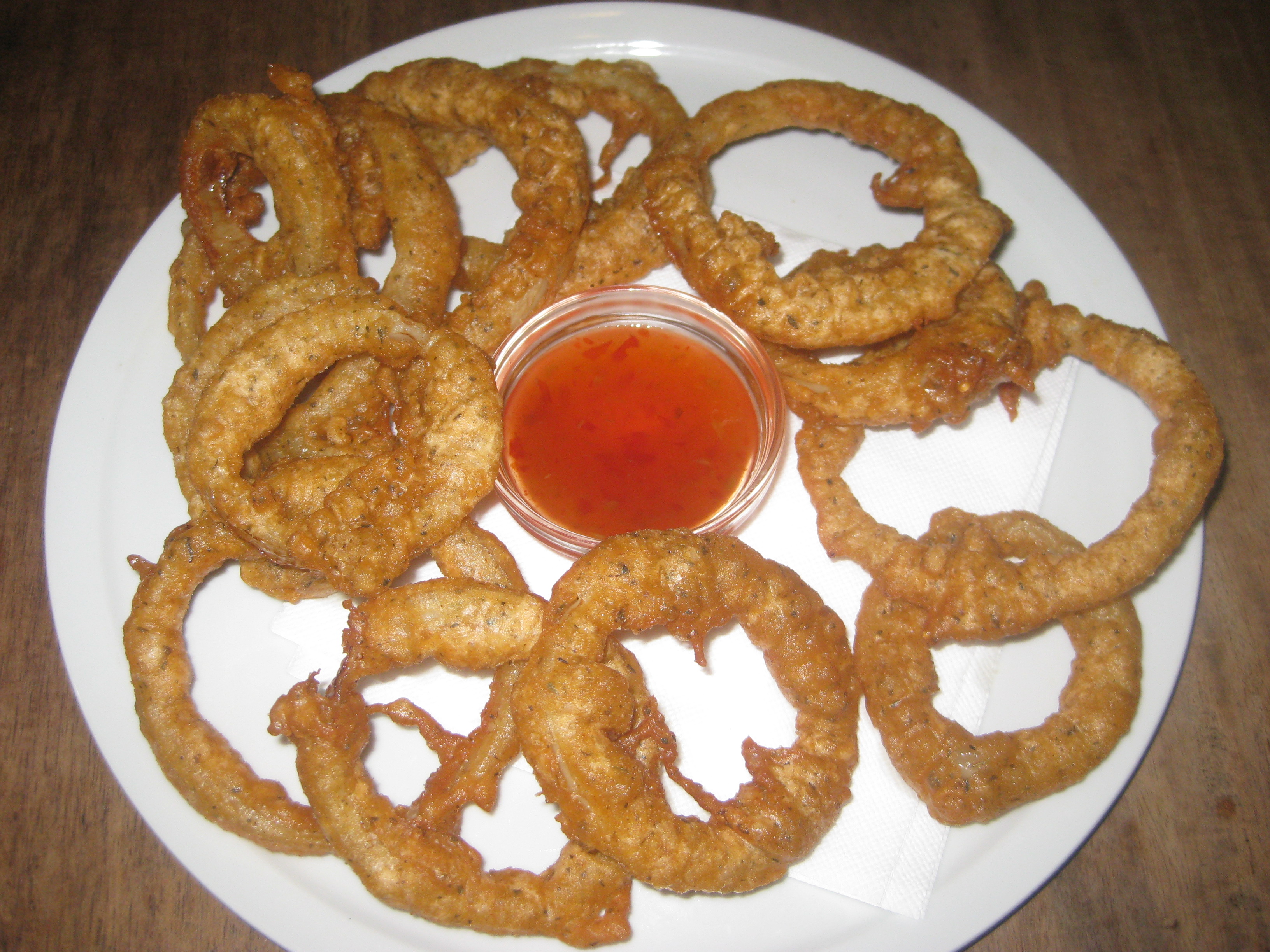 We started with a plate of onion rings, that great vegan rarity.  I had some in Glasgow that we still reminisce about frequently, and don’t think any have popped up on a menu since then.  They were plentiful, and they were delicious.  The batter was fantastic, and there was a good, spicy sweet chilli dip.