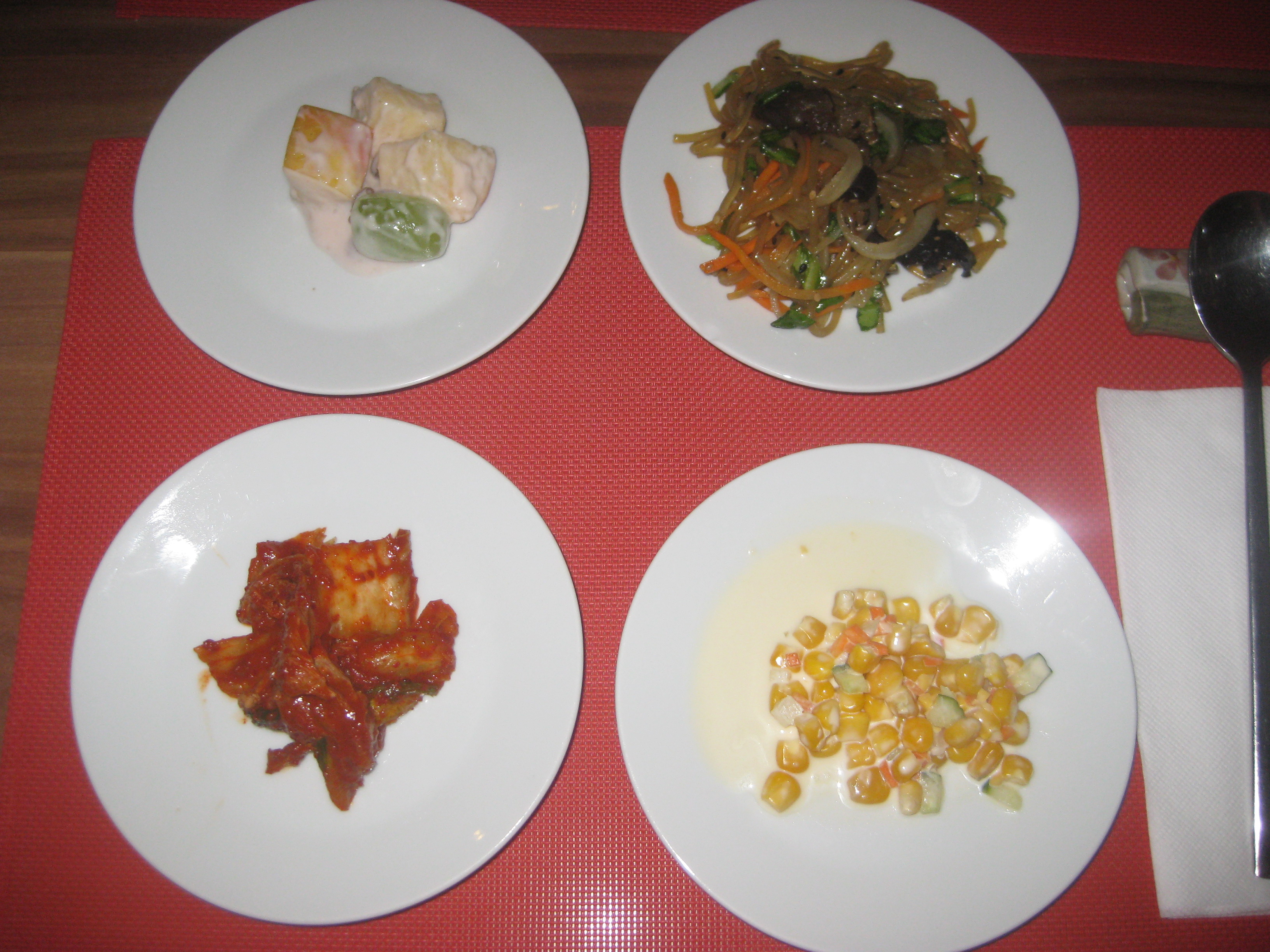 We got these little plates of food for our appetiser, and a glass of plum juice at the end.  They told us all the dishes were meat-free, but I was only willing to gamble on the noodly one being vegan (the red kimchi one as well, but it was a touch too fiery for me!).