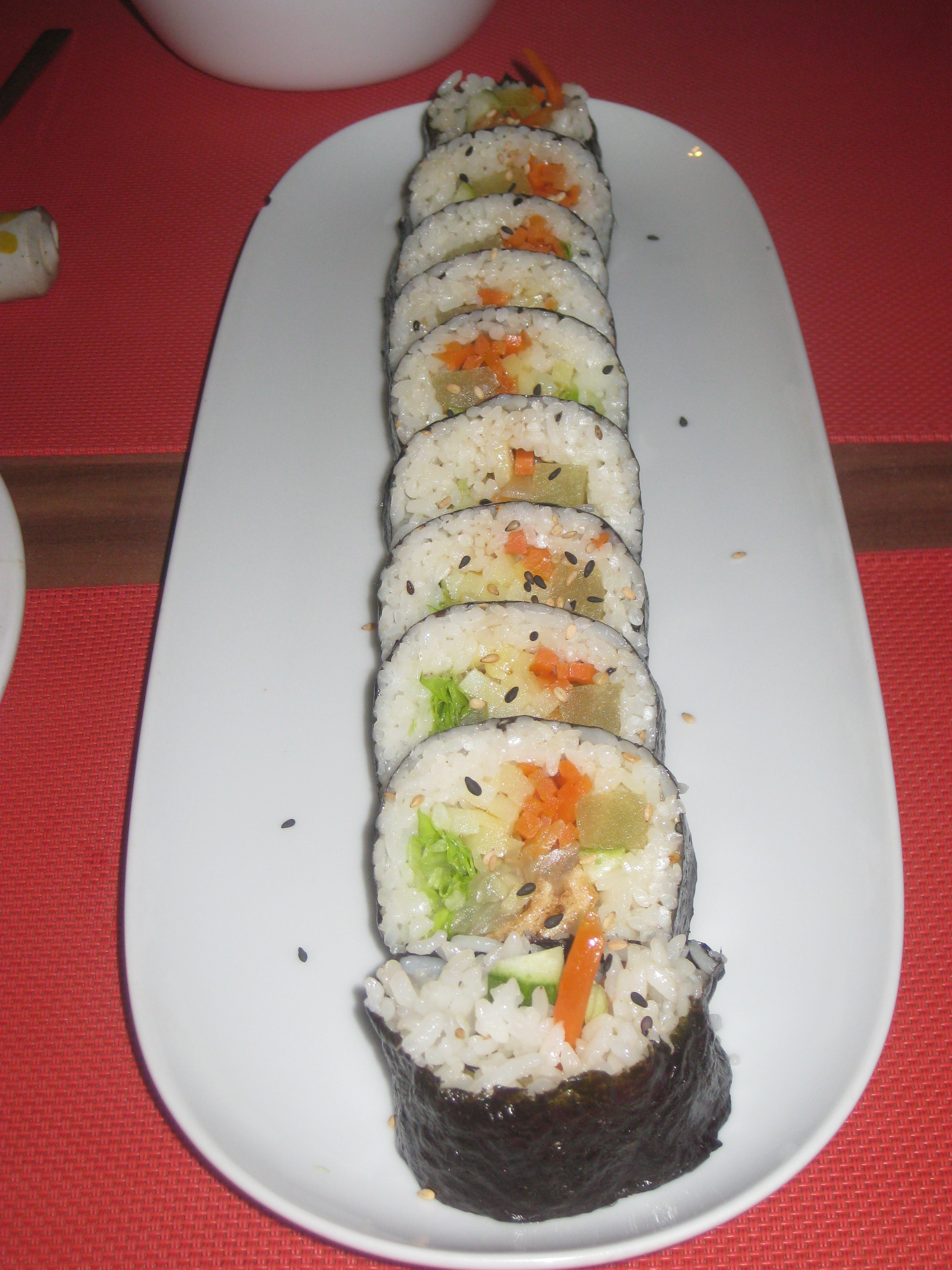 The vegetable kimbab was delicious:  tofu, carrot, radish rolled up like sushi.  It was good for putting out the fire in my mouth – very refreshing!  There’s a sushi section of the menu with some vegan avocado or cucumber maki, but it was nice to try this Korean version for the first time.