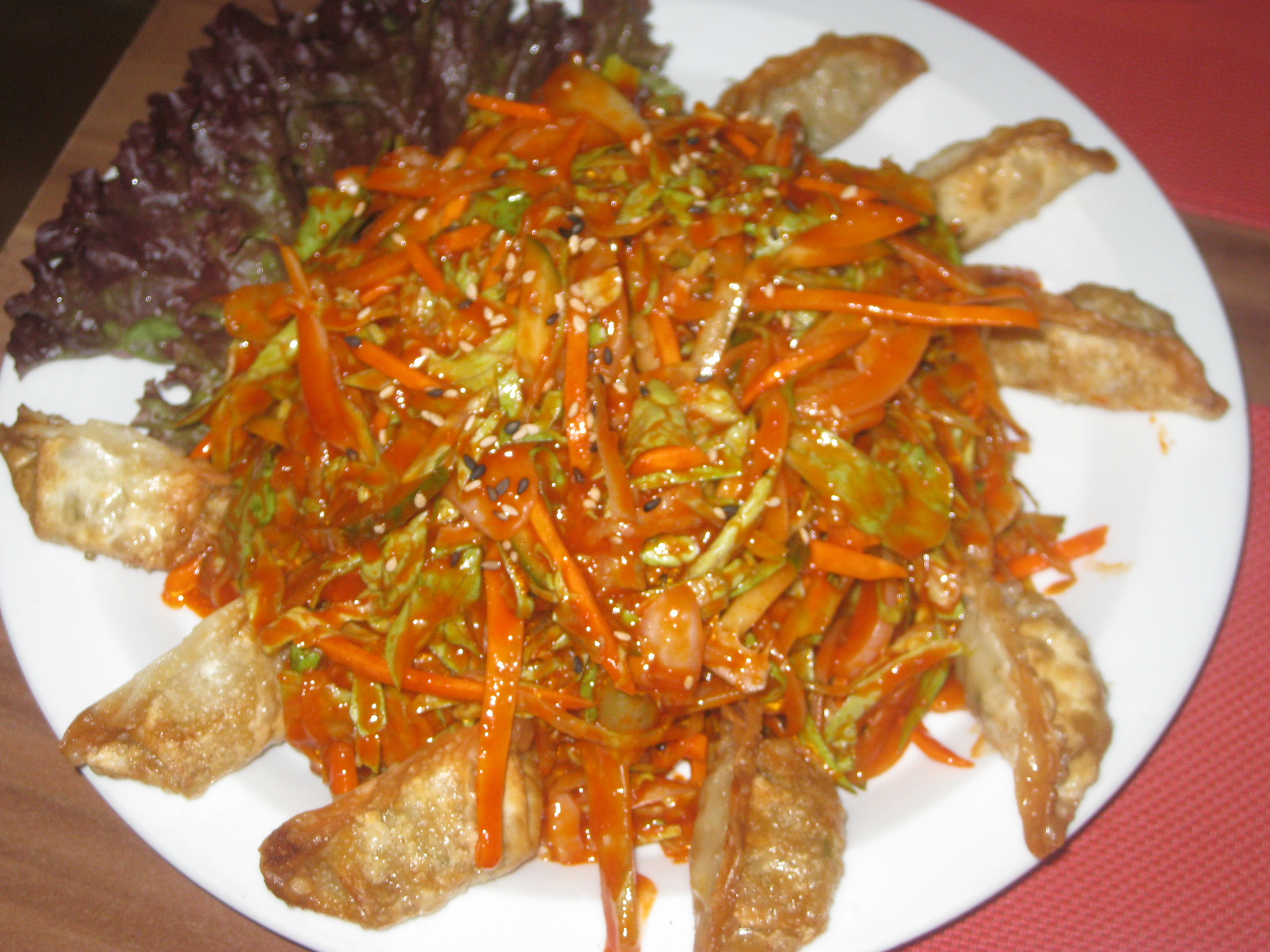 And dumplings!  This dish was bibim mandu:  the mandu are the little dumplings, which were crispy and perfect, like gyoza fried to crunchy perfection.  The salad in the middle was extremely saucy, and that sauce was extemely fiery.  I had two mouthfuls, and couldn’t touch it again.  Dr HH loved it though so again, it’s all about tolerance.  We both agreed that this and the vegetables in chilli sauce above would have been better with some rice to cut the heat a bit (Dr HH also lamented the lack of bread to mop up the sauce afterwards).  We couldn’t eat everything, but we packaged up the leftovers to take home.  Thankfully, this place has an open policy on tap water and we were able to keep the refreshments coming.