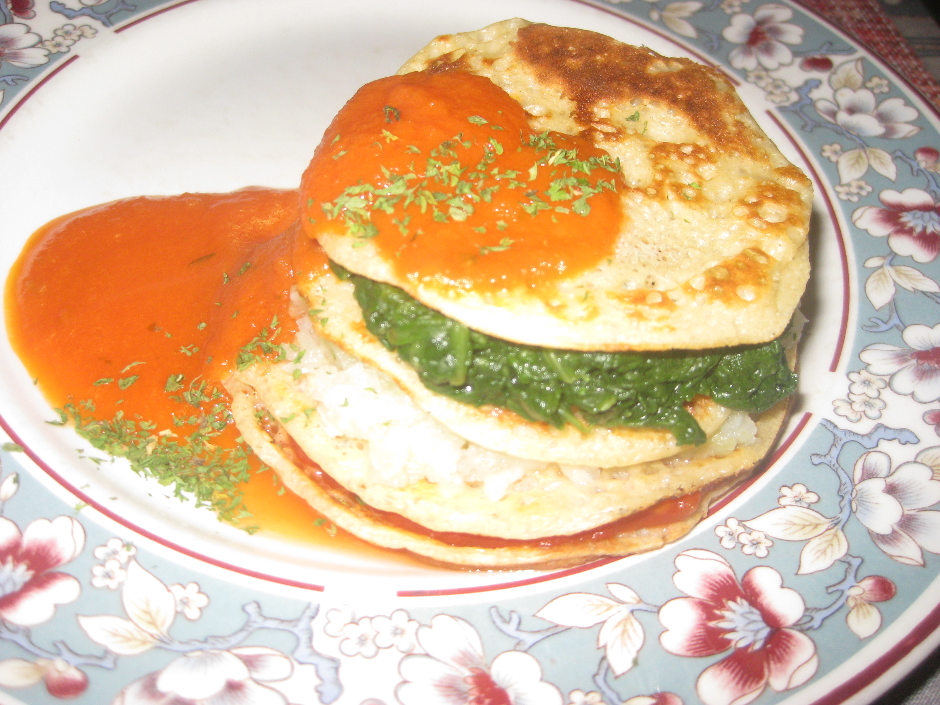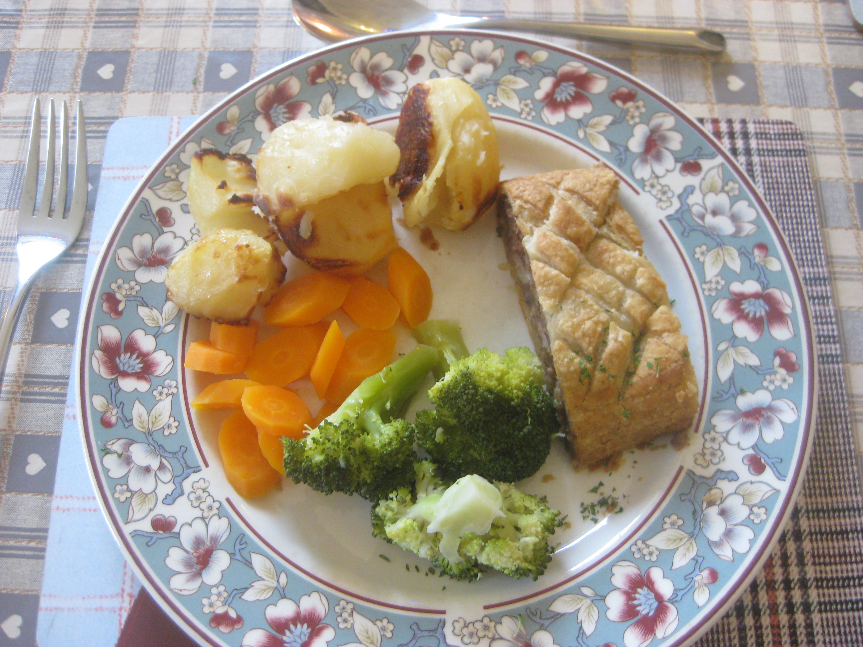 For the mains, Dr HH couldn’t turn down a chance to eat the fanciest food known to humankind:  a chestnut croute.  He found it very good, but a wee bit small.  Fortunately, we could help ourselves to lots of veg, gravy and roasties.  I gambled on some pancakes, which were nice but a little watery from the spinach, which was a shame as it diluted the flavoursome tomato sauce a bit.