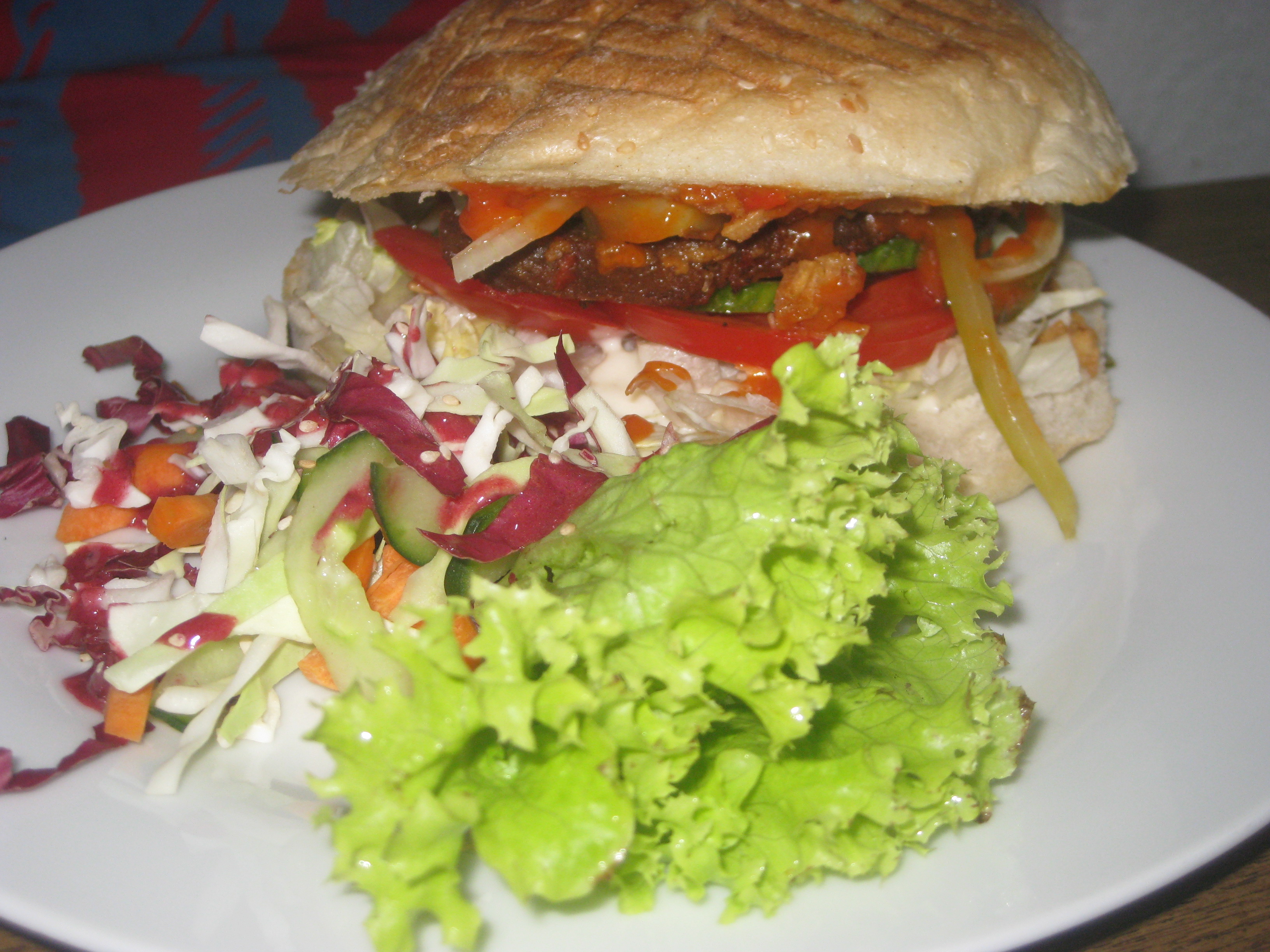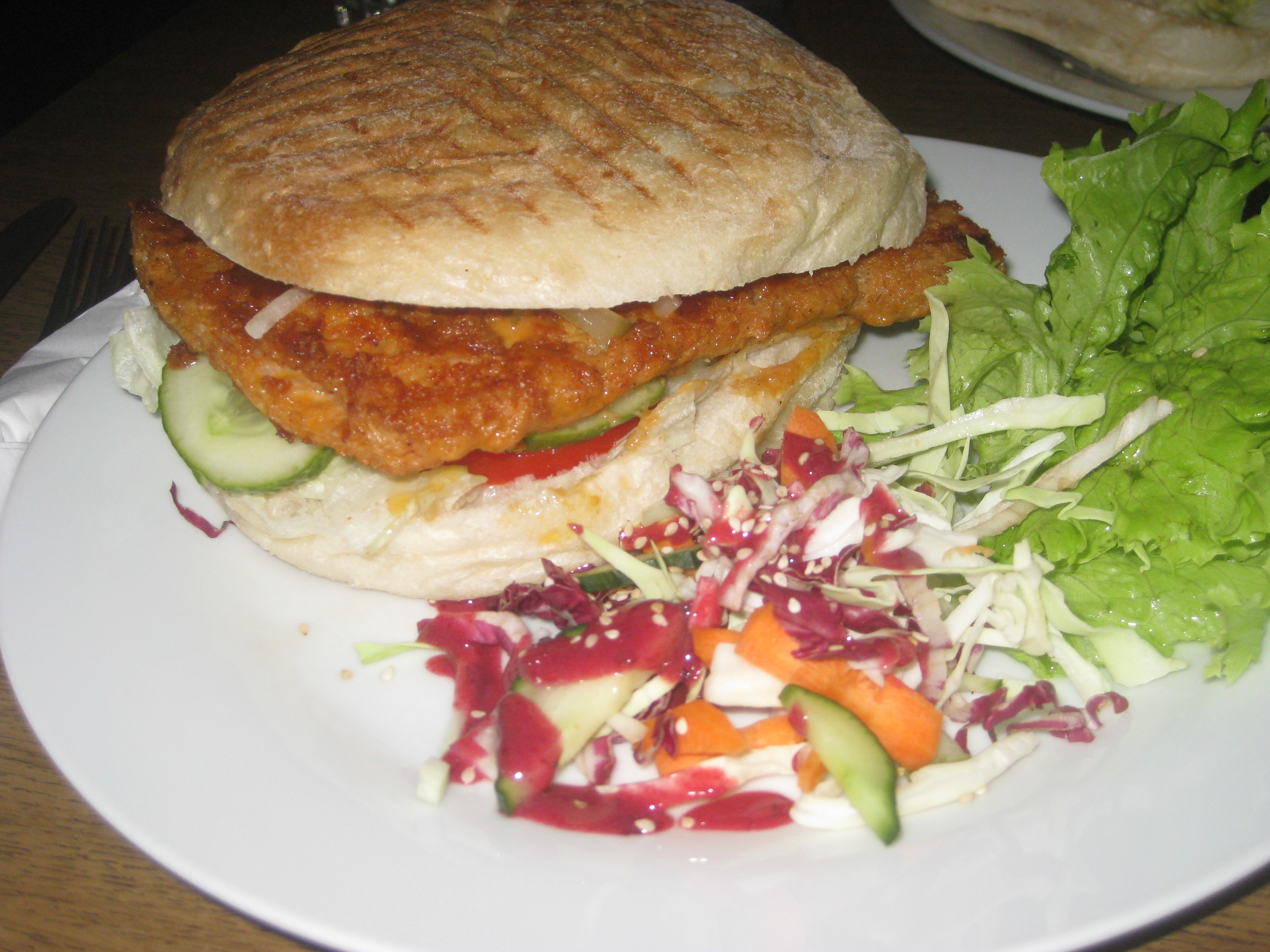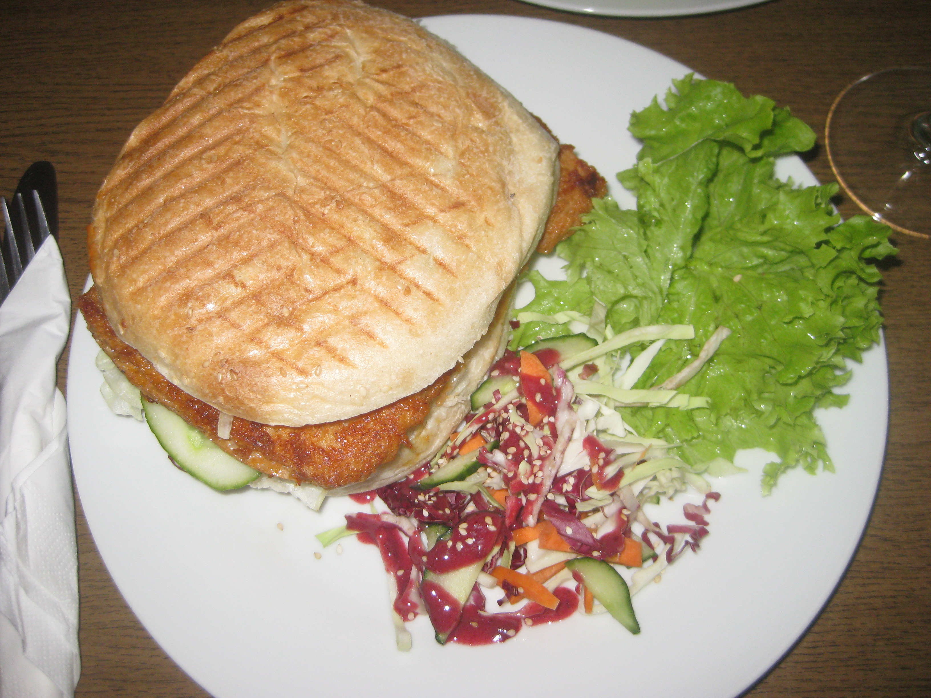 Falscher Hase is a nice, cosy little cafe in the Neustadt.  The food is anything but little, though.  It’s not an extensive menu (usually a sign of quality), but it has four different burgers and they caught our attention.  Burgers are available either regular size in a sesame bun, or XXL in Turkish flatbread.  We had to get the XXL, as we needed sustenance for the afternoon and there are no chips on the menu.  And the burgers were indeed huge!  Dr HH had the Satan burger:  a seitan patty with tomato and chilli sauce.  He said it could have been spicier, but was generally delicious.