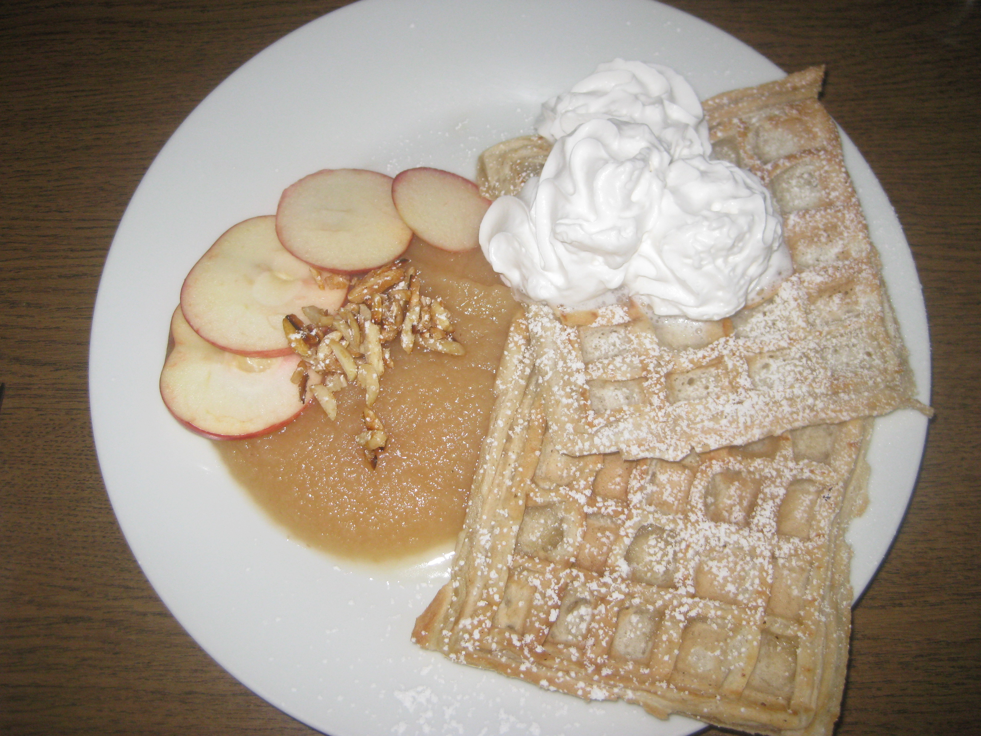 I was not remotely hungry after this beast, but as a general rule, if I see a vegan waffle, I eat a vegan waffle.  So Dr HH and I split the waffle plate, which handily came ready to be shared.  The waffles were a little flat, but were still delicious.  The cream was great, as were the sugary nuts, but I wasn’t really bothered about the applesauce.  Give me chocolate sauce any day!