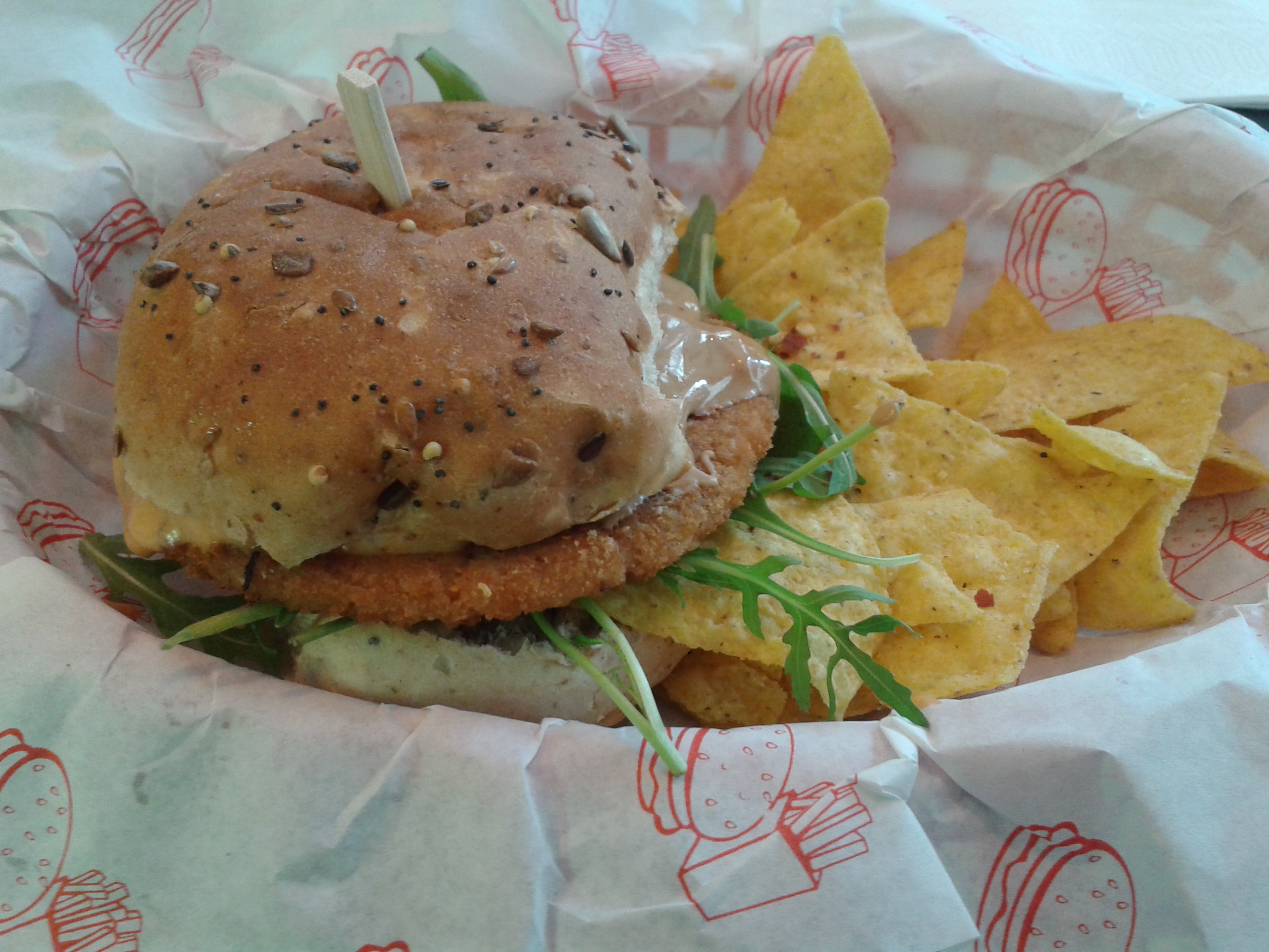 It’s a 100% vegan fast food joint with American diner-style decor. It’s in the process of moving to bigger premises and changing the menu, so it seems like they’re really taking off, which is great – and means they might be ironing out some of the things I’m not so impressed with. They have a small menu, which is always a good sign – except that at least twice when I’ve been, they’ve run out of the thing I asked for. The menu features a few kinds of hotdogs and a few kinds of burgers, plus a daily special. As someone who likes burgers that are not too saucy and are easy to eat, I tend to stay away from the specials, though for more adventurous eaters they look amazing. But the patties themselves (mock chicken or mock beef) are really good.