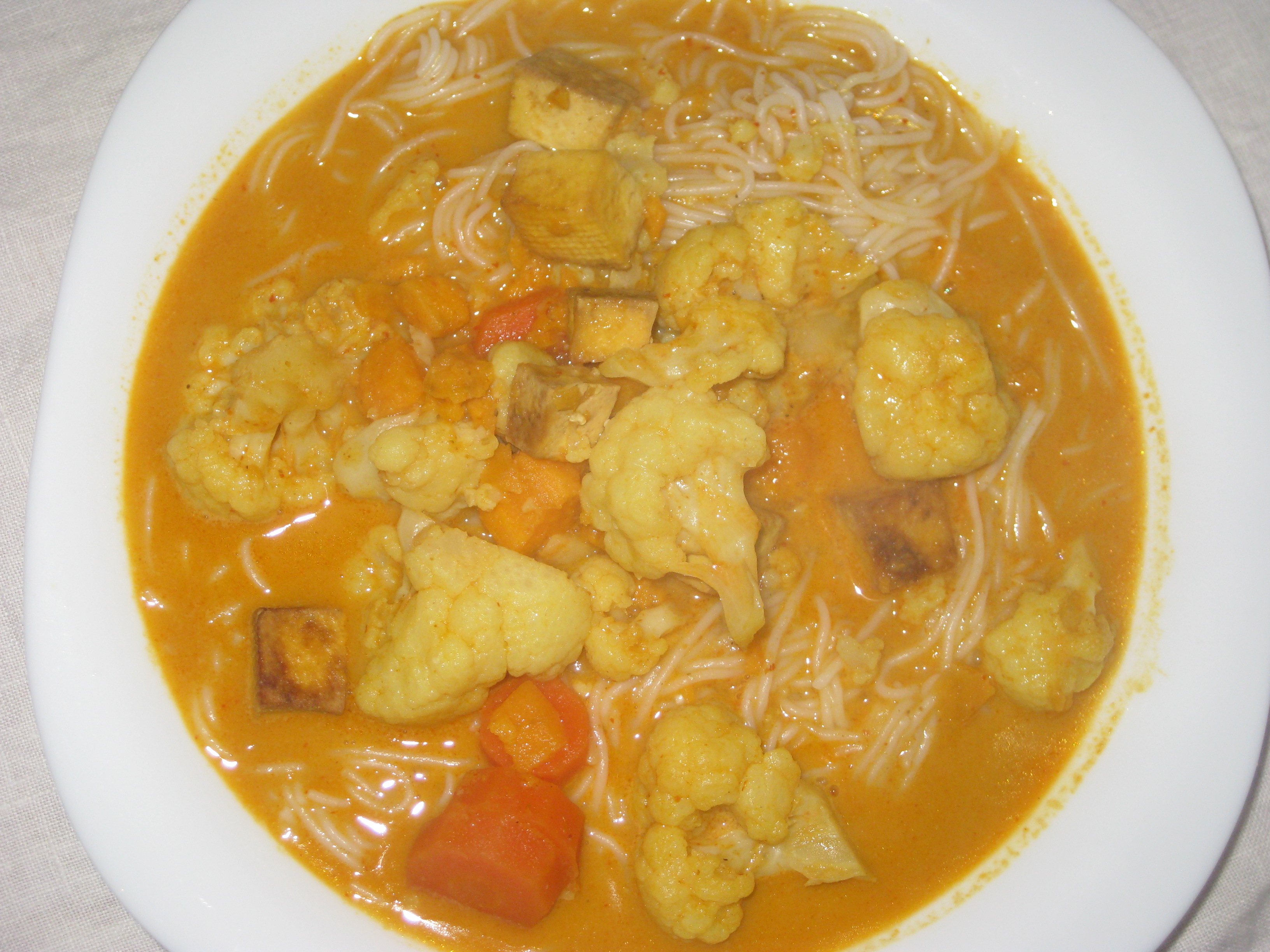 I made the khao soi noodles (Chiang Mai curry noodles) using shop-bought red curry paste because of a lack of time/ingredients, and my absolute delight at finally finding vegan curry pastes in Prague. I didn’t deep fry any leftover noodles, and nor could I find any mange tout to add a touch of green, but it was still really delicious. I used baked tofu instead of jackfruit as well. It was flavoursome and had a good mix of veg and extras.
