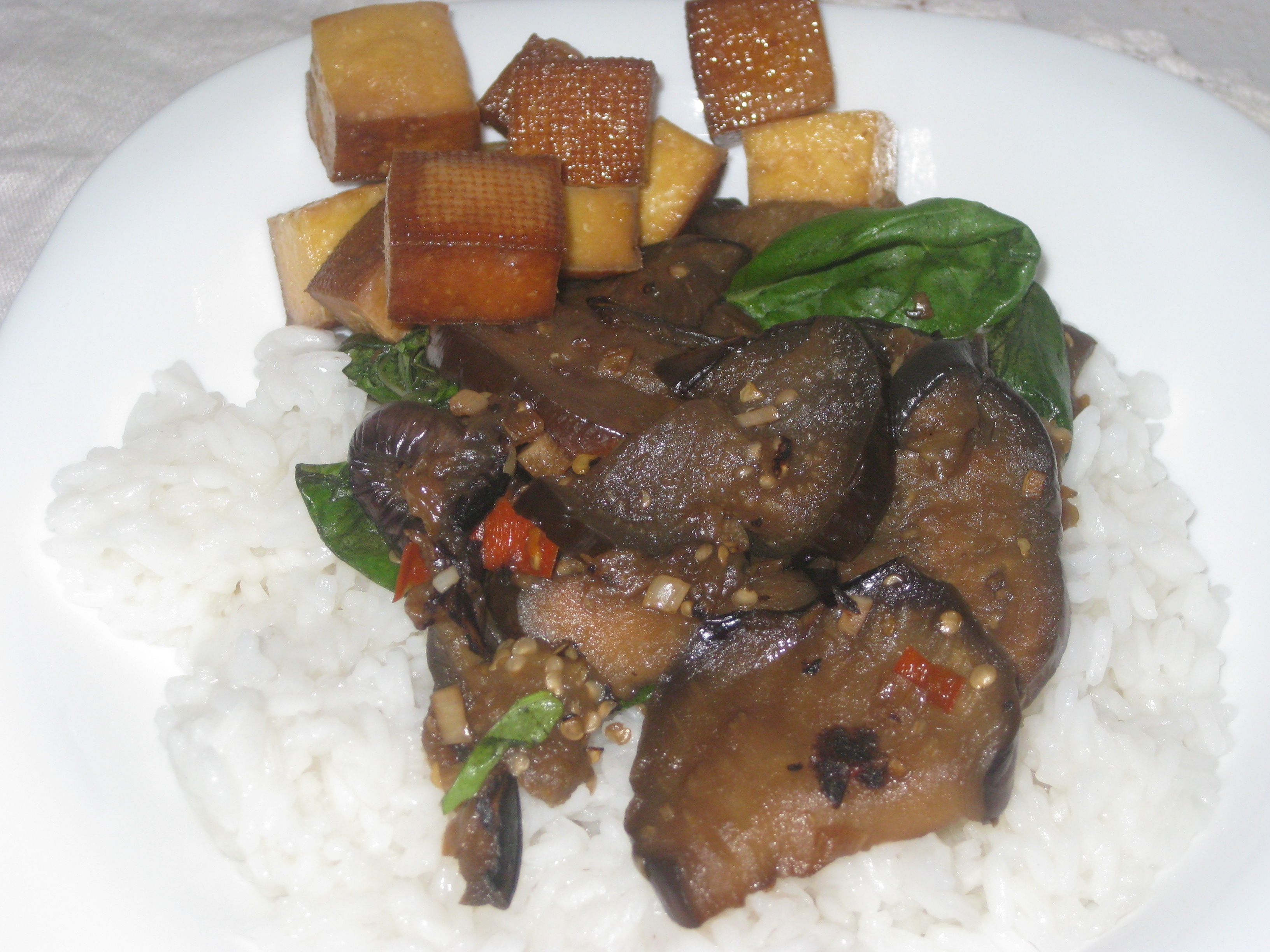 I really enjoyed the pad ka prao. According to the author, European basil leaves won’t cut it with this recipe, but I found it delicious anyway despite my insufficiently exotic herbs. The aubergine was tender and delicious, and certainly had a kick to it! I served it with some baked smoked tofu, so I was ready to fend off any “But where do you get your protein?” questions.