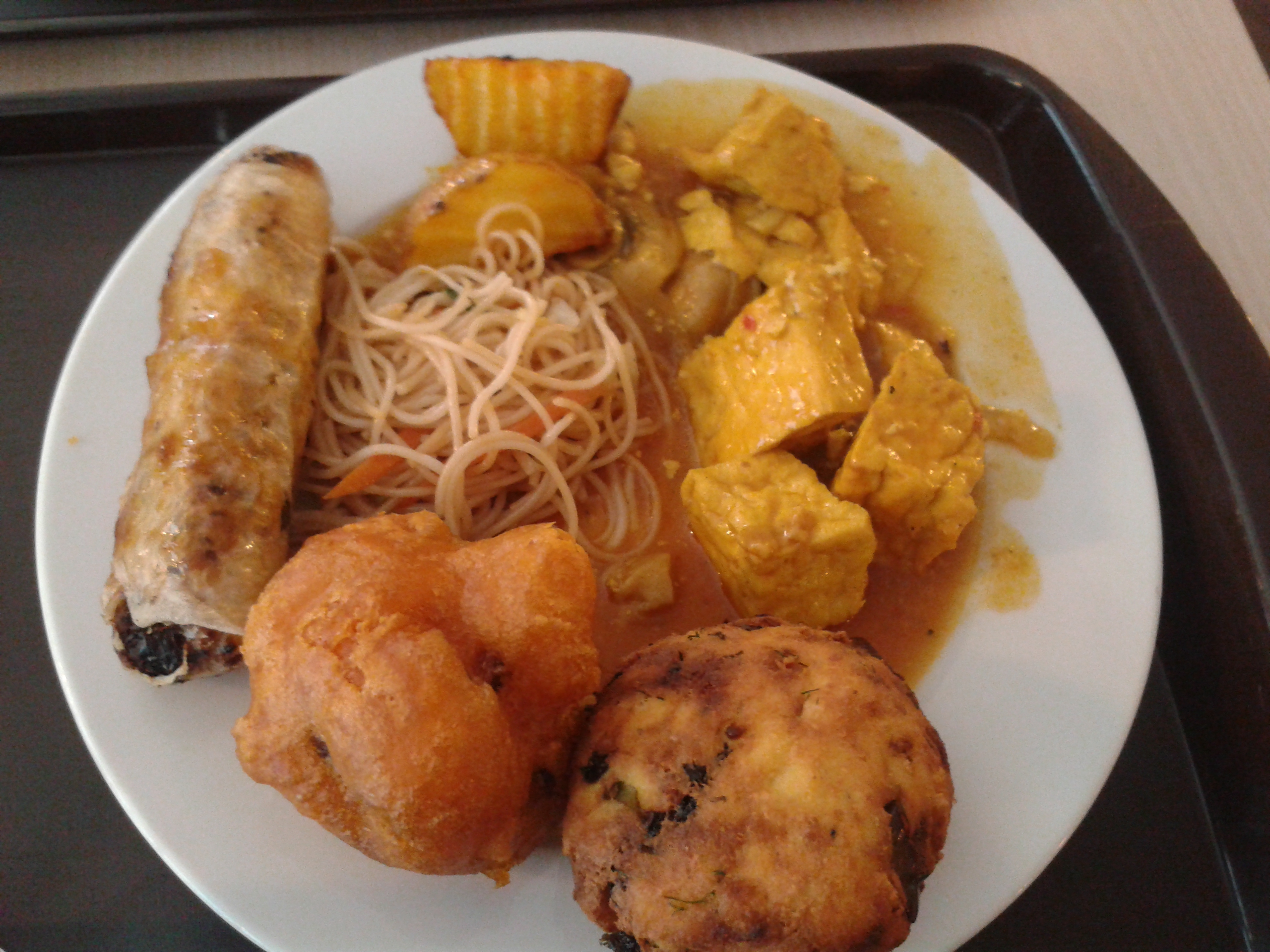 There’s always a lunch time buffet on, and we went a few times on Saturdays for some fried, meaty dishes. There are always deep-fried options, most commonly the spring roll and cauliflower floret pictured here. Then there are noodles, rice, vegetables and meaty main dishes, and a salad counter too. However, a lot of the dishes are very similar. The main dishes are usually tofu-based, rather than a more exciting mock meat for variety. The spring rolls have the same eggy filling as the crispy ball at the front of the picture, and there was even another helping of this with spicy sauce dolloped over it.