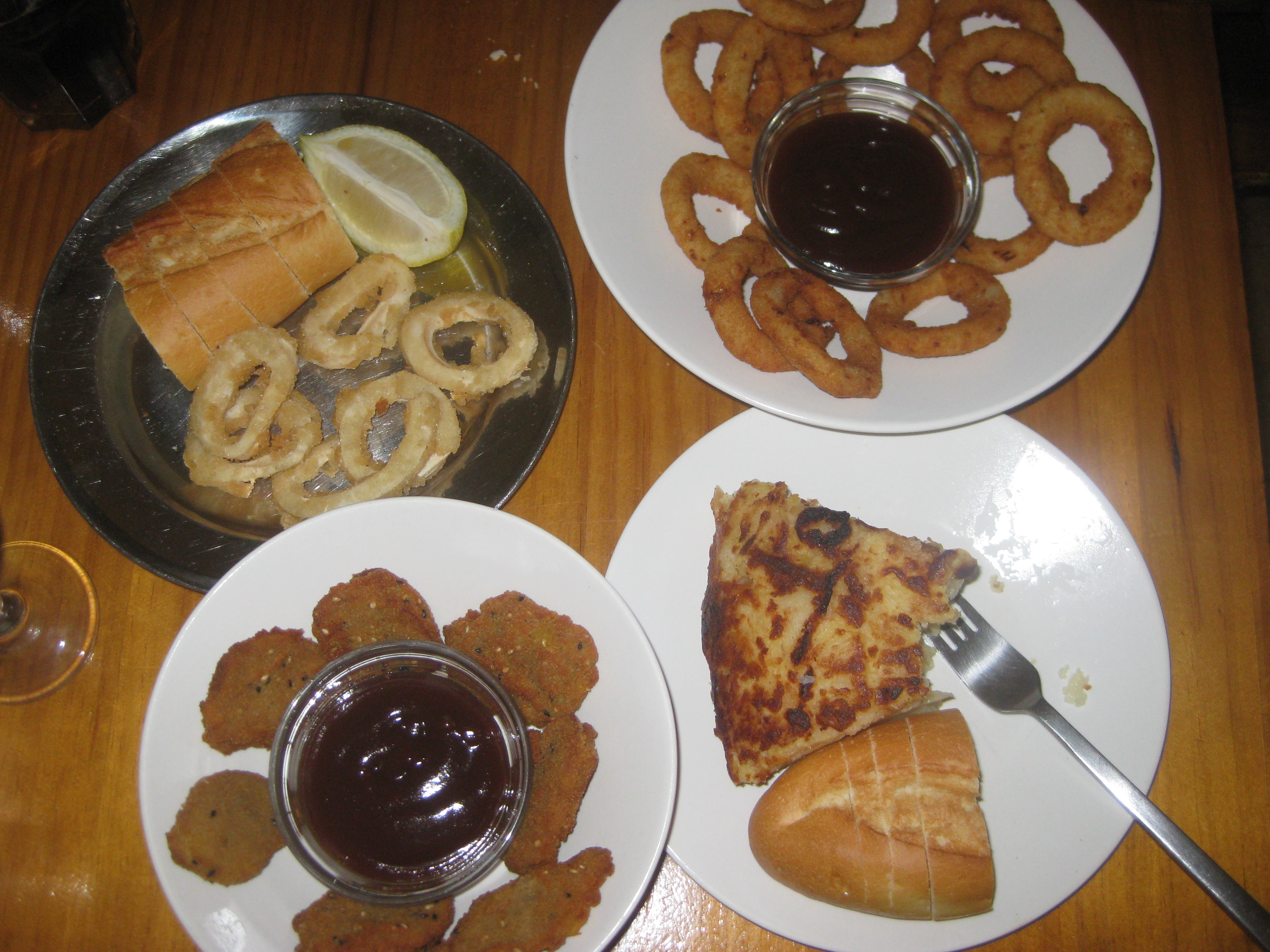 The onion rings were less impressive – the batter wasn’t as good as that on the calamares, and they seemed to be made from mushed onion rather than actual rings.  They came with a tasty BBQ sauce which livened them up a bit.