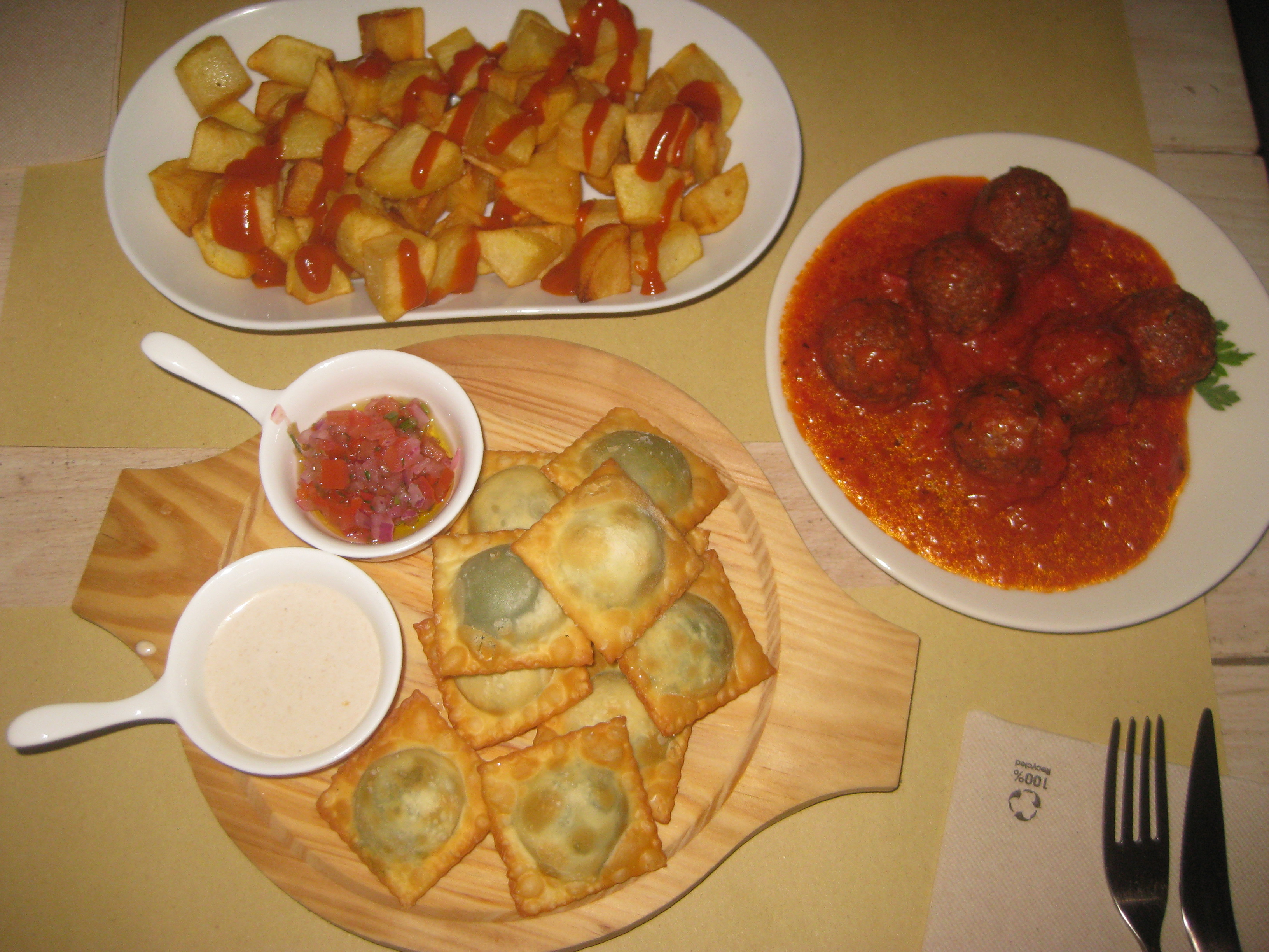 We ordered three dishes to start.  Of course, we had some patatas bravas.  The little cubes of tomato were perfectly crispy, and the fiery sauce was only drizzled on, so it was quite easy to control the spiciness (you can also order the non-spicy sauce).  We added a squeeze of alioli, which was lovely and garlicky.