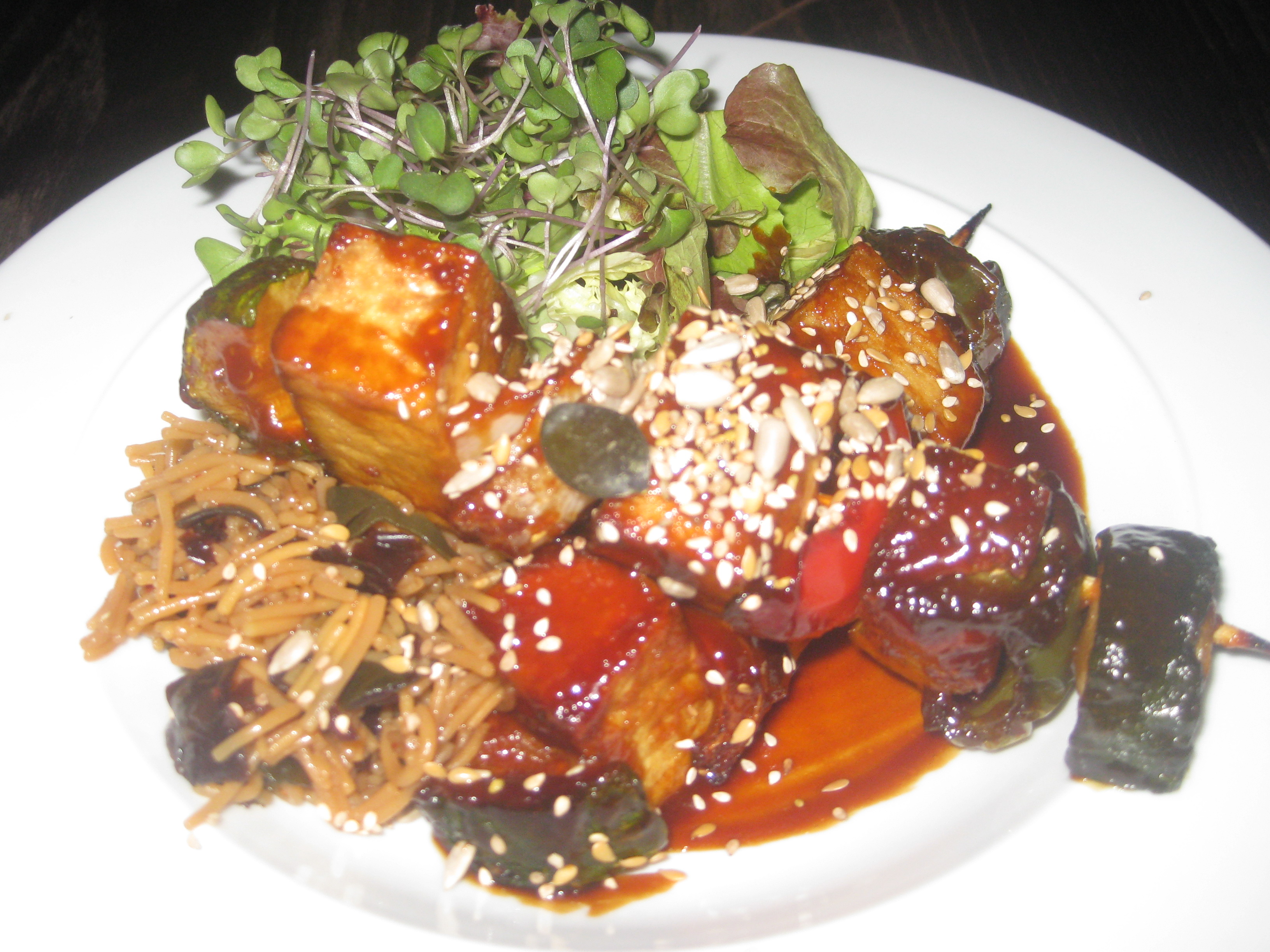 We considered tapas again, but decided to get some mains instead.  I got the brochette of smoky tofu, which had a lovely sticky, sweet marinade and crunchy sesame seeds.  The vegetables and glass noodles were tasty and filling, though the salad leaves were not dressed, which is a shame.