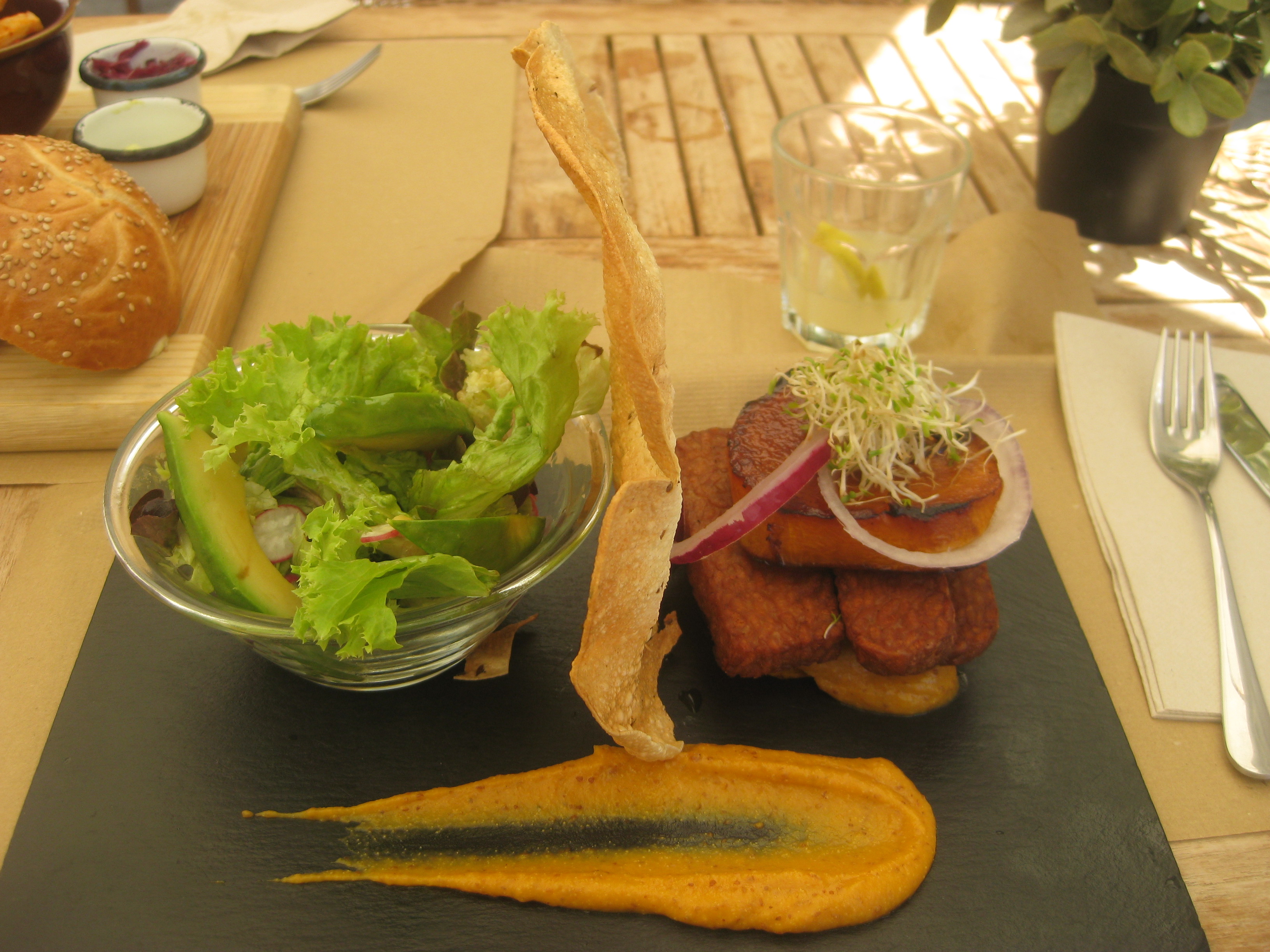 Dr HH’s dish was somewhat less coherent. We thought he’d ordered an Indonesian sandwich, but this is what he was served. It involved a sweet potato and tempeh tower, avocado salad and a papadum. It was a bit baffling, and it in no way tasted of Indonesia. This place probably wouldn’t be on our list if we returned to Valencia.