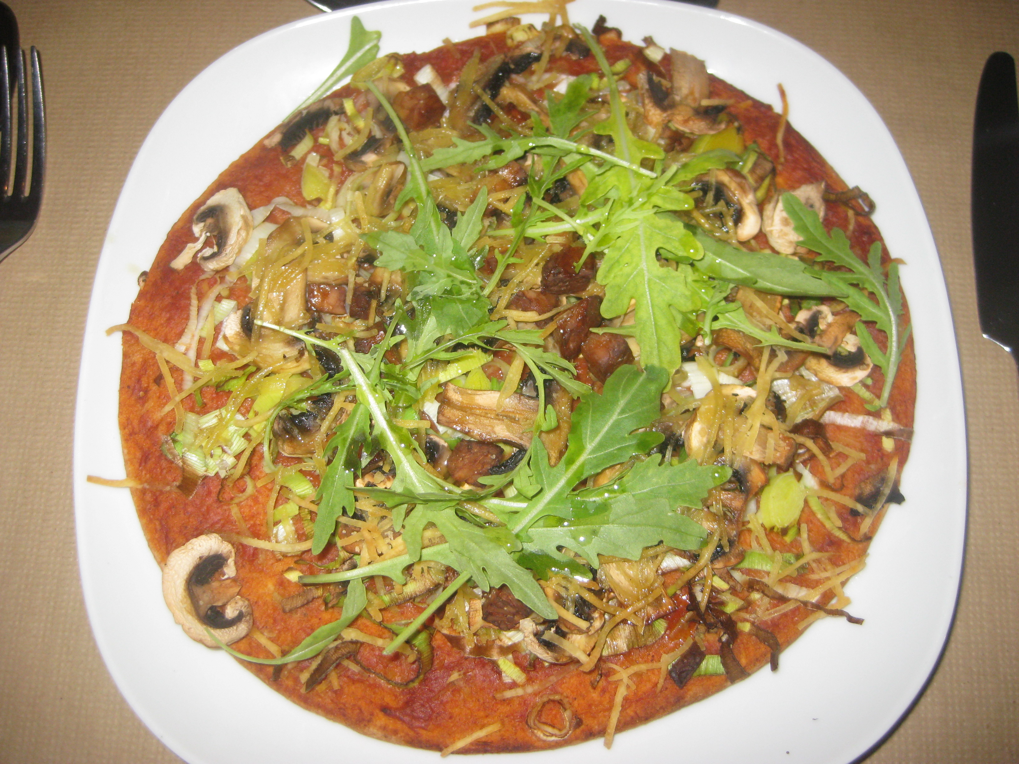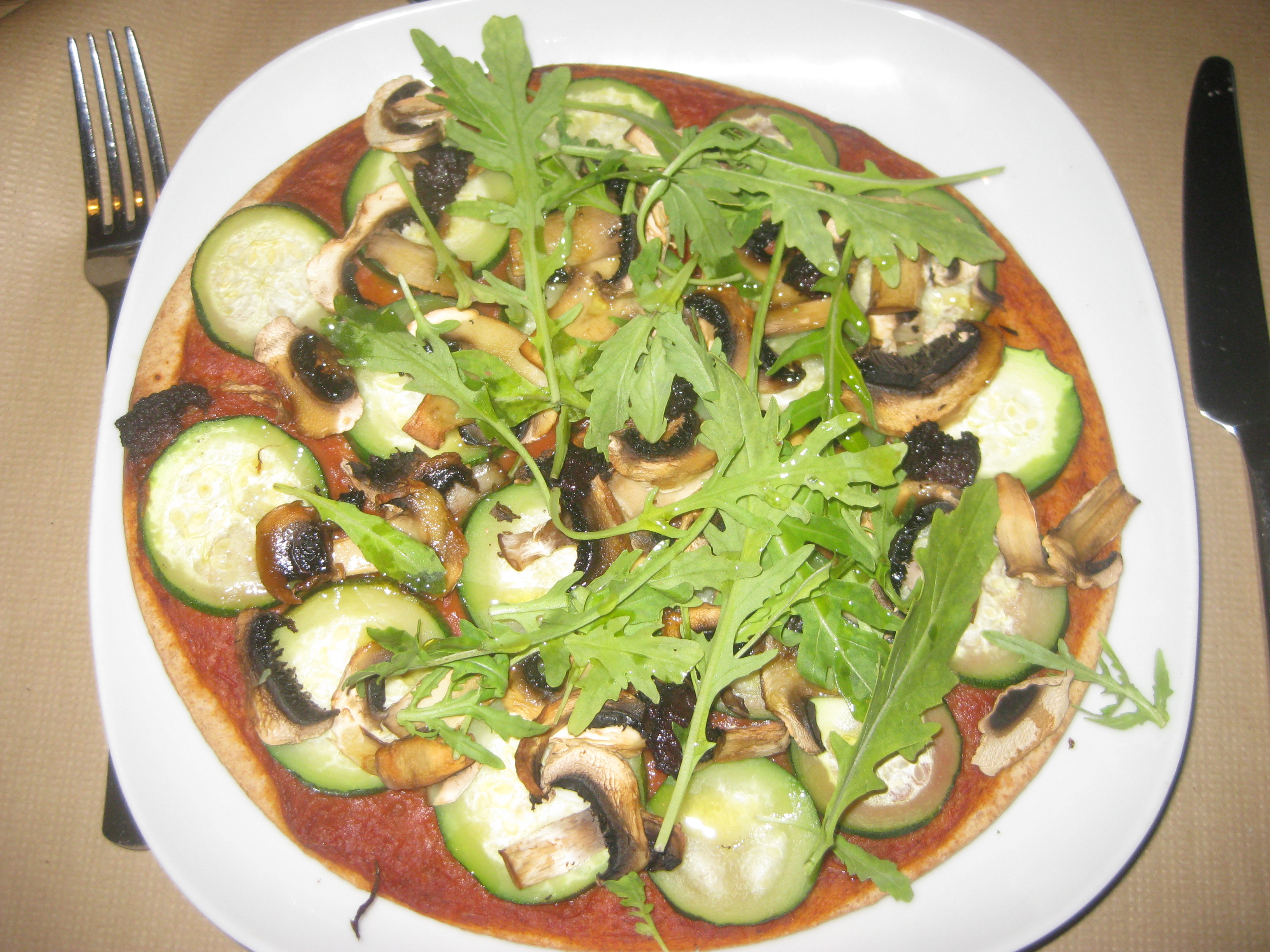 Mine was the coco-cheese pizza. The base was lovely and crispy, and it was topped with mushrooms, leeks, tempeh bacon cubes and tasty coconut cheese. Also, lots of rocket, which I hate, but at least its’s easily picked off. Both pizzas were really good, but small for the price. I suppose this is the price you pay for organic food!