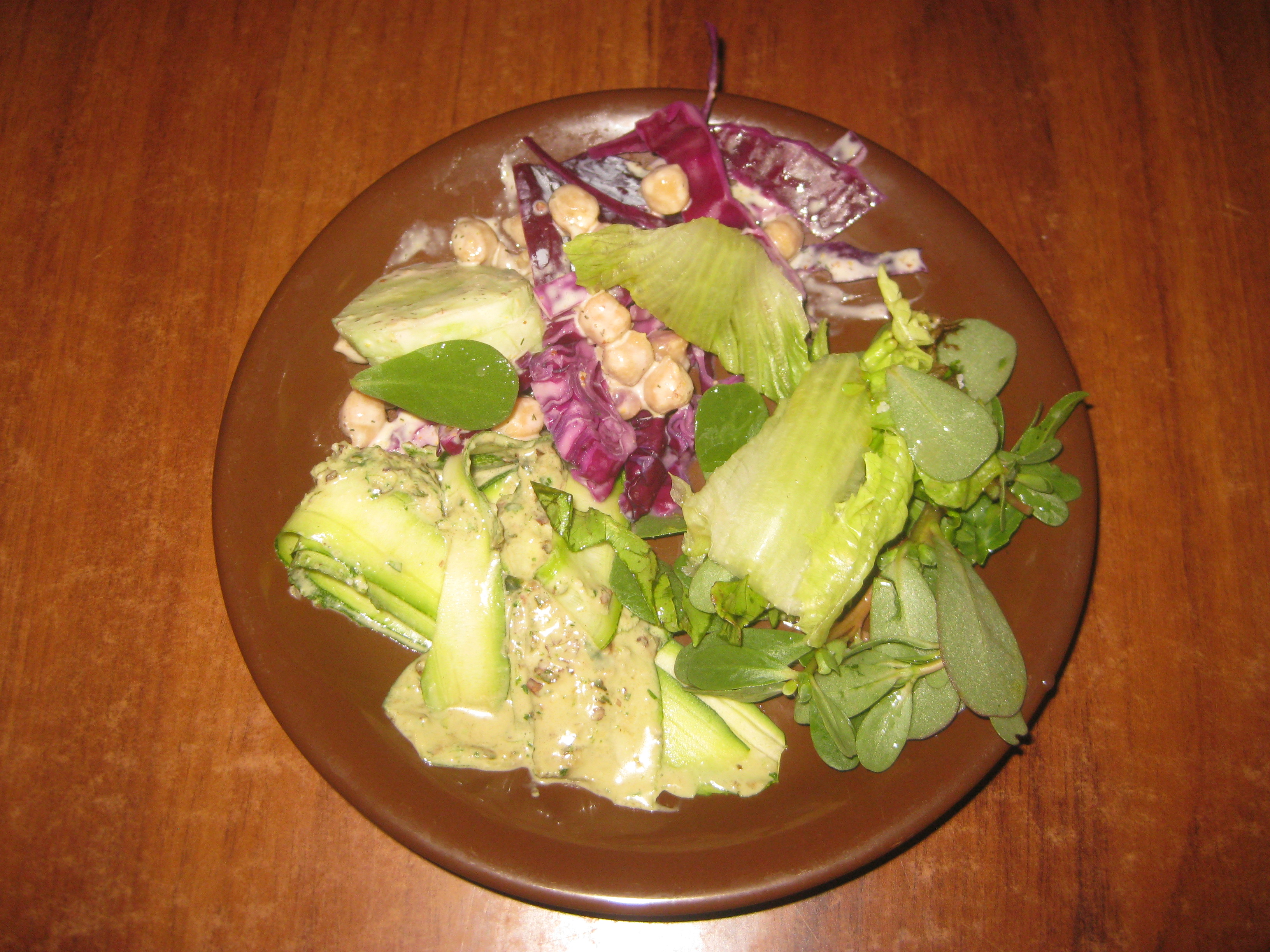To begin with, there’s a serve yourself salad bar. We enjoyed these amazing courgette ribbons in pesto and chickpeas with red cabbage. We were also served a green smoothie.
