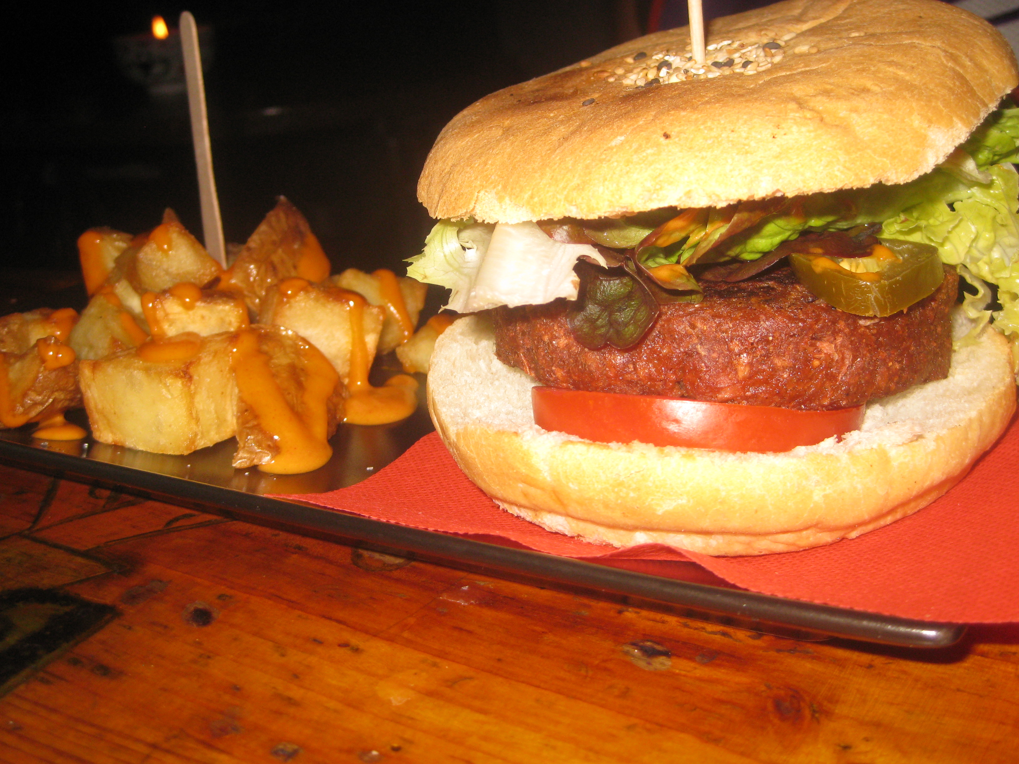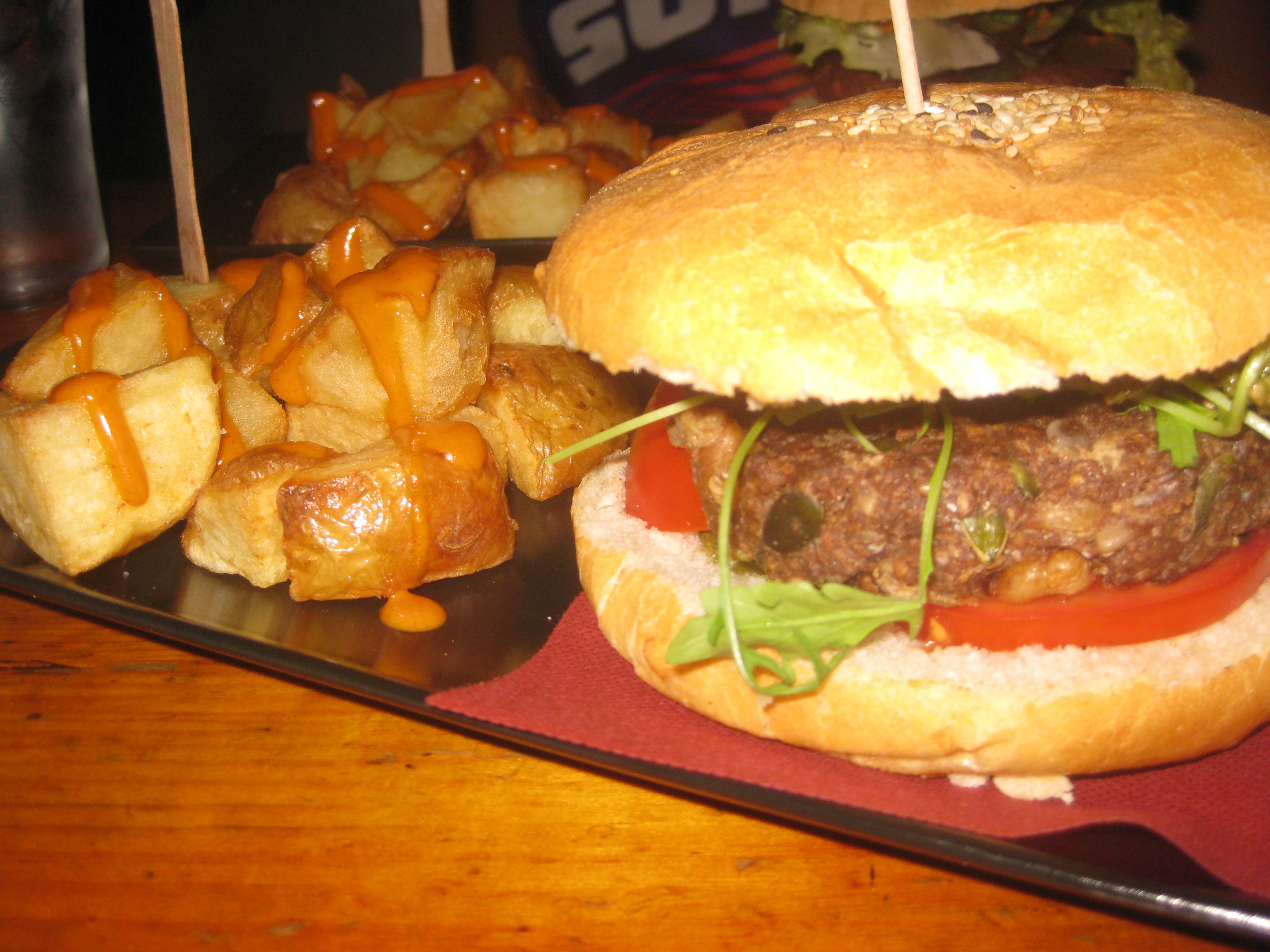 In Cat Bar we had some very impressive burgers.  It’s one of the few places in Barcelona (and possibly in the whole of Spain) which serves food continuously in the afternoon, allowing hungry Brits to eat at a respectable hour like 6pm, rather than battling on till some ridiculous time around 9pm when we should all be tucked up in bed.  Yes, I liked Cat Bar.  There were about 7 burgers on the menu, and you order on a little form that you take to the bar.  This is Dr HH’s Mexican Red, which he said was pleasantly spicy and had good structural integrity, which is very important – nobody likes a burger that collapses in your hands.