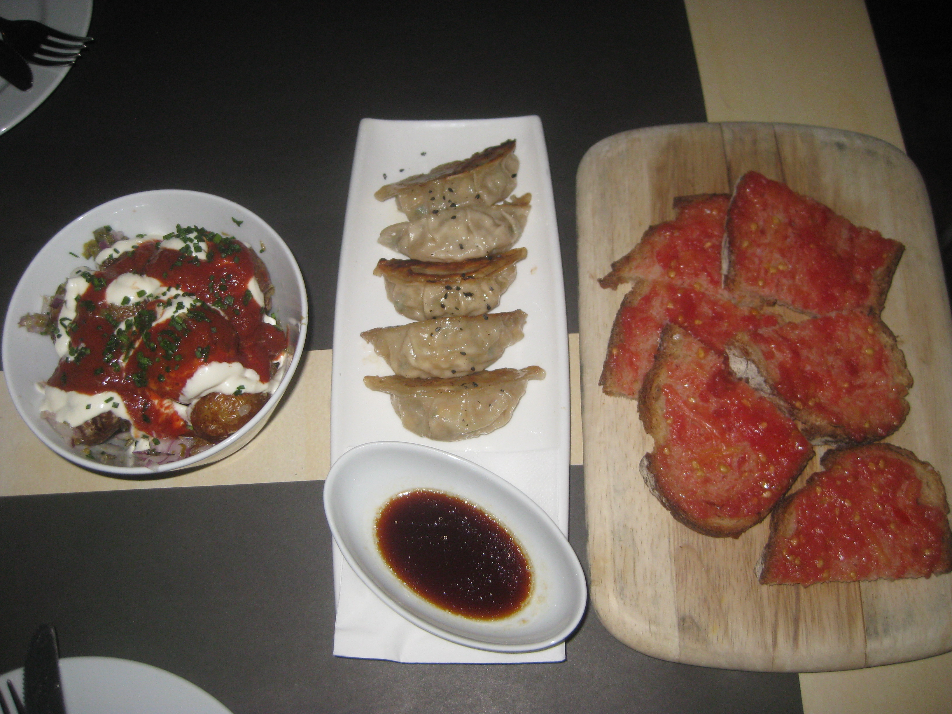 And finally, we ate at one of the few non-vegan places of our trip:  Rasoterra.  It was quite fancy, and they only just squeezed us in without a reservation, so I would recommend making one if you want to go.  It definitely wouldn’t be my top recommendation though.  After two weeks of all-vegan eating, it was a little disappointing to be back on a reduced menu.  The vegan tapas dishes were not plentiful, and there was only one vegan wine available by the glass (fortunately I am not at all particular).  We got all three vegan tapas:  the tomato bread was basically what you would expect, the veg and tofu gyoza were lovely, and the patatas bravas were like mini jacket potatoes:  crispy and delicious, and very different from the other potato dishes we’d tried.  It was all fine, but generally unremarkable.  All in all, I found the tapas scene in Barcelona a bit underwhelming, either unexceptional or too expensive.
