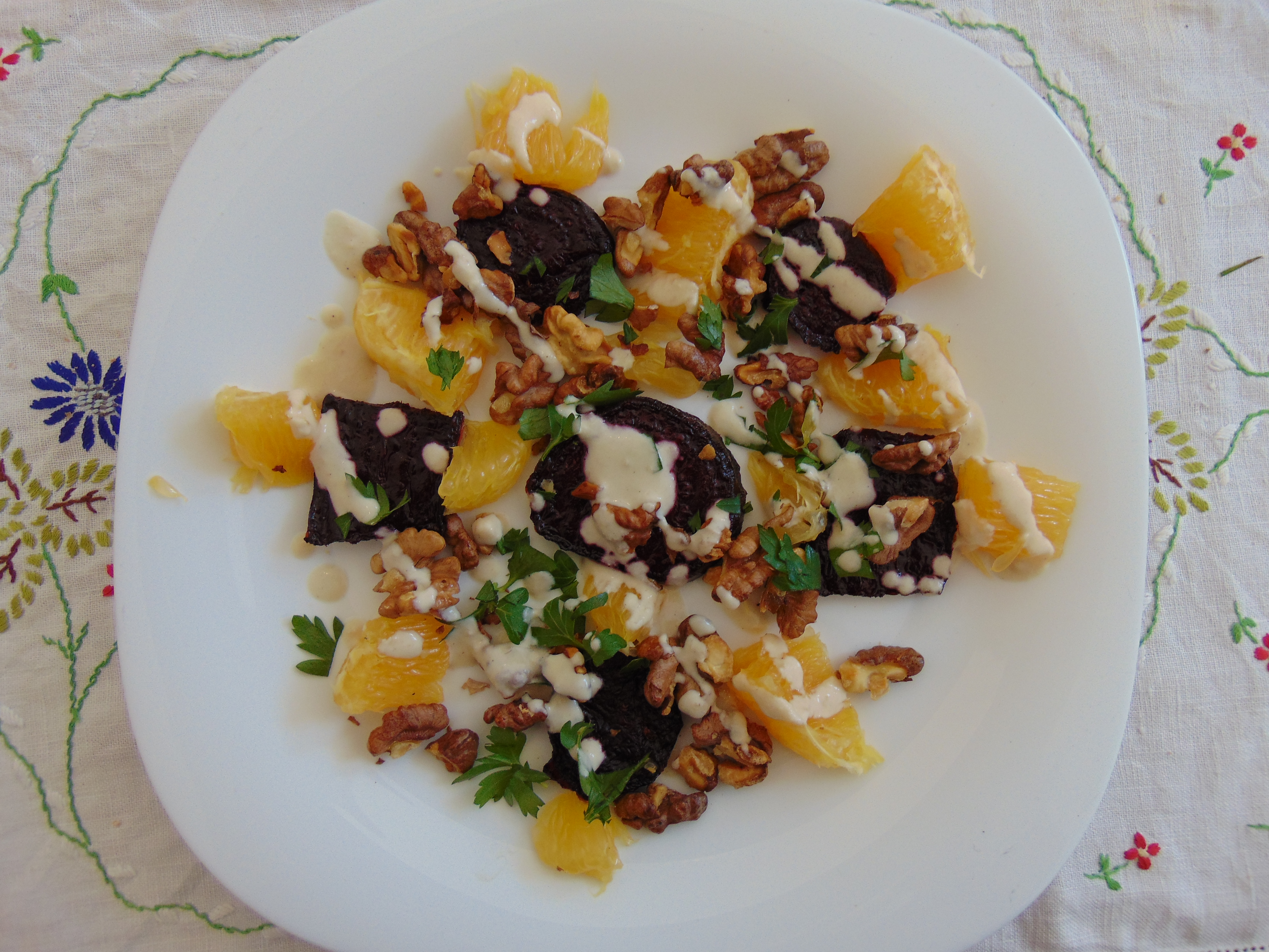 I threw together the Beet, Orange + Walnut Salad with Lemon Tahini dressing for a lunch one day. I was mildly concerned when I tried the dressing on it’s own and it seemed a little bitter but it was fine when combined with the sweetness of the beetroot and orange. There was a bit too much orange in the salad. The recipe has an equal amount of beetroot and orange and it would probably be better with less orange. The walnuts added some nice crunch and it was worth making for the visual experience.
