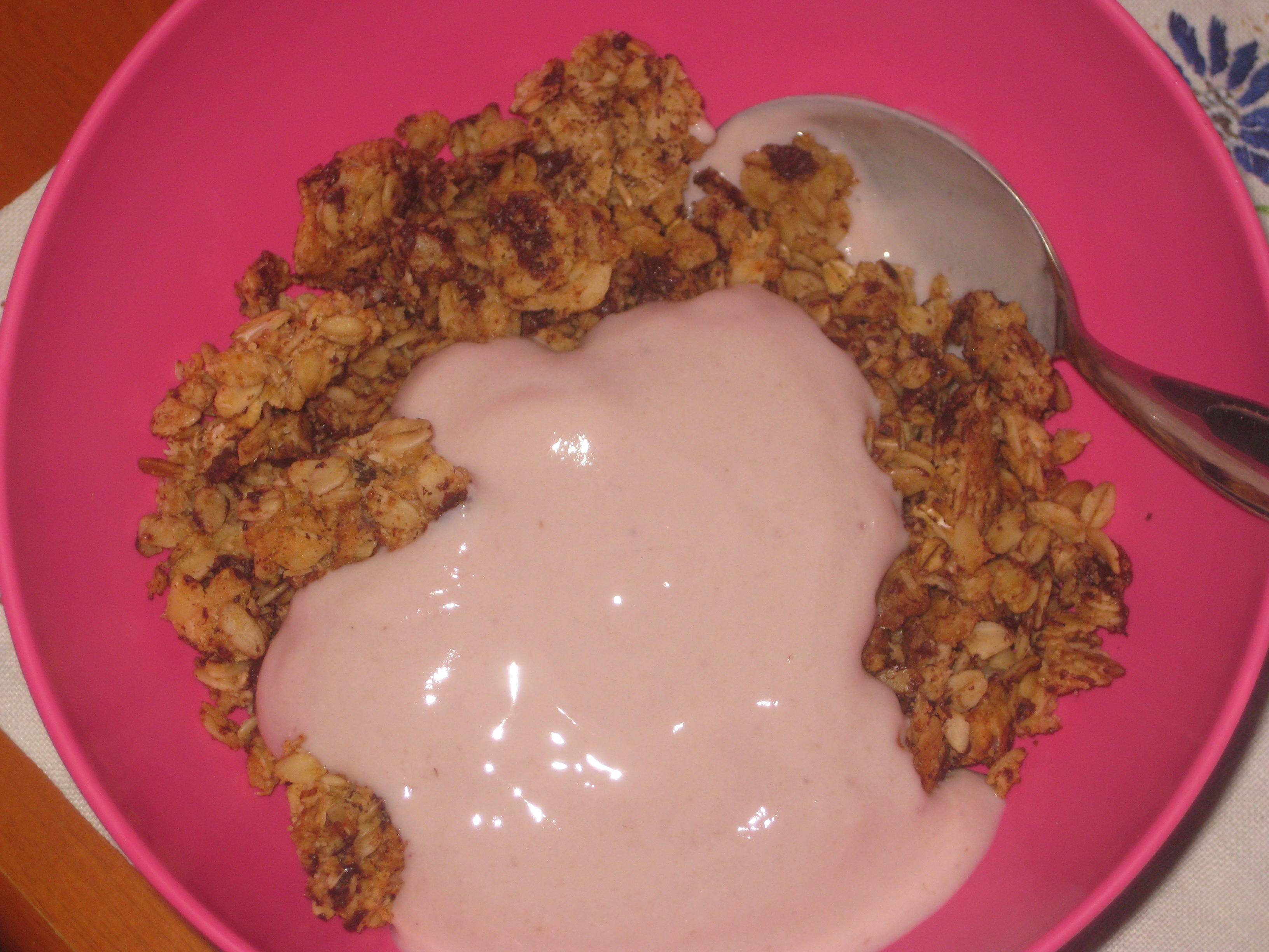 Most of my breakfast efforts went into making granola. My first attempt at granola was the Homemade Hippie Cereal. This was one of the first things I made from this book and a toasted mixture of nuts and syrup is meant to be mixed with puffed rice to make a breakfast cereal. I quickly scanned the recipe and saw a sentence that said it could be served as granola without the puffed rice. It eventually dawned on me that a bowl of crunchy sweet nuts may not have stretched to too many breakfast portions so I had to do some freewheeling. I added 3 cups of oats and various quantities of extra sticky ingredients and came out with something reasonably close to granola. It didn’t stick together too much and tasted a bit too sweet. The lesson here is that when freewheeling, perfect results are not guaranteed.