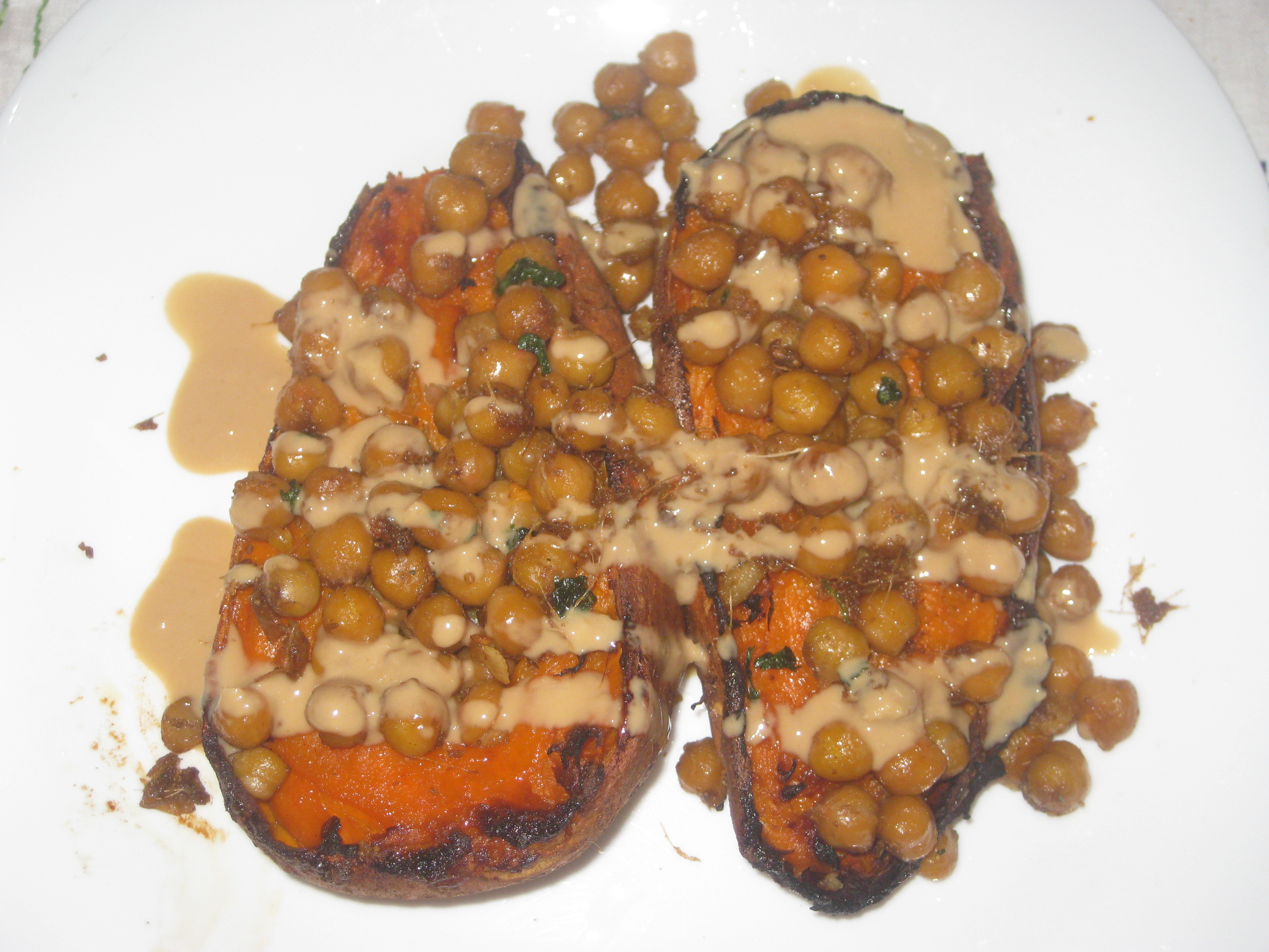 Sticking with the Thai theme, next up are the Thai Baked Sweet Potatoes. Sweet potatoes have been a little tricky to get a hold of in Prague. Marks and Spencer has been the only place with a regular supply so imagine my joy when I stumbled into our local supermarket and found sweet potatoes. Not just any old sweet potatoes, but sweet potatoes the size of a small moon! This from a supermarket that is usually chock full of all the veg you don’t want with most of it looking past its best. The fried chickpeas had some good flavours in them, but the whole dish was lifted by the zingy ginger tahini sauce. It was bursting with great flavour from the soy, lime and of course ginger. It all tasted very exotic even though it looked a bit beige.