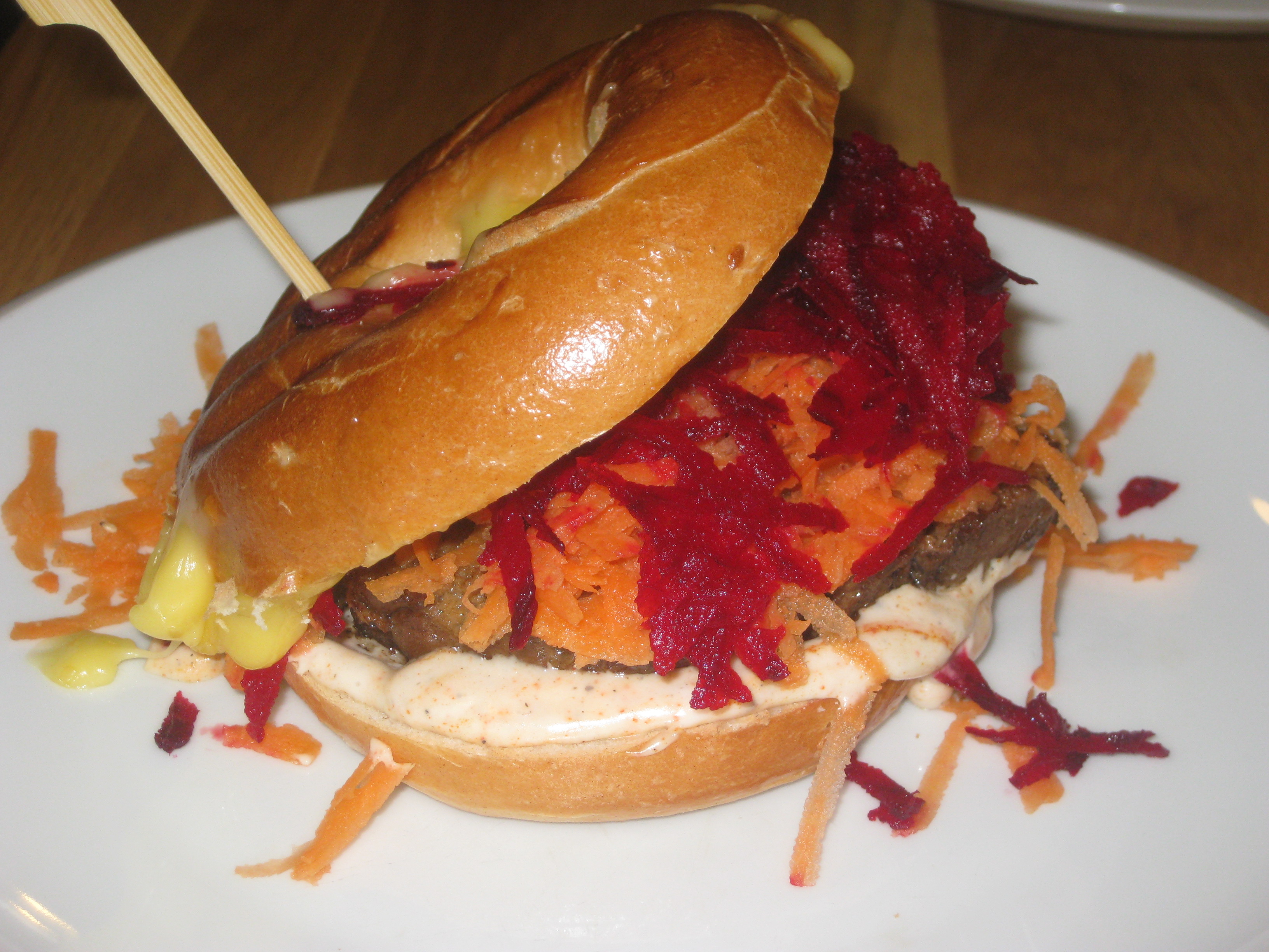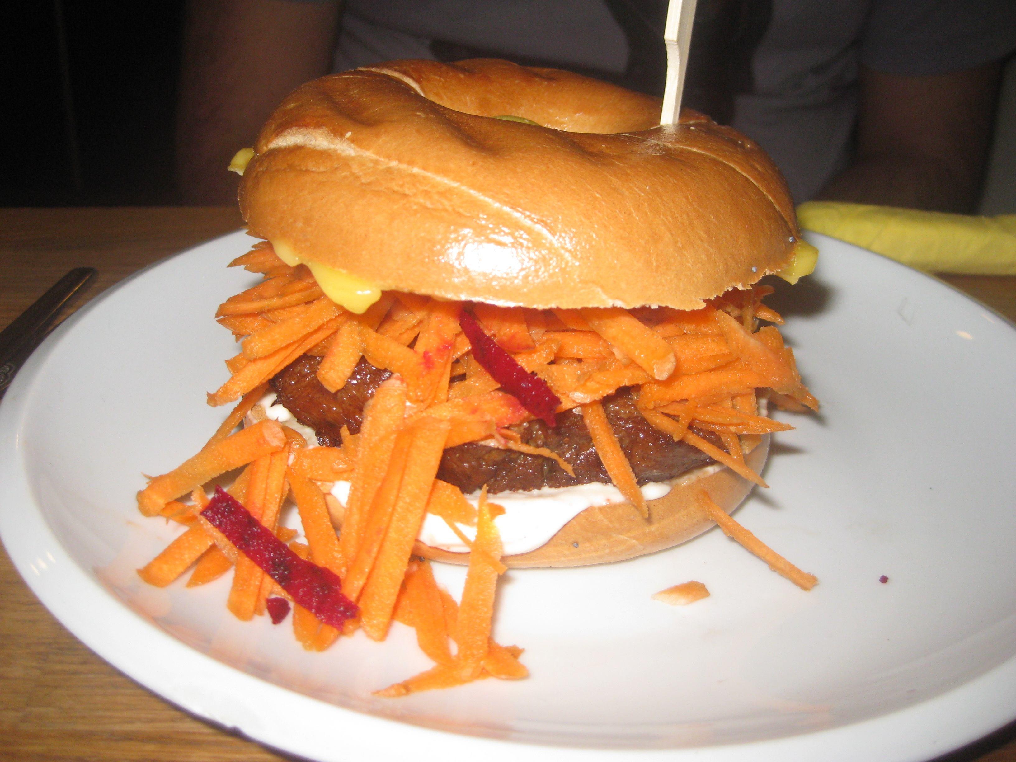 The seitan comes in gigantic slabs, really succulent and meaty. The cheese is thick and gooey, just melting. There is some spicy mayo on the bun. Nowadays it doesn’t come with the carrot and beetroot in the picture, but standard lettuce and tomato, along with some fried potato slices. Oh, it’s good.