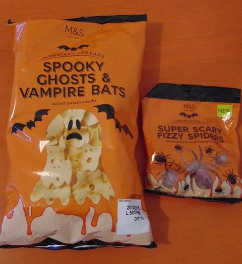 Although the shops here are full of different varieties of pumpkin and squash, I decided to forego the obvious cooking choices and for this challenge I have just bought something autumnal.  And what could be more appropriate for October than accidentally-vegan Halloween treats?!  I’ve been relying on Marks and Spencer to provide some seasonal treats, and they haven’t let me down.