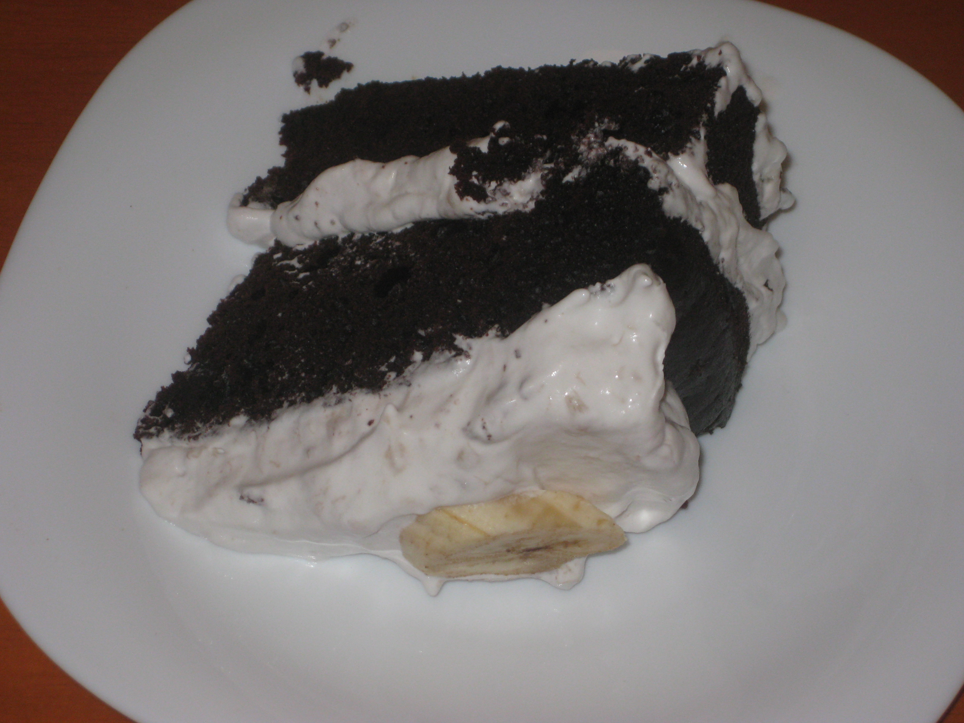 Chocolate banana cake, two ways: a really good chocolate sponge sandwiched with gooey and delicious banana cream. And a sturdier, perhaps better one with gooey banana slices in the middle.