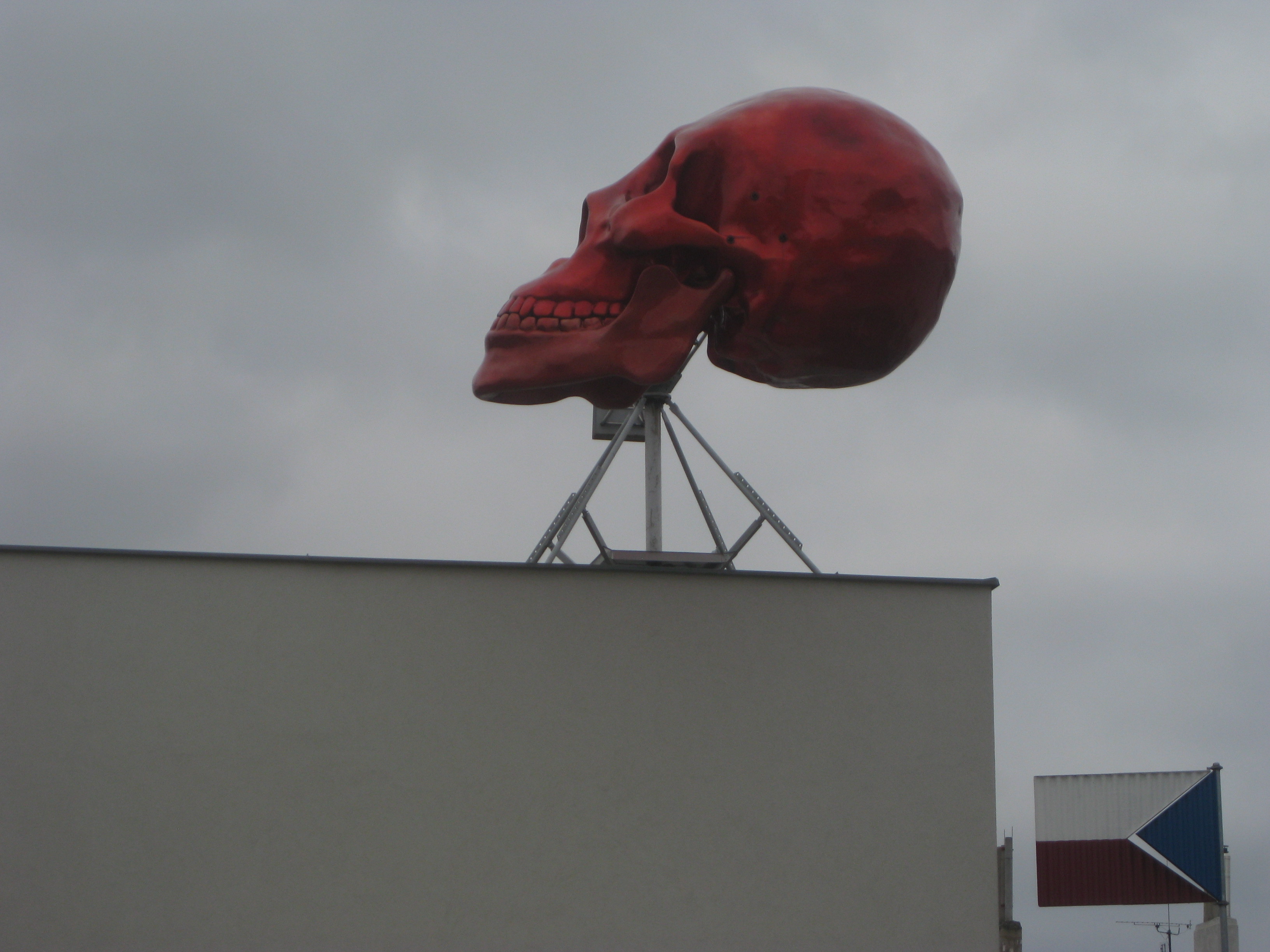 The outside terrace has a view of the rotating red skull pictured up top, and a Jesus made of shoes.