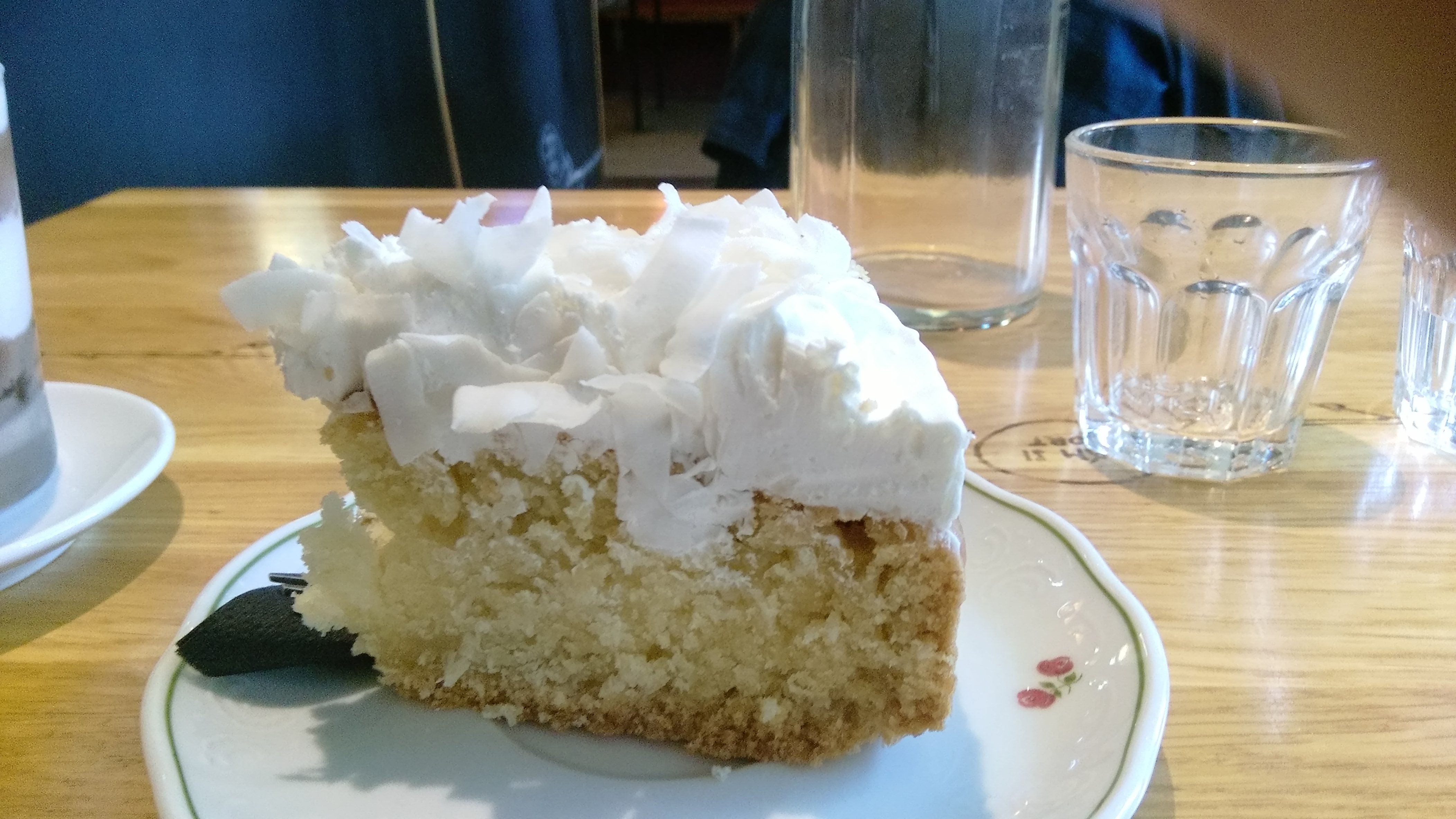 Gluten free chocolate and coconut cake: the sponge was a bit dry, but the cream on top was sublime. That is my kind of cake ratio.