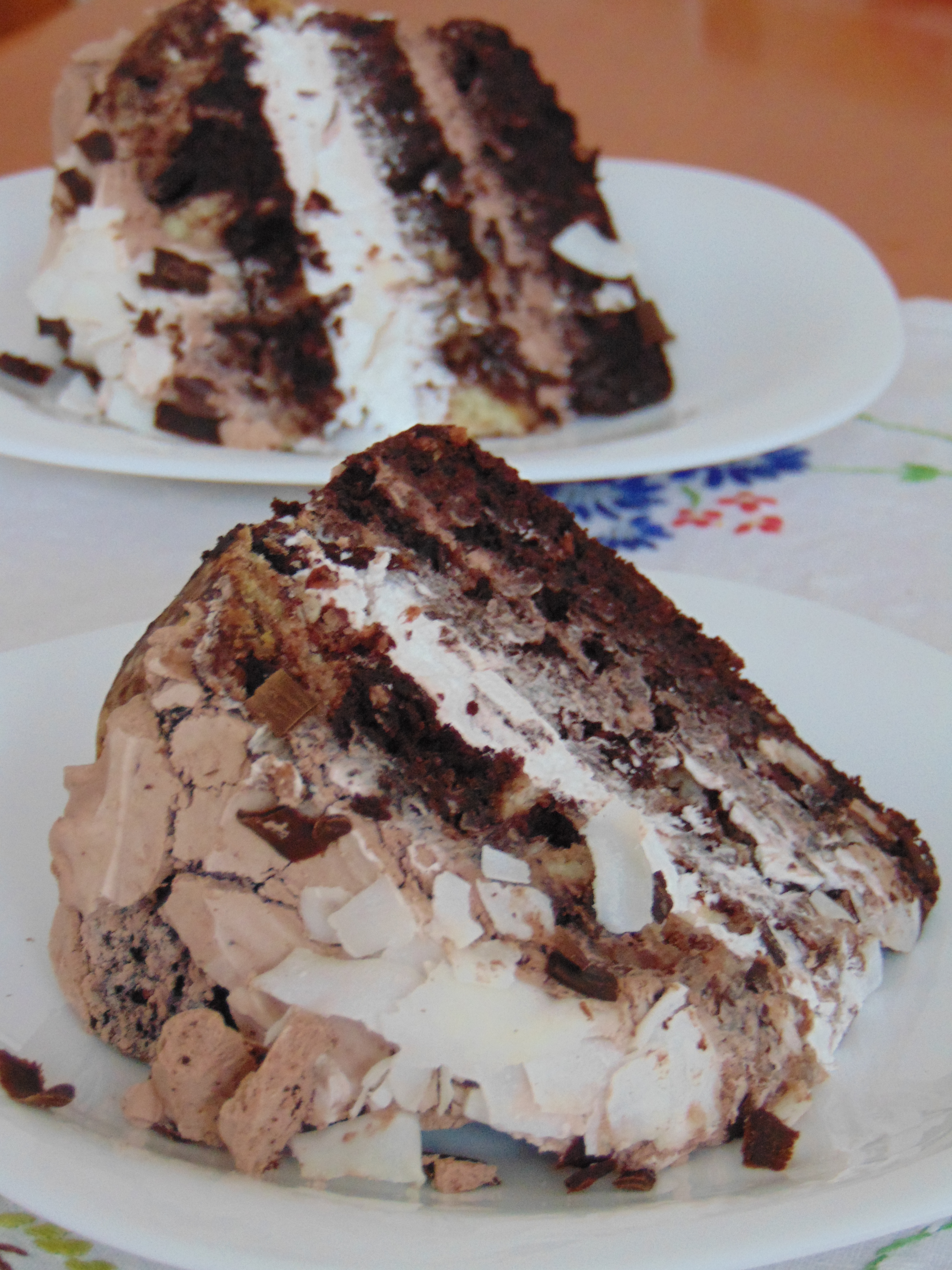 Giganto chocolate coconut cake: it was described to us as a “skyscraper”, as all cakes should be.
