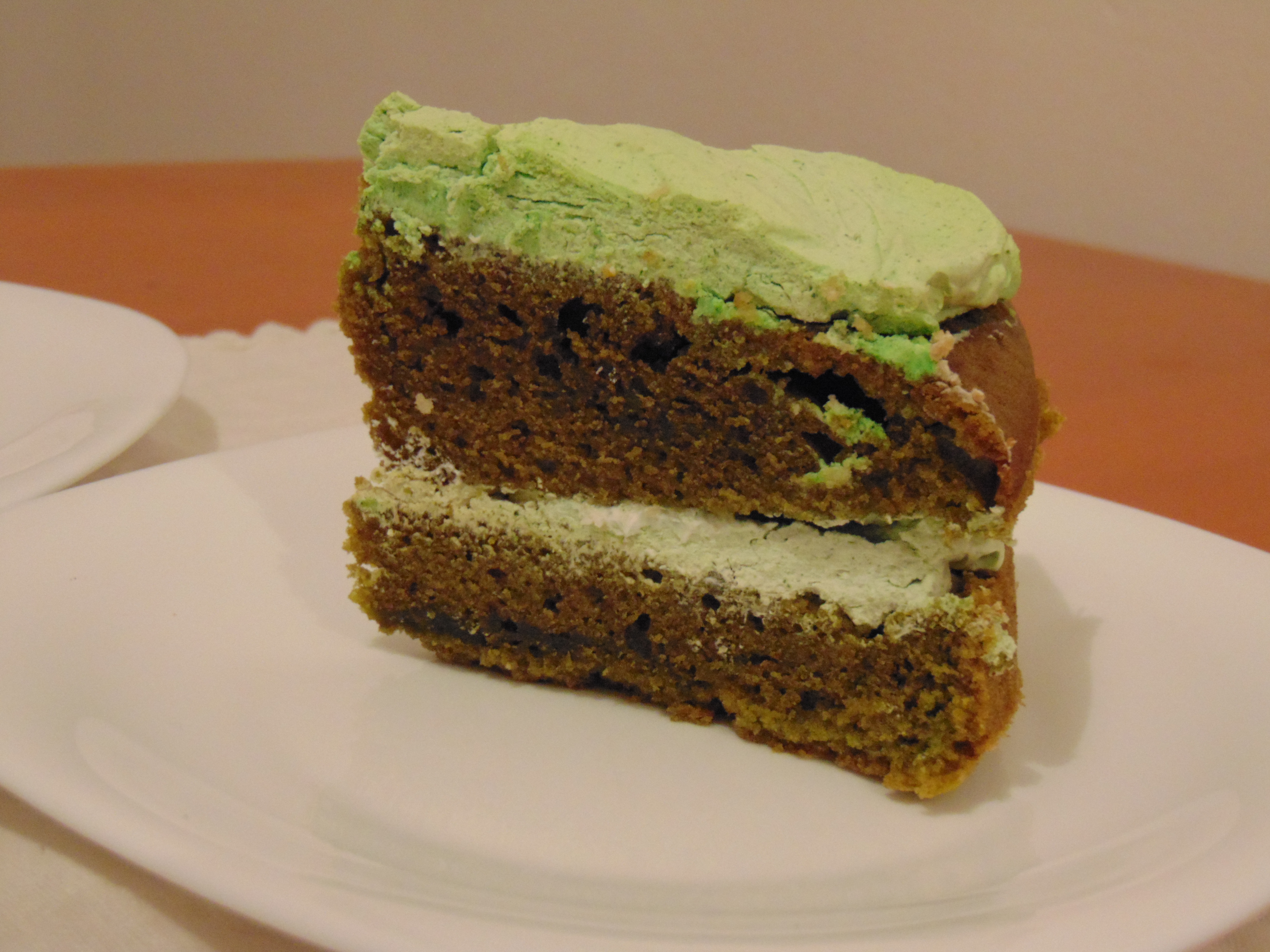 Matcha cake, two ways: finally onto the good, tea-based stuff! This cake always has a fantastic texture. The green icing is more appealing, of course.