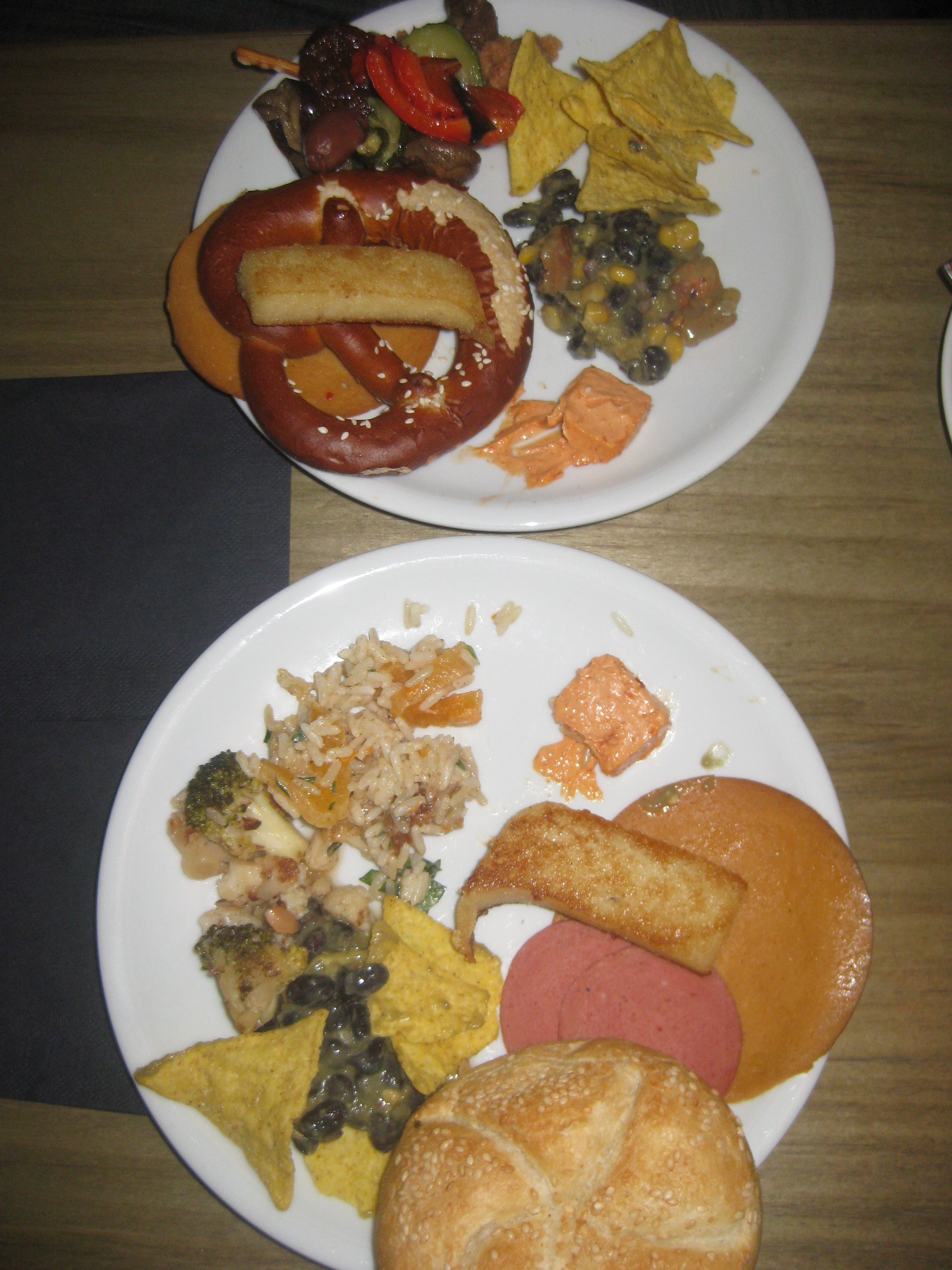 We moved on to a plate of cold savouries. There was a huge basket of bread, though Dr HH somehow managed to nab the last pretzel (or possibly the only pretzel – everything else was replenished regularly, but I never caught sight of another one of these). There were two kinds of cheese and two of salami, both of which were great, and some delicious creamy orange spread for the bread buns. Then a wide range of cold salad dishes and antipasti, the highlight being the nachos (though the crisps were a bit soggy from the dip, unfortunately).
